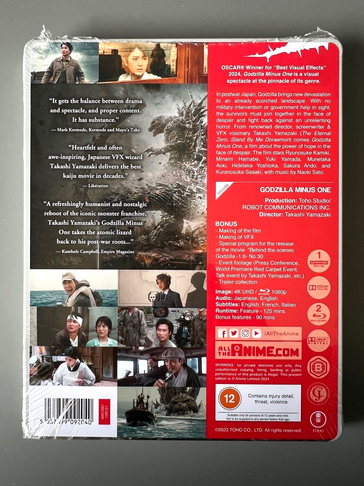 Welcome to EntertainDVD Are You A Movie Collector? You’ve Come To The Right Place! Let Us Build Your Movie Collection Check Out Our Items For Some Rare Items At Bargain Prices GODZILLA MINUS ONE on 4K Bluray LIMITED STEELBOOK EDITION BRAND NEW ABOUT THE MOVIE In postwar Japan, a new terror rises; Godzilla. Will the devastated people be able to survive... let alone fight back? Feeling as if he unfairly cheated death too many times, Shikishima, a surviving Kamikaze pilot is attacked on Odo Island along with many war plane engineers by a gargantuan monster. After the engineers die due to Shikishima failing to distract the monster, an overwhelming amount of guilt weighs on him, especially after a homeless woman and a baby move into his home when he returns. Shikishima, now on a personal mission, teams up with a large group of veterans to finally take down the monster known as Godzilla. Postage is FREE Australia Wide * Stock is shipped locally , so you can receive the item really quickly ***4K Bluray Disc Is Region Free, Regular Bluray is Region B*** 4K Bluray Movies Requires a 4K Bluray Compatible Player GENUINE UK RELEASE INTERNATIONAL CUSTOMERS WELCOME INTERNATIONAL CUSTOMERS ARE RESPONSIBLE FOR IMPORT DUTY FEES BUY WITH CONFIDENCE BROWSE OUR STORE FOR MORE EXCITING TITLES Satisfaction Is Guaranteed Experience FAST Shipping We Ship 6 Days A Week! Why buy from us? We have a 30-Day product replacement or money back refund policy * (See Return Policy below) We want you to be a happy customer who will come back and shop with us again and again Payment We prefer PayPal . So we can ship the item to you right away! Shipping We Use Australia Post For Shipping All items are shipped in quality tough bags and satchels Return Policy Customer satisfaction and service is our top priority In the unlikely event that you're not 100% satisfied with your purchase, please contact us within 14 days before returning your item Item returning must be in the same listed new and unopened condition Customer to pay return shipping cost Looking Forward to Provide You With Outstanding Service Please Add Us As One of Your Favorite Sellers Feel Free to Contact Us if You Have Any Questions We love to hear from YOU! Come Back Often as We Add New Listings Regularly! Thank-you for your visit! Have a Lovely Day
