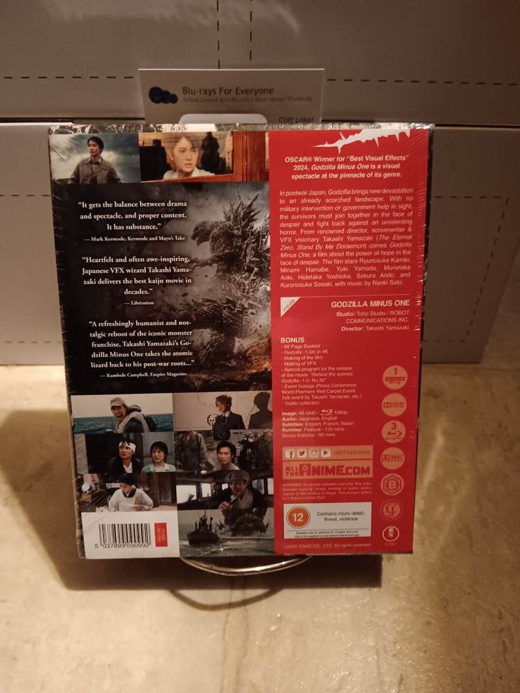 Absolutely thrilled with this Godzilla Minus One 4K Digipack! The picture quality is stunning, and the English audio track is crisp. Love the sleek DigiPack design—no dents or damage, and it arrived safely in a sturdy box. Bonus disc is a great addition, packed with extras. Region-free 4K and smooth subtitles make it a must-have for any Godzilla fan. Fast shipping too! Highly recommend!
