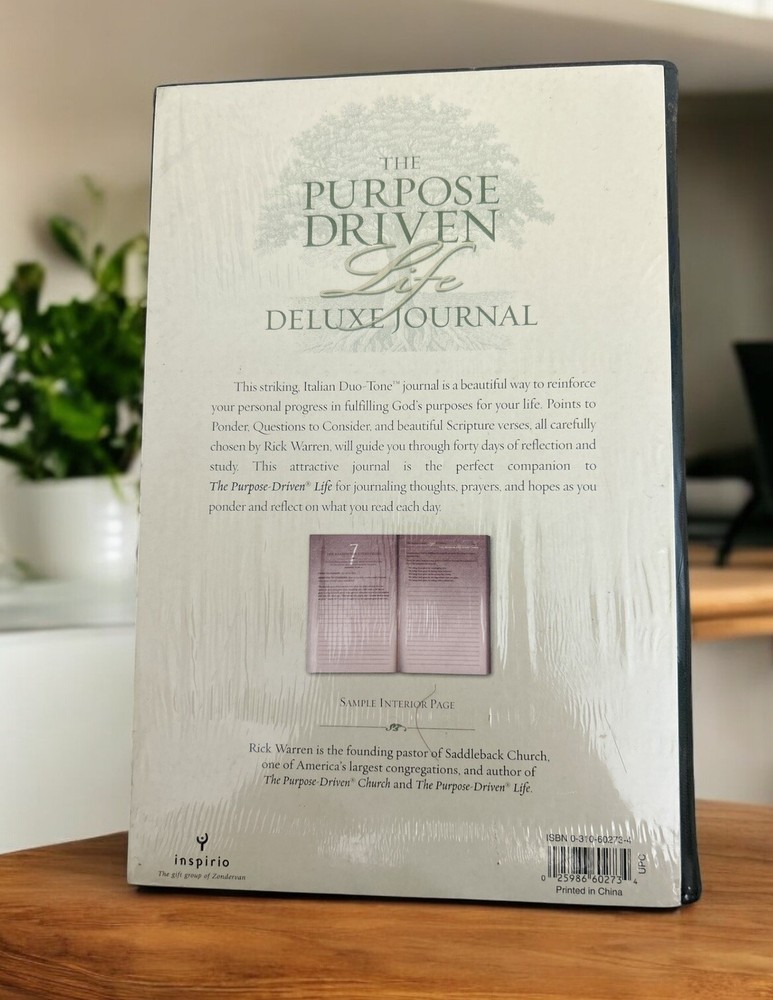NEW PURPOSE DRIVEN LIFE Deluxe Journal by Rick Warren Duo Tone Faux Leather Striking Italian Duo-Tone Journal. Points to ponder, Questions to consider & Beautiful Scripture Verses chosen by Rick Warren. Perfect for journaling thoughts, prayers & hopes as you ponder & reflect on what you read each day. Would make the perfect Christmas gift!! NEW IN SEALED PACKAGING