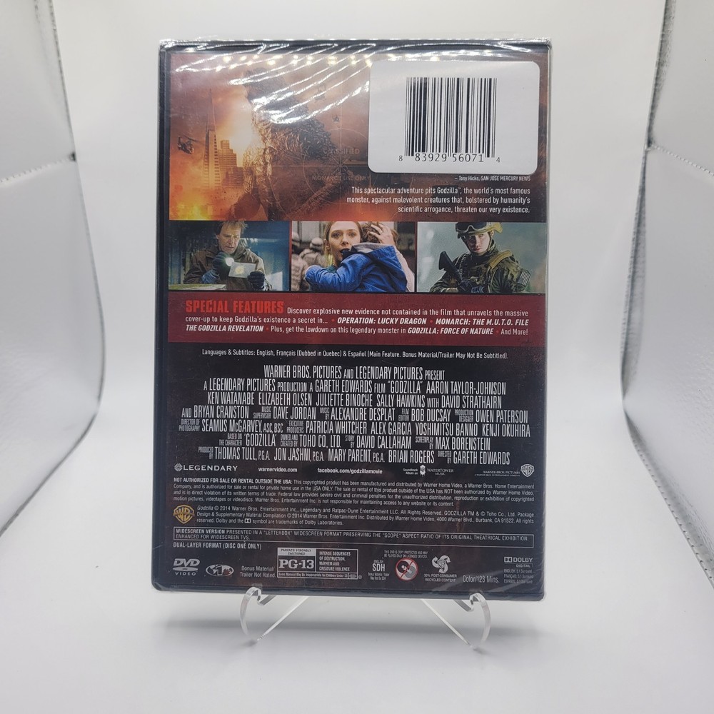 This brand new, sealed DVD of the 2014 horror-monster film "Godzilla" by director Gareth Edwards is a must-have for fans of the genre. With a rating of PG-13, a run time of 123 minutes, and available in English language, this DVD is perfect for a movie night at home. The DVD is in the format of a DVD and is compatible with DVD players. The studio that produced this film is Warner Home Video. The movie title is "Godzilla" and it falls under the categories of Movies & TV and DVDs & Blu-ray Discs.