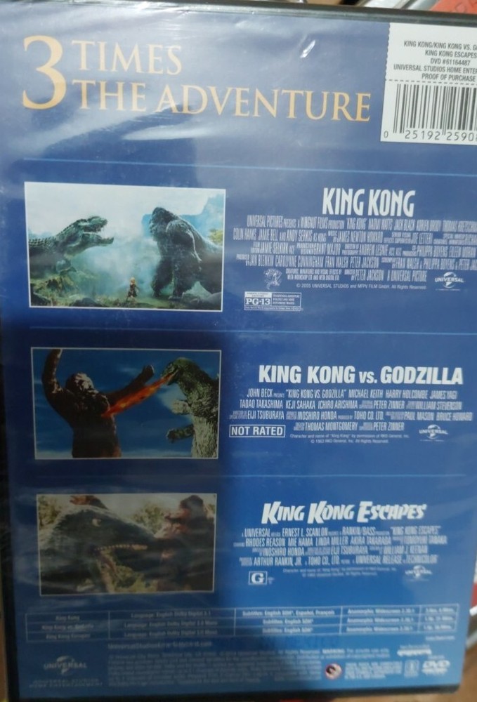 Experience the epic battle of the century with the King Kong Triple Feature DVD set. This brand new, sealed DVD set includes three classic films: King Kong, King Kong Escapes, and King Kong vs. Godzilla. Enjoy the action-packed adventure and thrilling plot with captivating performances from actors Andy Serkis, Jack Black, and Adrien Brody. With a wide range of features, including former rental, widescreen, and captioned options, this DVD set is perfect for any movie lover. The set also includes special subtitles for the King Kong film in English SDH, French, and Spanish. Get ready to be captivated by the cinematic movement of B-Movie and Cult as seen through the lens of directors Inoshiro Honda and Peter Jackson. Don't miss out on this must-see movie DVD set.