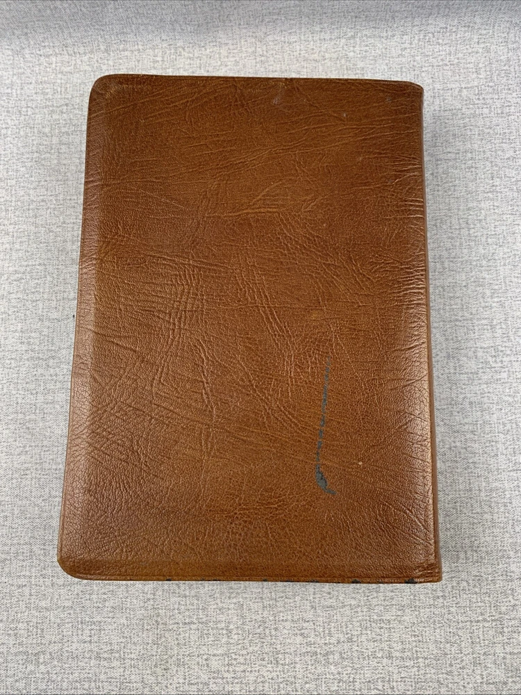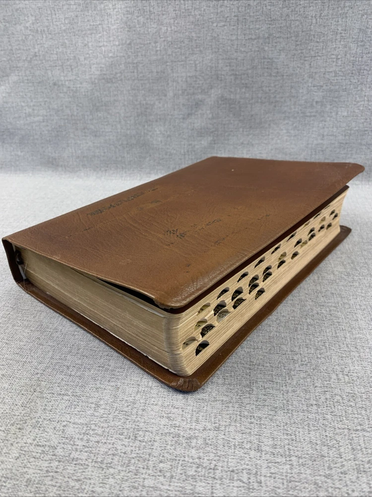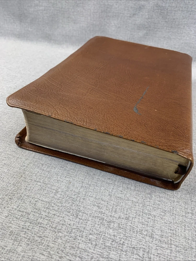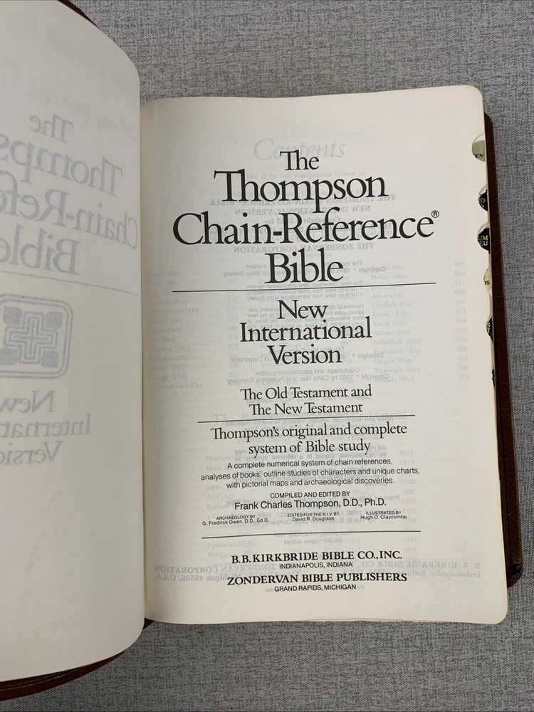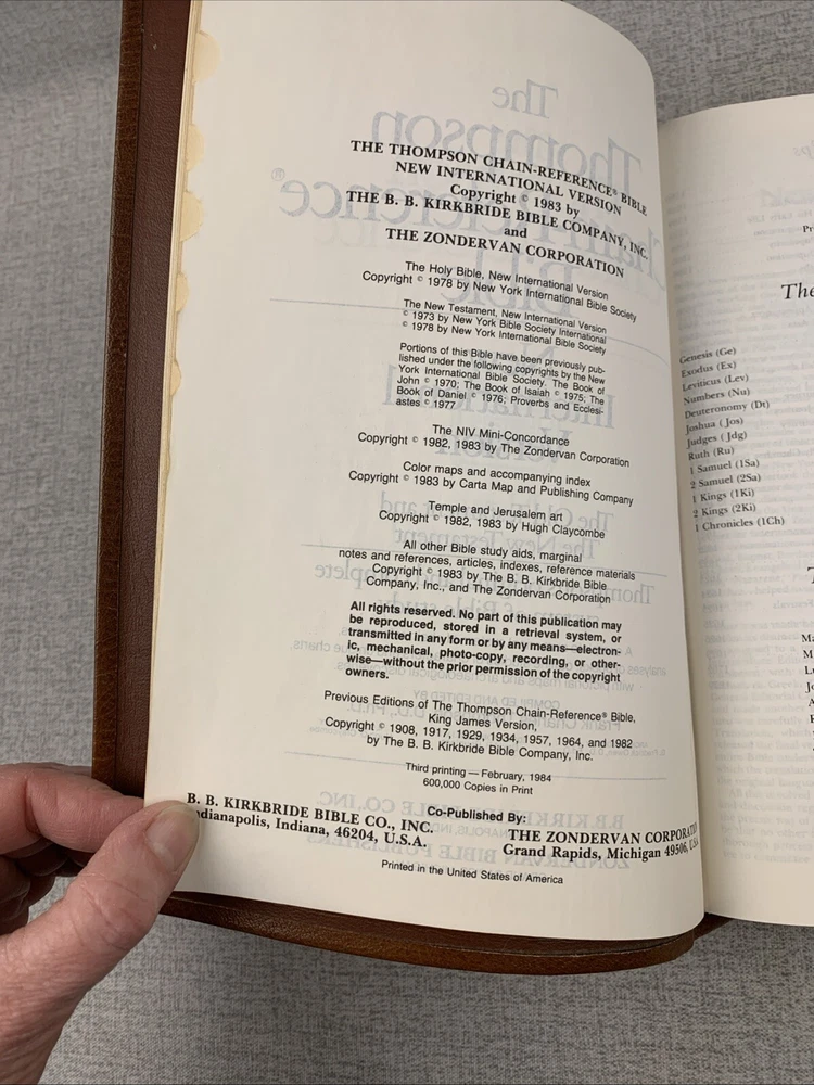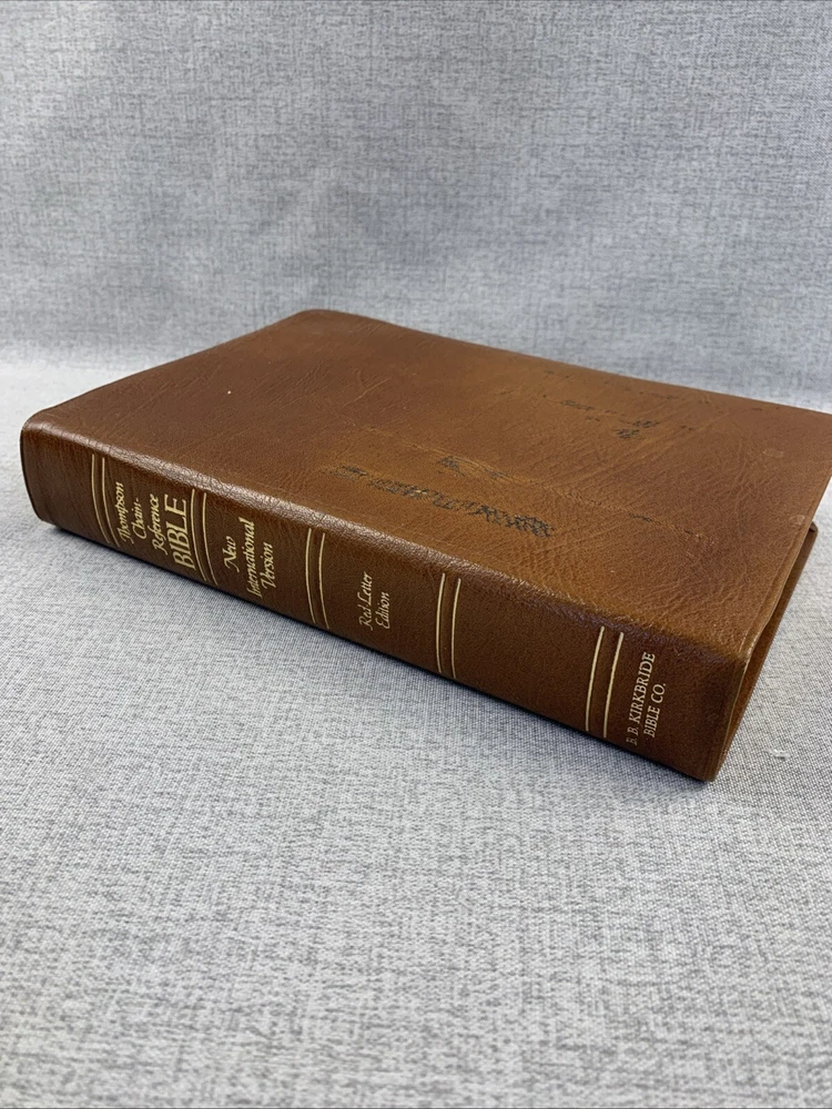 NIV 1984 Thompson Chain Reference Bible Red Letter Top Grain Leather Thumb Index This NIV Bible is the much desired 1984 edition. The former owner loved his Bible well and highlighted and marked meaningful texts elaborately. Dimensions: 9 7/8" x 7" x 1 3/4" NOTE: Excessive amounts of highlighting and marking of text present in this Bible. Brown top grain calf leather covers have held up well to the well loved use the former owner gave this Bible. Note wear to cover under edges (see photo #3 & 4) There is edge wear to the cover corners and edges and some marks to cover surface. Binding is good and there are no loose pages. Still lots of life left in this Bible.