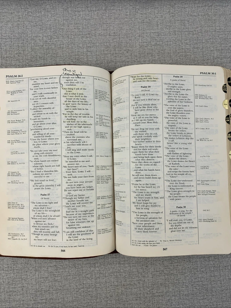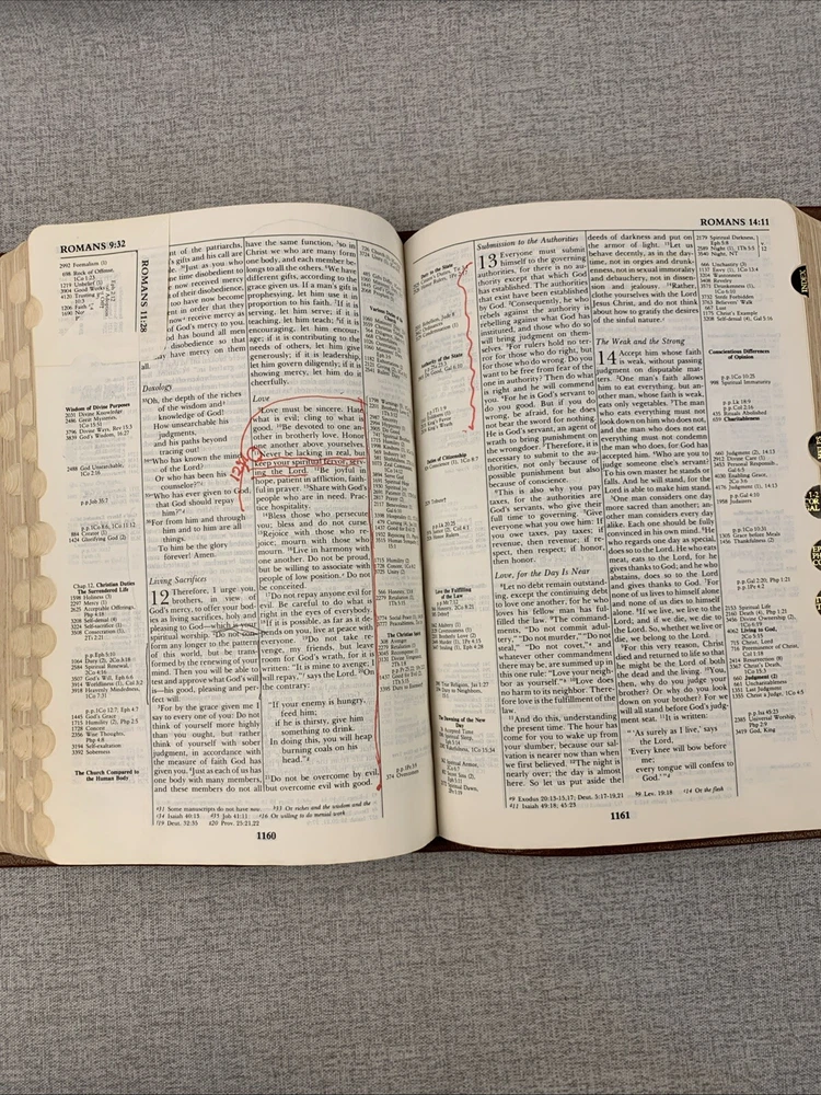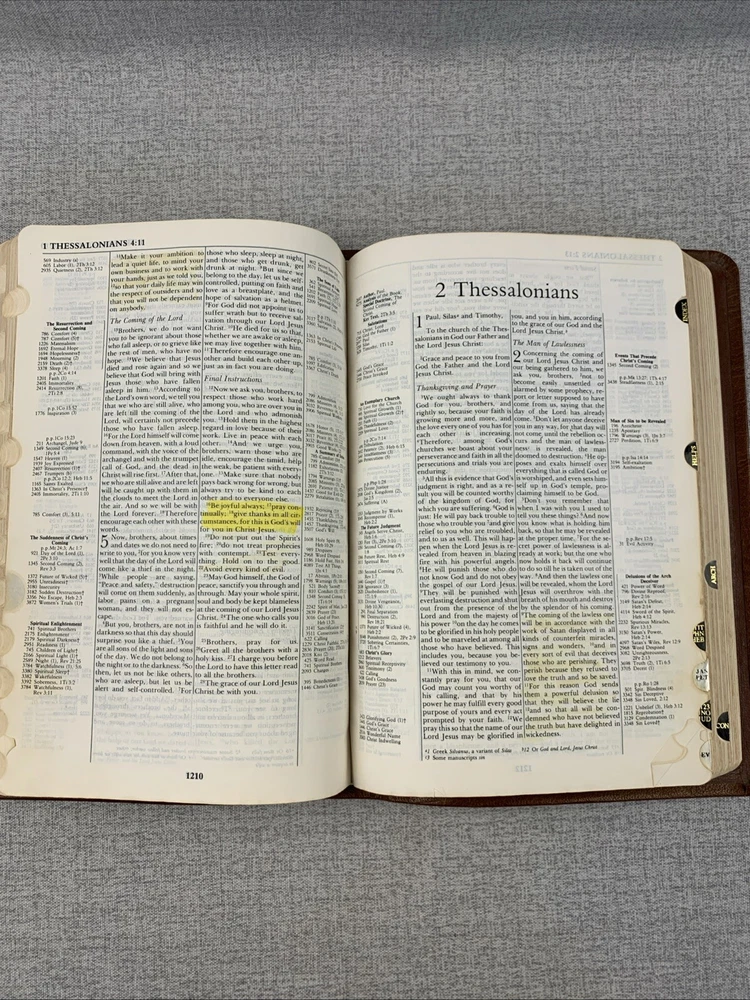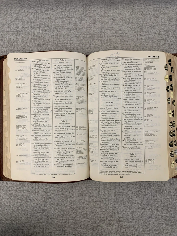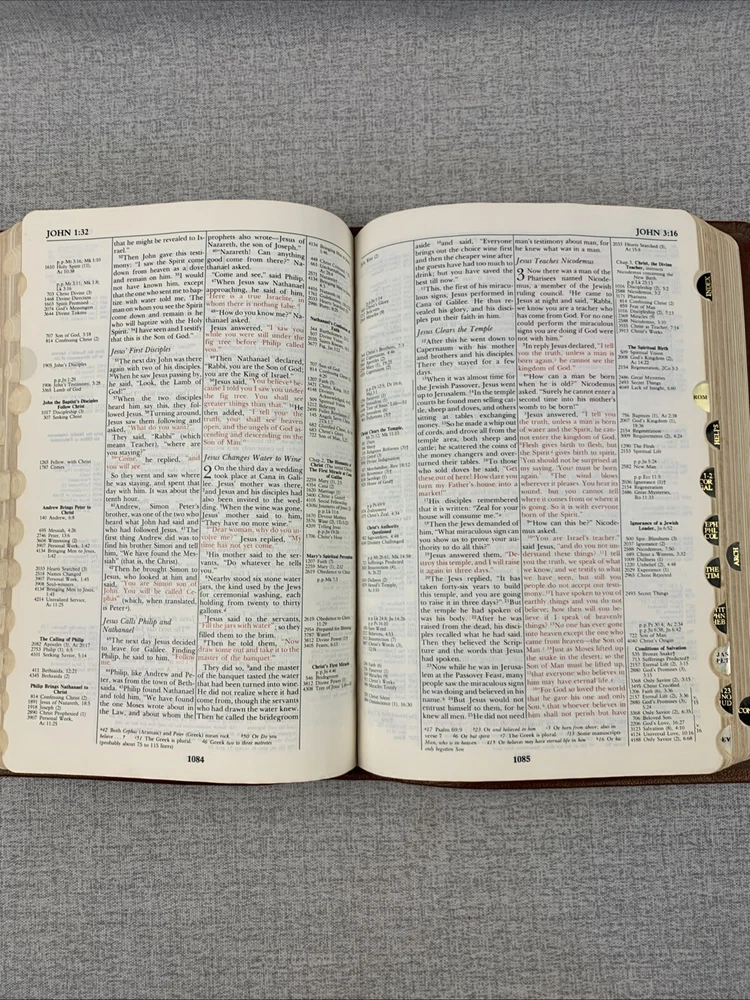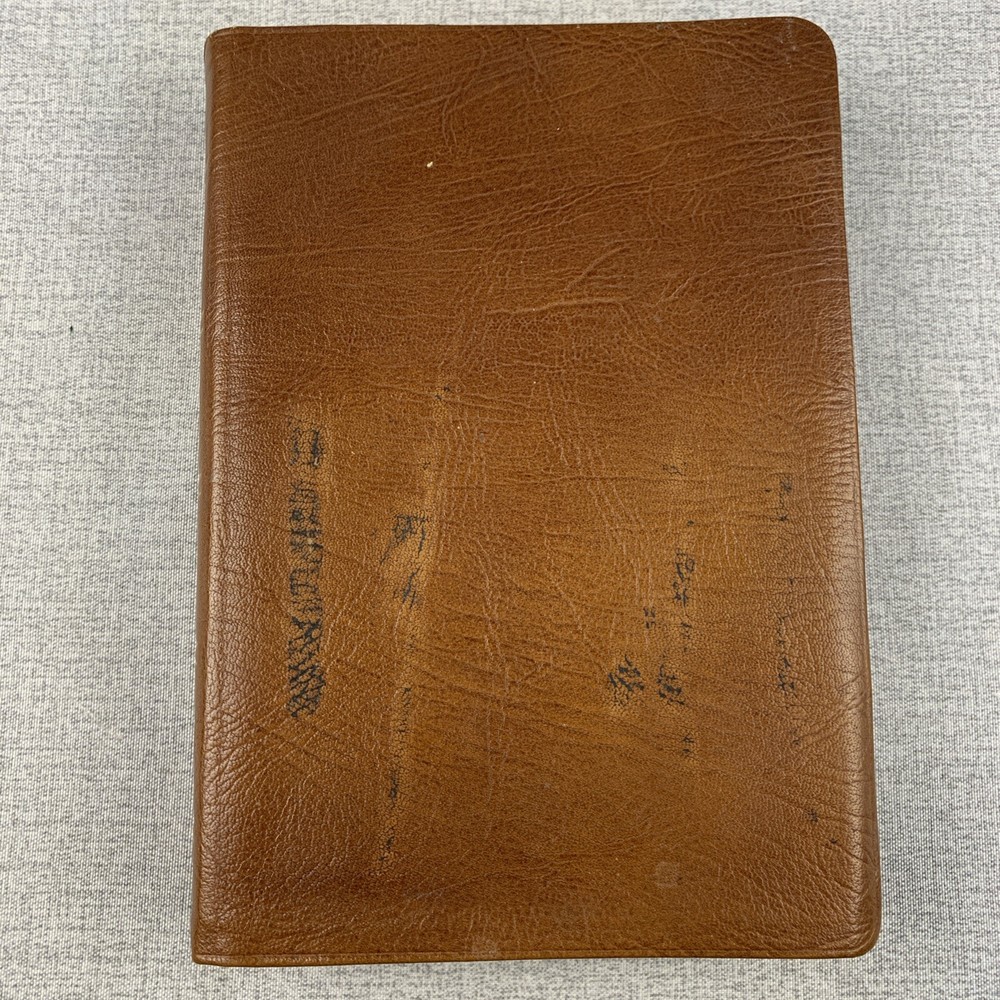 NIV 1984 Thompson Chain Reference Bible Red Letter Top Grain Leather Thumb Index This NIV Bible is the much desired 1984 edition. The former owner loved his Bible well and highlighted and marked meaningful texts elaborately. Dimensions: 9 7/8" x 7" x 1 3/4" NOTE: Excessive amounts of highlighting and marking of text present in this Bible. Brown top grain calf leather covers have held up well to the well loved use the former owner gave this Bible. Note wear to cover under edges (see photo #3 & 4) There is edge wear to the cover corners and edges and some marks to cover surface. Binding is good and there are no loose pages. Still lots of life left in this Bible.