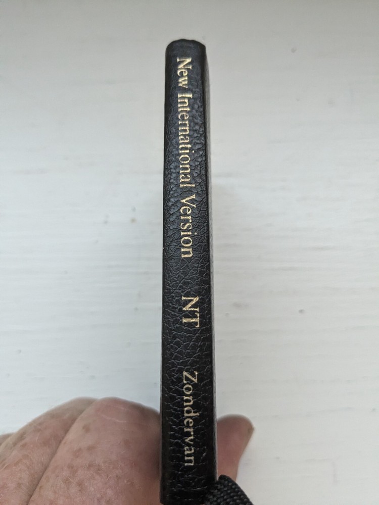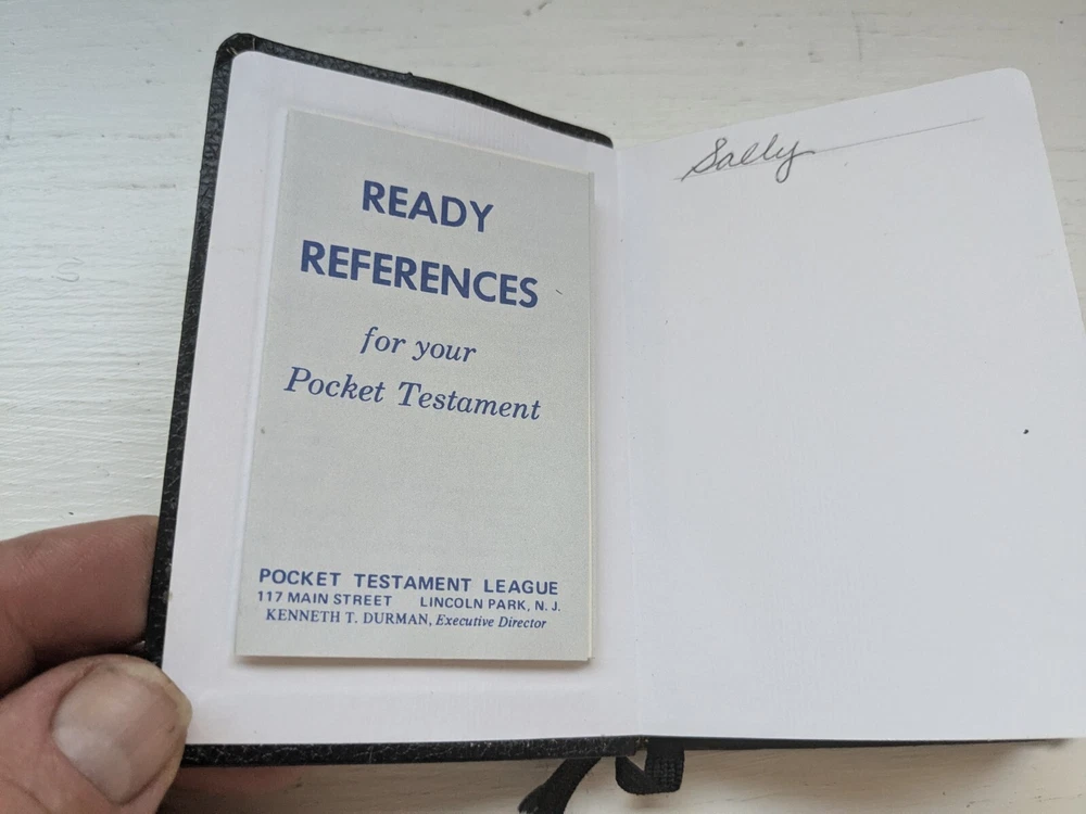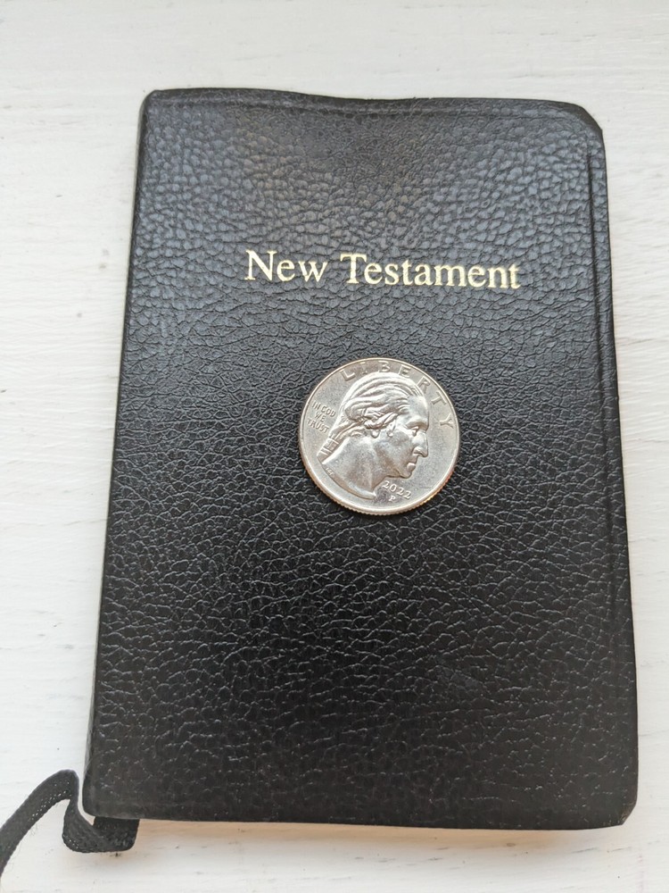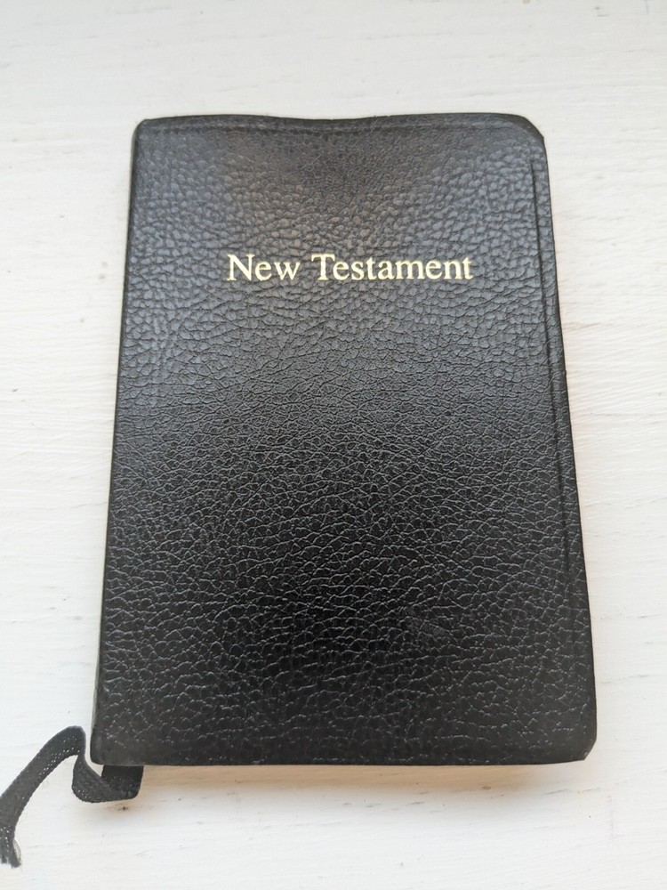 This new testament measures 3 in. X 4 and 1/2 in. Nice looking black imitation leather covers. Flipping through I see about 40 pages that contains versus with yellow highlighting and also previous owner's name in front