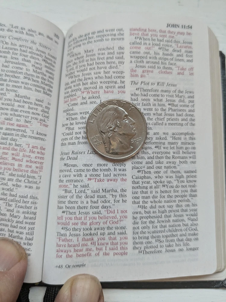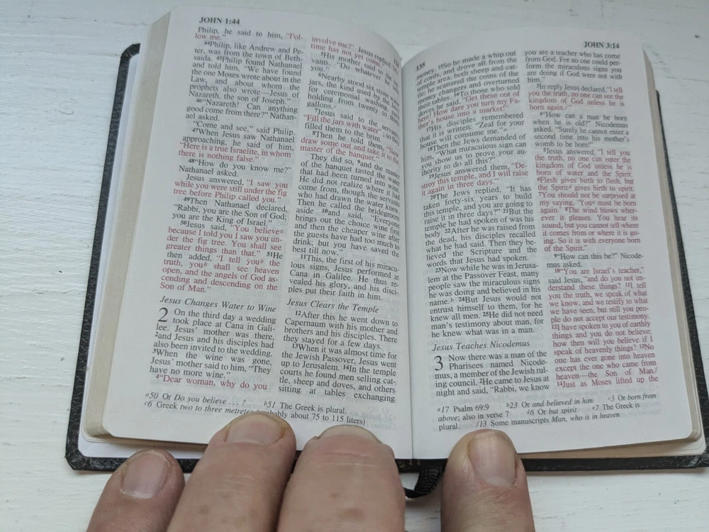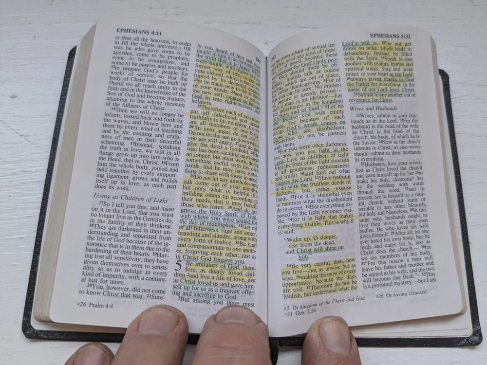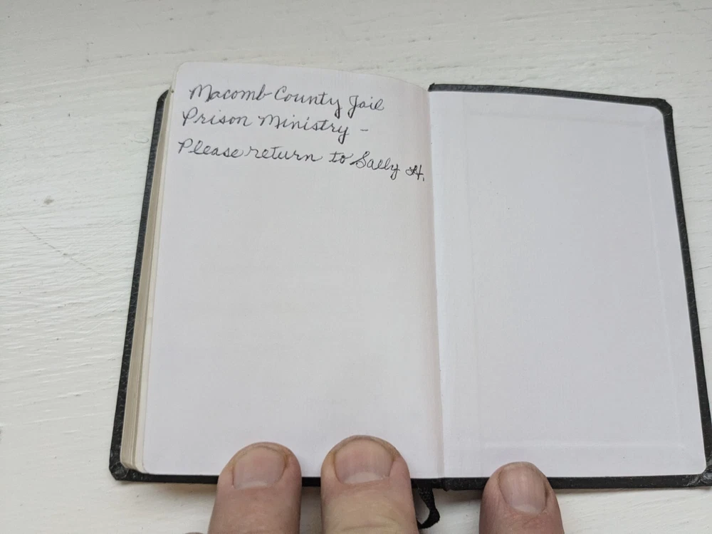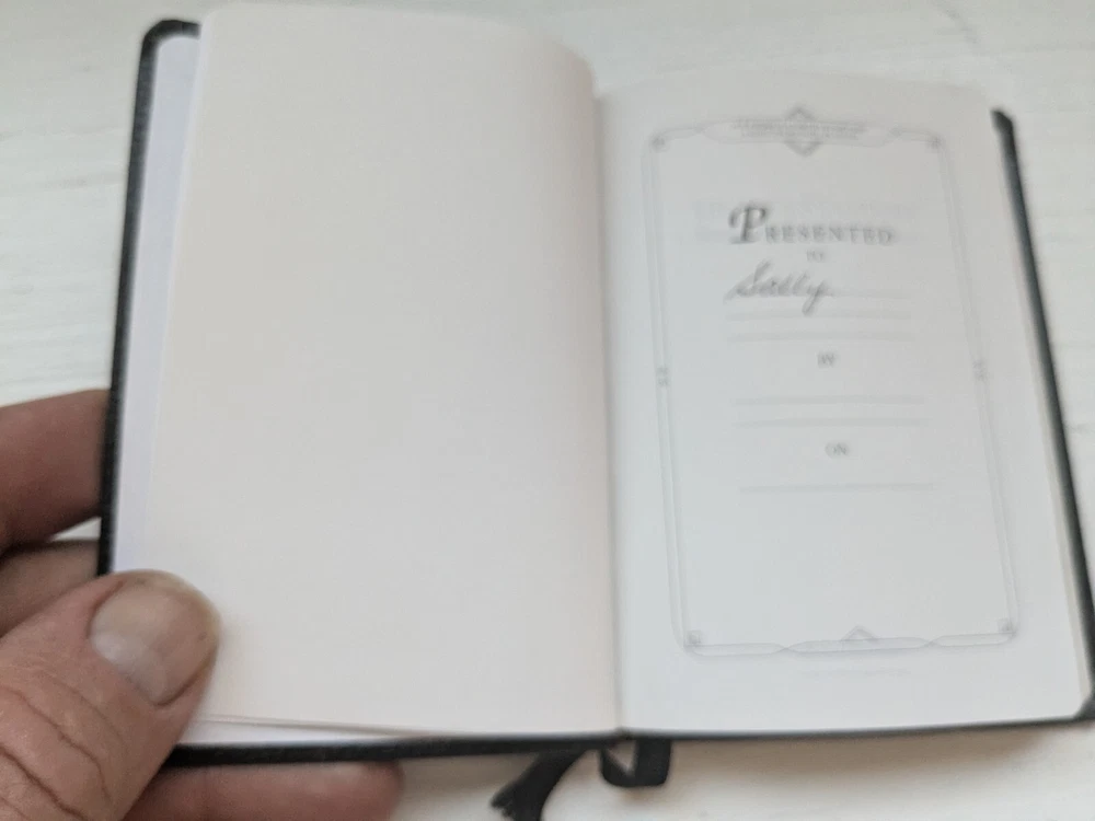 This new testament measures 3 in. X 4 and 1/2 in. Nice looking black imitation leather covers. Flipping through I see about 40 pages that contains versus with yellow highlighting and also previous owner's name in front
