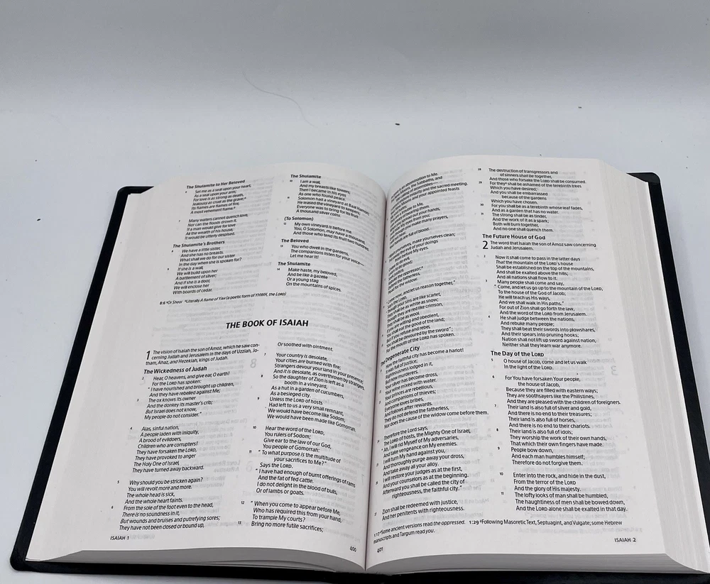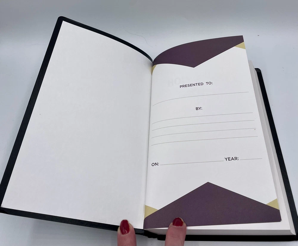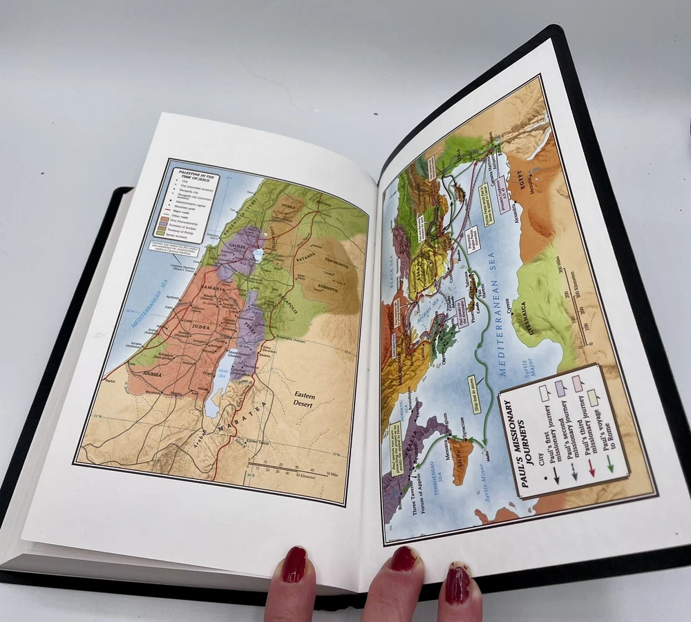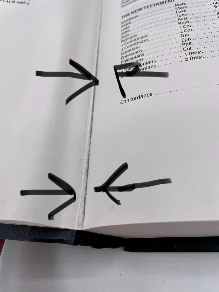 This Bible has no writing The corners and edges have bending The corners top of spine has some bending The first pages have slight separation from binding, the pages are not loose , they are still attached The slip cover has scratches and scuffs , bending of corners ( see pics ) Carefully review all pics for condition Sold as is all questions welcome