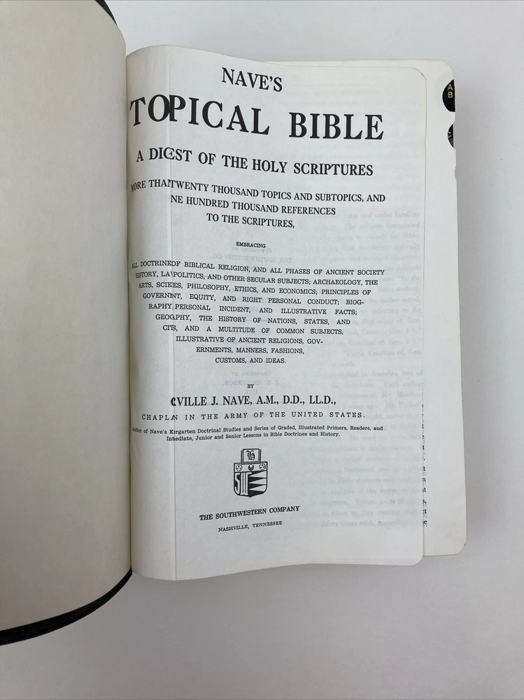 Nave’s Topical Bible : A Digest of the Holy Scriptures, Thumb Indexed, Faux Leather, Gilt, Southwestern GOOD CONDITION -- CLEAN COPY/NO MARKINGS ON THE INSIDE (see pics) *Item will be protected well for shipping and comes with a tracking number for confirmation.* I ship out items every day so expect a quick delivery!