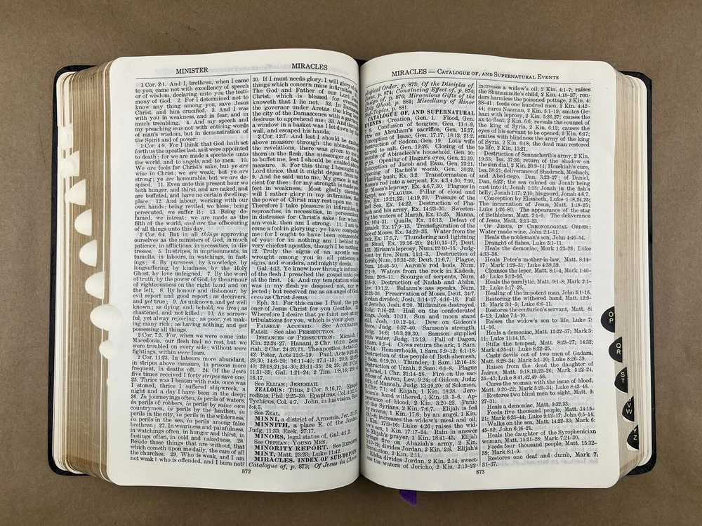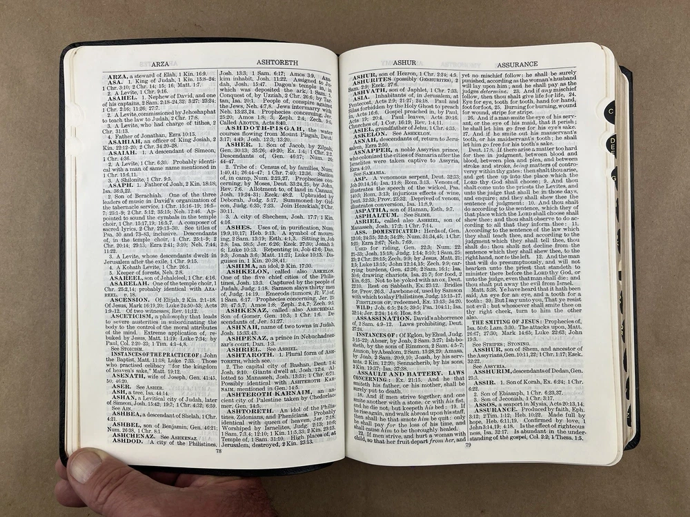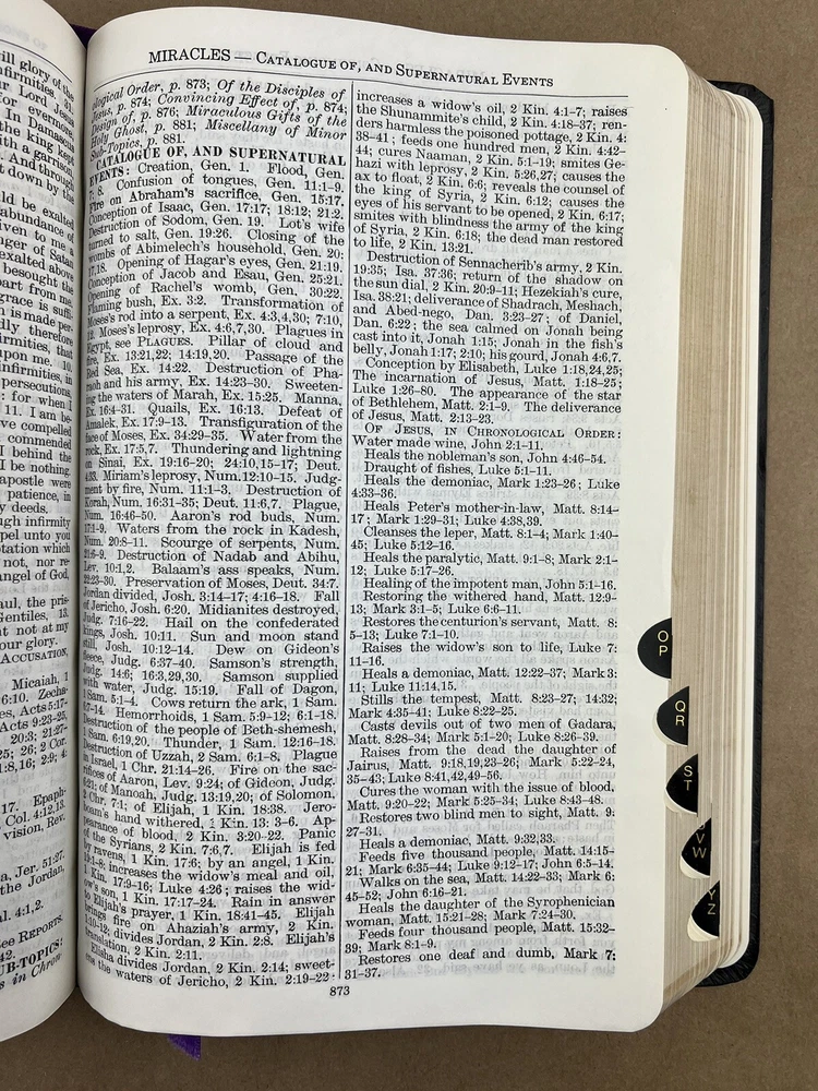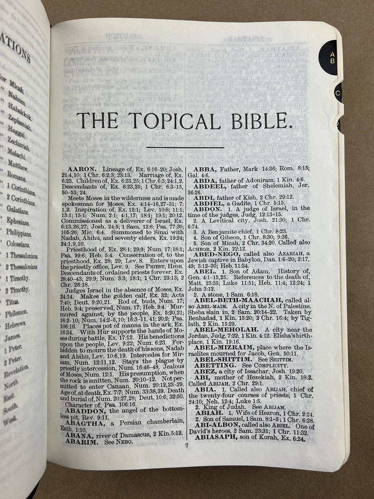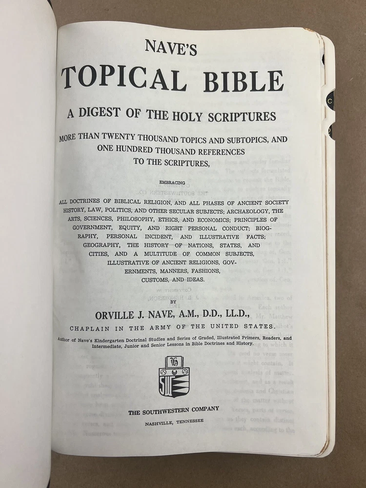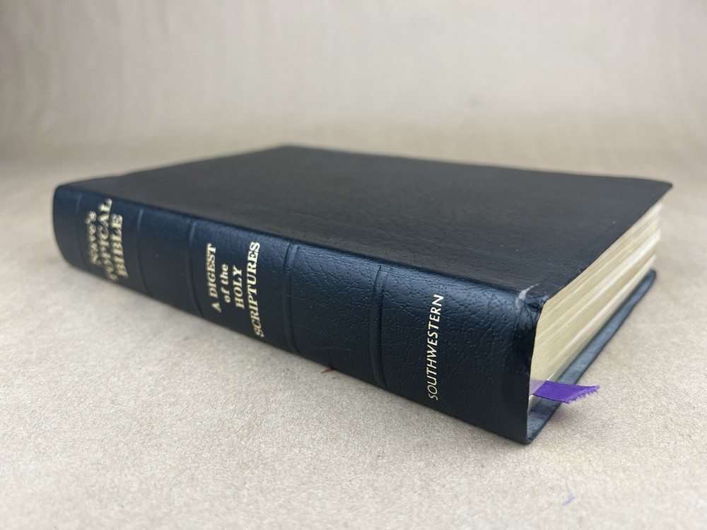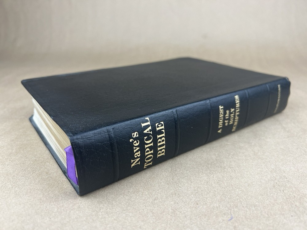 Naves Topical Bible: A Digest of the Holy Scriptures; More Than Twenty Thousand Topics and Subtopics, and One Hundred Thousand References to the Scriptures Orville J. Nave The Southwestern Company, 1962 Faux bonded leather cover in Very Good condition. Very little to no edge/shelf wear. Previously owned but seemingly seldom read. Tight and square bindings, bright cover, and no writing inside. Nice reading copy. Review pictures for condition. Please ask any questions before purchase.
