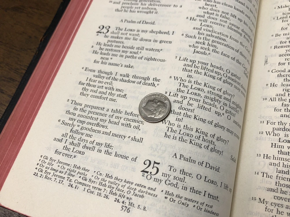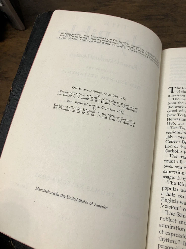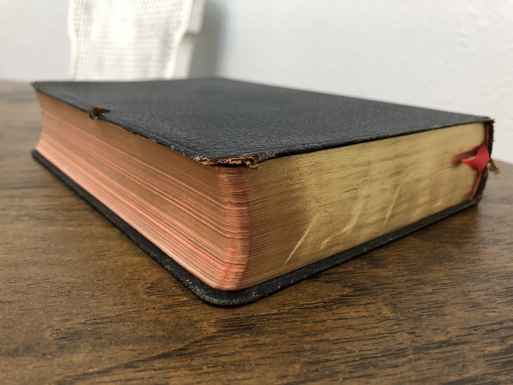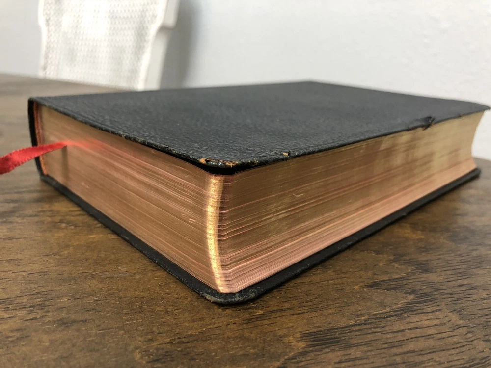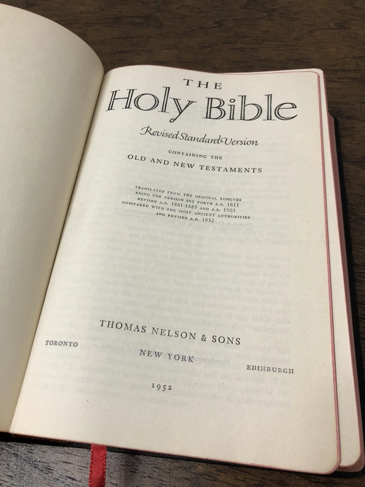 Nelson RSV Revised Standard Version Bible Genuine Leather 3807 Text Edition This is a gently read (if at all) RSV text edition in genuine leather with gilt page edges in excellent condition. This is the classic text edition with opaque paper, clear typeface, and a very pleasant reading experience. The leather is flexible and in poor condition. There are rather consistent abrasions to the edges and the corners. A corner is even “broken” off. It’s bizarre, because the gilding, aside from some obvious fingernail scratches at the top, is in unused condition. The dyed art-gilt is flawless. It doesn’t have any signs of usage, though it was clearly stored in an improper place since the leather has deteriorated. This is a classic RSV text, but rarely found without any writing at all. Since there is no writing anywhere in the text that I could find, this would make a great Bible for use or rebind. It was gently and carefully used, from what I can tell. Sewn Black letter Double column Text edition Gilded page edges 8.5 x 5.75 x 1.5 inches Dime used for comparison Note: I do not accept returns unless the item was not as I described because of a mistake I made. If the item is smaller than you thought it would be (because you didn’t read the description with dimensions), that’s on you. I do not cancel orders for any reason, even if you accidentally ordered it. It takes about 3 steps to purchase an item, so if you paid for it, it’s yours. I make these annoying rules because so many customers have recently treated the purchase of items flippantly and I have to draw a line somewhere. Well, here it is. I always list any writing, stains, tears, or imperfection of any kind. And I always list the condition conservatively, so you should expect the item to be in better condition than listed. Unlike the vast majority of sellers out there, I refuse to hide imperfections through cleverly taken pictures or obscure descriptions. I try to include as many pictures as necessary to highlight the imperfections rather than the beauty of the items, which is part of why I have an elevated Seller Status and perfect feedback in which many consistently report back “just as described” or “better than described.” If I miss something by accident, please contact me so I can make it right. My flawless feedback should speak for itself, but you won’t be disappointed! Thank you for your business and God bless!