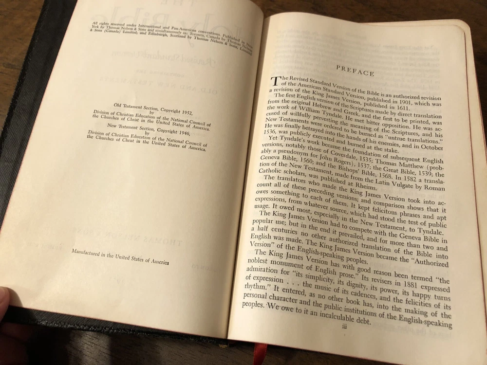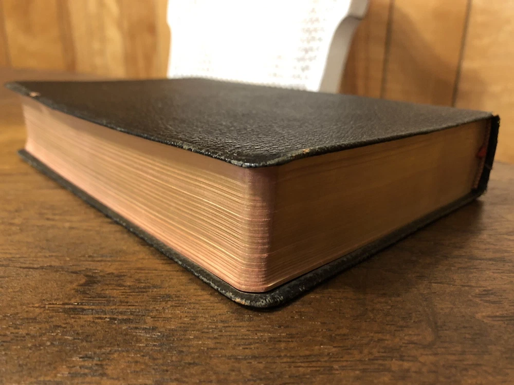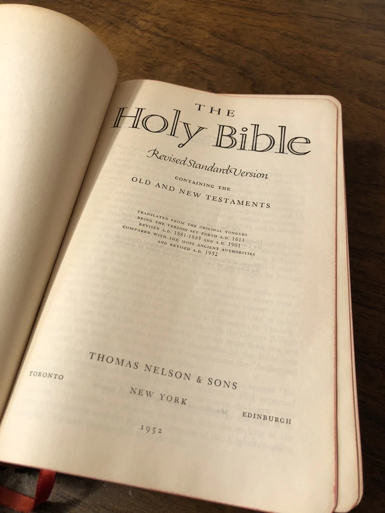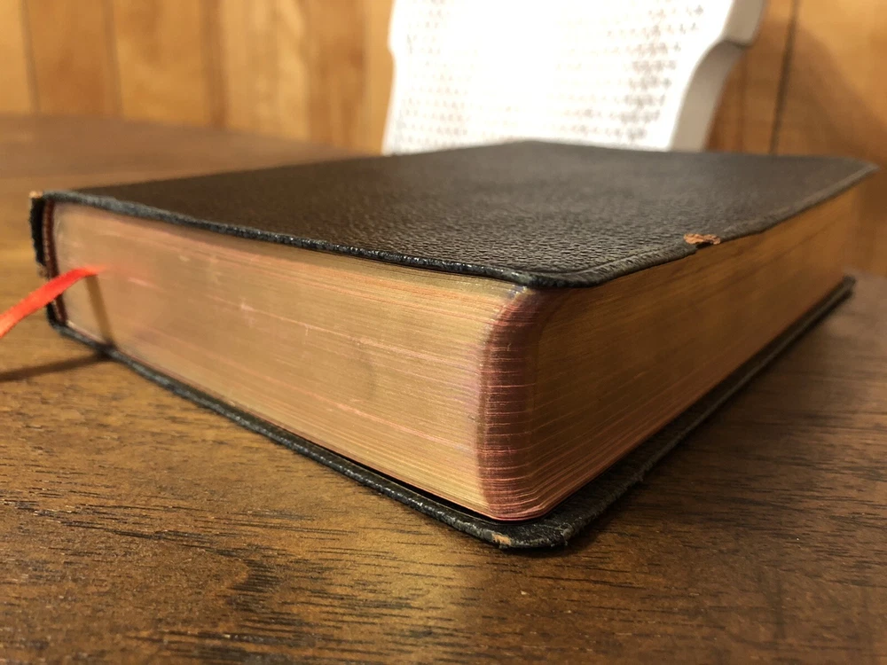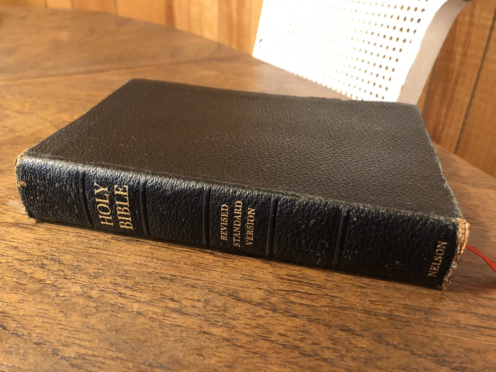 Nelson RSV Revised Standard Version Bible Genuine Leather 3807 Text Edition This is a gently read (if at all) RSV text edition in genuine leather with gilt page edges in excellent condition. This is the classic text edition with opaque paper, clear typeface, and a very pleasant reading experience. The leather is flexible and in poor condition. There are rather consistent abrasions to the edges and the corners. A piece of the edge is even “broken” off. It’s bizarre, because the gilding, aside from some obvious fingernail scratches at the top, is in unused condition. The dyed art-gilt is flawless. It doesn’t have any signs of usage, though it was clearly stored in an improper place since the leather has deteriorated. This is a classic RSV text, but rarely found without any writing at all. Since there is no writing anywhere in the text that I could find, this would make a great Bible for use or rebind. It has two slightly exposed signatures, but that’s easily fixed with some flexible glue or will be fixed with any decent rebinder. It was gently and carefully used, from what I can tell. Sewn Black letter Double column Text edition Gilded page edges 8.5 x 5.75 x 1.5 inches Dime used for comparison Note: I do not accept returns unless the item was not as I described because of a mistake I made. If the item is smaller than you thought it would be (because you didn’t read the description with dimensions), that’s on you. I do not cancel orders for any reason, even if you accidentally ordered it. It takes about 3 steps to purchase an item, so if you paid for it, it’s yours. I make these annoying rules because so many customers have recently treated the purchase of items flippantly and I have to draw a line somewhere. Well, here it is. I always list any writing, stains, tears, or imperfection of any kind. And I always list the condition conservatively, so you should expect the item to be in better condition than listed. Unlike the vast majority of sellers out there, I refuse to hide imperfections through cleverly taken pictures or obscure descriptions. I try to include as many pictures as necessary to highlight the imperfections rather than the beauty of the items, which is part of why I have an elevated Seller Status and perfect feedback in which many consistently report back “just as described” or “better than described.” If I miss something by accident, please contact me so I can make it right. My flawless feedback should speak for itself, but you won’t be disappointed! Thank you for your business and God bless!