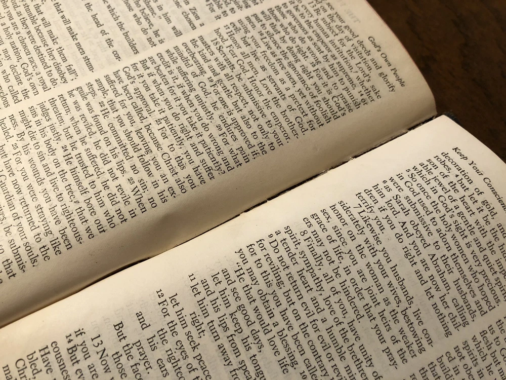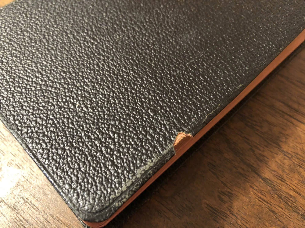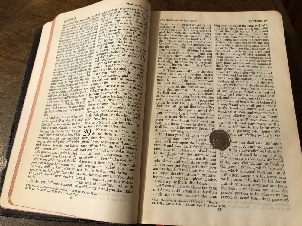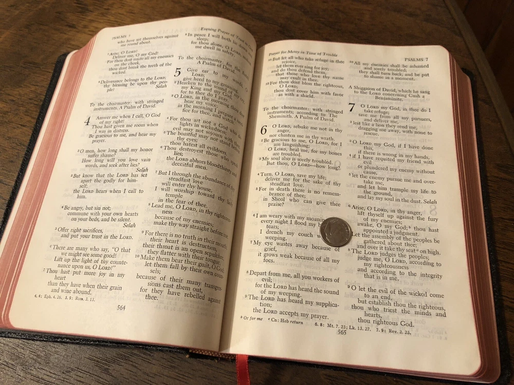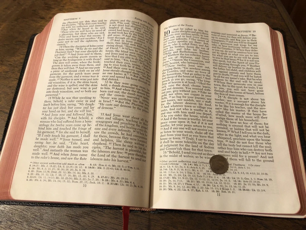 Nelson RSV Revised Standard Version Bible Genuine Leather 3807 Text Edition This is a gently read (if at all) RSV text edition in genuine leather with gilt page edges in excellent condition. This is the classic text edition with opaque paper, clear typeface, and a very pleasant reading experience. The leather is flexible and in poor condition. There are rather consistent abrasions to the edges and the corners. A piece of the edge is even “broken” off. It’s bizarre, because the gilding, aside from some obvious fingernail scratches at the top, is in unused condition. The dyed art-gilt is flawless. It doesn’t have any signs of usage, though it was clearly stored in an improper place since the leather has deteriorated. This is a classic RSV text, but rarely found without any writing at all. Since there is no writing anywhere in the text that I could find, this would make a great Bible for use or rebind. It has two slightly exposed signatures, but that’s easily fixed with some flexible glue or will be fixed with any decent rebinder. It was gently and carefully used, from what I can tell. Sewn Black letter Double column Text edition Gilded page edges 8.5 x 5.75 x 1.5 inches Dime used for comparison Note: I do not accept returns unless the item was not as I described because of a mistake I made. If the item is smaller than you thought it would be (because you didn’t read the description with dimensions), that’s on you. I do not cancel orders for any reason, even if you accidentally ordered it. It takes about 3 steps to purchase an item, so if you paid for it, it’s yours. I make these annoying rules because so many customers have recently treated the purchase of items flippantly and I have to draw a line somewhere. Well, here it is. I always list any writing, stains, tears, or imperfection of any kind. And I always list the condition conservatively, so you should expect the item to be in better condition than listed. Unlike the vast majority of sellers out there, I refuse to hide imperfections through cleverly taken pictures or obscure descriptions. I try to include as many pictures as necessary to highlight the imperfections rather than the beauty of the items, which is part of why I have an elevated Seller Status and perfect feedback in which many consistently report back “just as described” or “better than described.” If I miss something by accident, please contact me so I can make it right. My flawless feedback should speak for itself, but you won’t be disappointed! Thank you for your business and God bless!