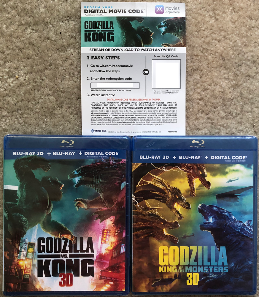 Before buying this movie from other sellers please ask them which one you're getting. If they can't answer then their source is questionable. You're bidding on the rare authentic first printing of U.S. release of Godzilla vs Kong 3D Blu-ray + Blu-ray and first printing of U.S. release of Godzilla King of Monsters 3D Blu-ray + Blu-ray . The digital copy that came with this 3D Blu-ray expired on 6/30/2022 as pictured . You may be able to get a new digital code by contacting Warner Brothers but I can't guarantee how it would go. This is the real U.S. official release not some foreign import or bootleg BD-R (Blu-ray recordable) copy other sellers are selling. Don't take a chance buying from other sellers who have lots of negative feedbacks from selling bootleg copies. The pictures are to show that I have both versions, this auction is for the one on the left in both pictures. The first buyer will receive a bonus 4K digital copy for Godzilla vs Kong. I pulled this code from the 4K Blu-ray I purchased last year, and that set is out of print so there is no way you can buy it anymore. As I mentioned the digital code that came with the 3D Blu-ray set have expired, and this is the only way you can get the digital copy for Godzilla vs Kong. Friendly warning to fraudulent buyers: Do not try to file a case of "Item was not as described" to eBay in an attempt to rip me off. Do it to other sellers if you'd like. But if other sellers reported you and too many have been filed against you, eBay will shut down your account. I operate honest business. Some of these disputes have gotten absurd. They range from empty case (in a sealed Blu-ray???) to damages to the slipcover. I make no claim on condition of the box or slipcover. If you're a perfectionist collector it's your responsibility to ask, NOT ASSUME! I will tell you what my inventory stock looks like. Most stores use security devices which could cause damage on slipcover. If you buy from Target stores you already know. Another buyer complained about how Target stores the bonus item. That is not my problem!!! This is how I received the item from the store. I cannot tell Target how they should include the bonus disc. These examples are totally beyond my control. A sealed movie with disc missing is not going to work if you're just trying to get another sealed copy from me. I keep all the receipt from post office which includes weight. You're going to have a lot of trouble explaining why the package got 3 ounces lighter after it left my post office. If there is a problem with the disc in a sealed movie, update your Blu-ray player firmware or contact the manufacturer for replacement. These are not valid case of "Item was not as described". Disclaimer: Insurance not included. I only sell top quality item as the positive feedbacks showed. 99% of the package arrived safely without any issue. If you fear about that 1% please ask for insurance on top of the item. If you skip insurance I will not be responsible for post office's fault. International buyers: I found out eBay's shipping program is a lot more expensive. If something cost $18 to ship via international first class, it will cost over $40 with eBay's shipping program because it's going to be sent via expensive FedEx. To save you money I've opted out of eBay shipping program and I will ship everything via post office. However, international package from post office can only be tracked within U.S.. Once it gets out of U.S. there will not be tracking info. I will not be held responsible once the package is on route for delivery. If you still want eBay's shipping program, please let me know before you bid and I can make a change.