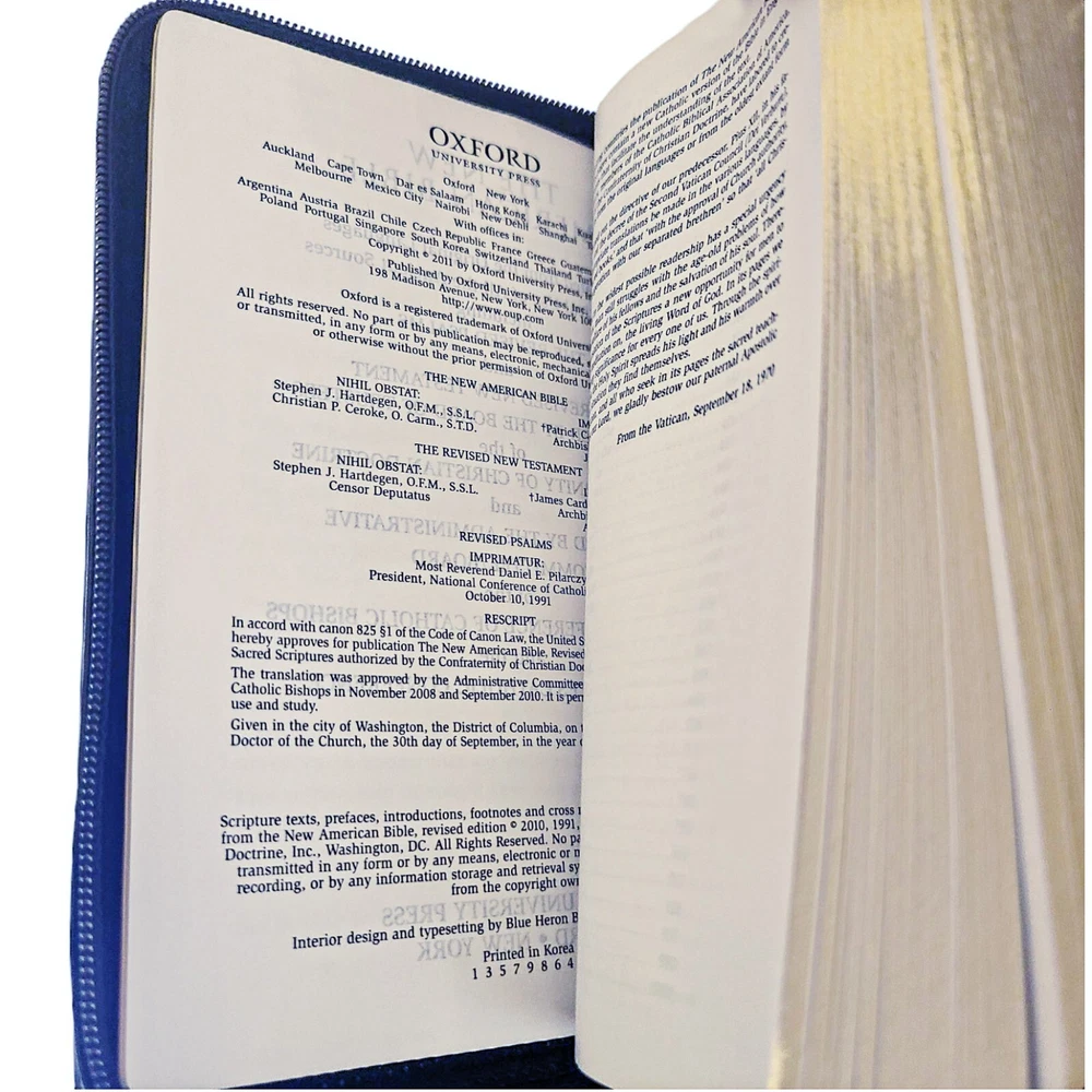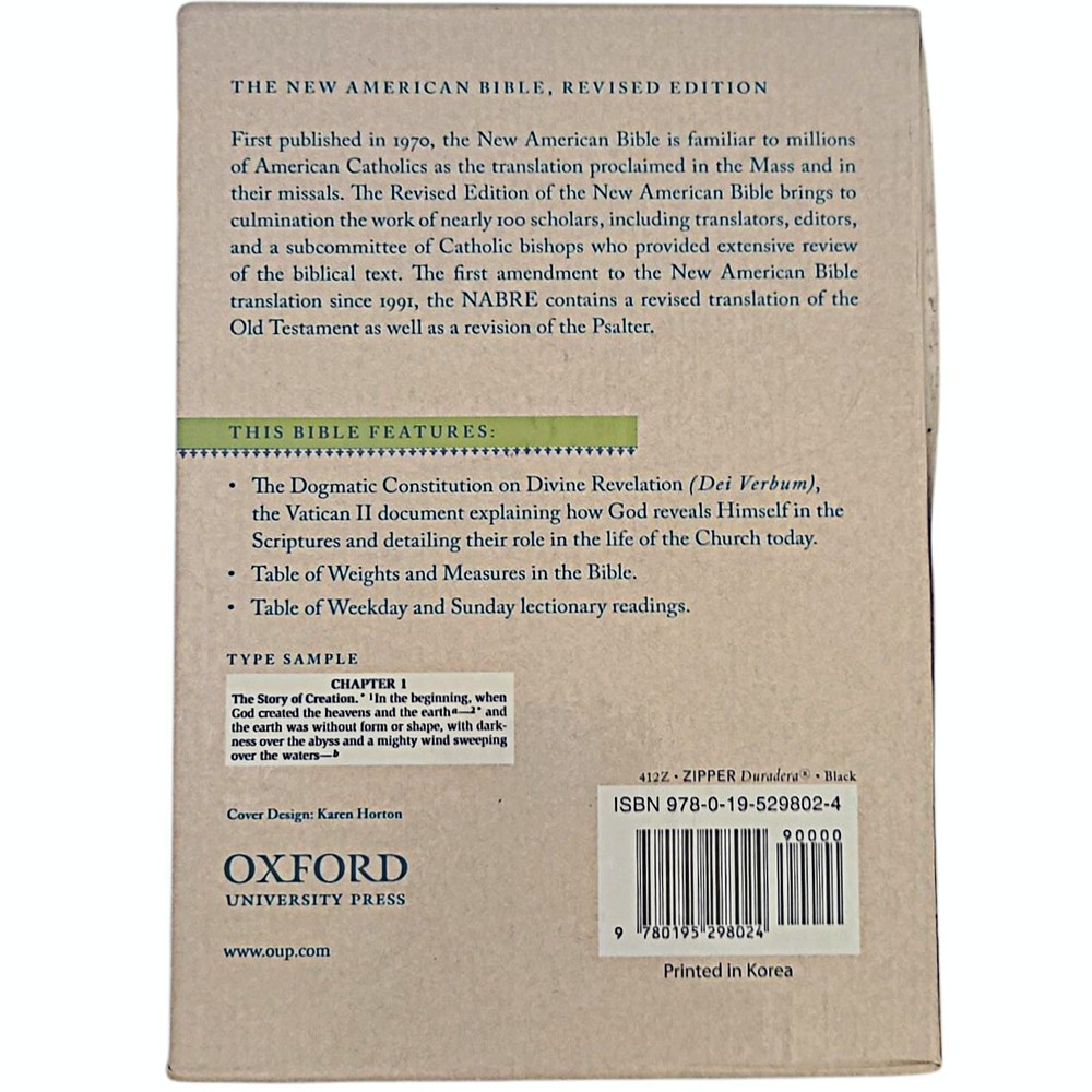 New American Bible Confraternity of Christian Doctrine Compact Zippered Duradera A light and portable version of Oxford's popular Catholic Bible in the New American Bible Revised Edition translation. Explore the scriptures with the New American Bible Revised Edition, a compact and durable zippered faux leather-bound volume of the Catholic Scriptures that is both practical for daily use and elegant for display. Published in 2011 by Oxford University Press, Incorporated, this Bible is a trusted resource for readers seeking an authoritative and accessible translation of the holy text. The New American Bible, edited by the Confraternity of Christian Doctrine, features a revised edition that includes 1504 pages of comprehensive content. Its dimensions make it an ideal size for carrying to church, study, or personal reflection. With its robust construction and clear English language, this Bible is an essential addition to any collection. The NABRE Compact Edition is a light and portable version of Oxford's popular Catholic Bible. This edition, which comes in a protective slipcase, is bound in a durable black Duradera® binding (a very attarctive faux leather) with a zipper closure. Its compact size and supremely affordable value make this a perfect edition for school and church use. Printed on smooth, durable paper in a clear typeface and easy-to-navigate format, the NABRE Compact Edition is easy to use and fits perfectly in a purse or bag. This slim, portable edition is packed with all the same trusted features that have made Oxford New American Bible volumes the best Bible versions available. The New American Bible Revised Edition: The New American Bible Revised Edition (NABRE) brings to culmination the work of nearly 100 scholars, including translators, editors, and a subcommittee of Catholic bishops who provided extensive review of the biblical text over a period of many years. The NABRE is the first major amendment to the New American Bible translation since 1991, featuring the first update of the Old Testament since 1970, taking into account recent archaeological and textual discoveries including a complete revision of the Psalter.