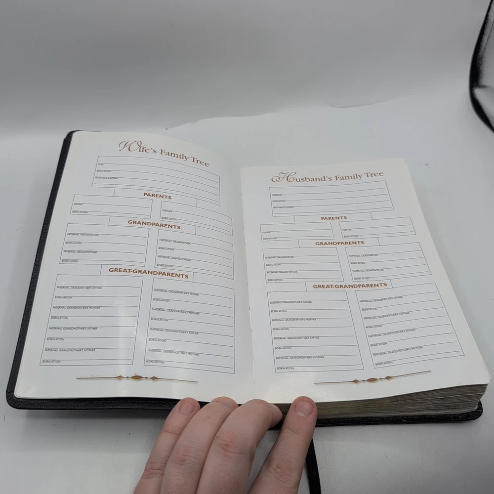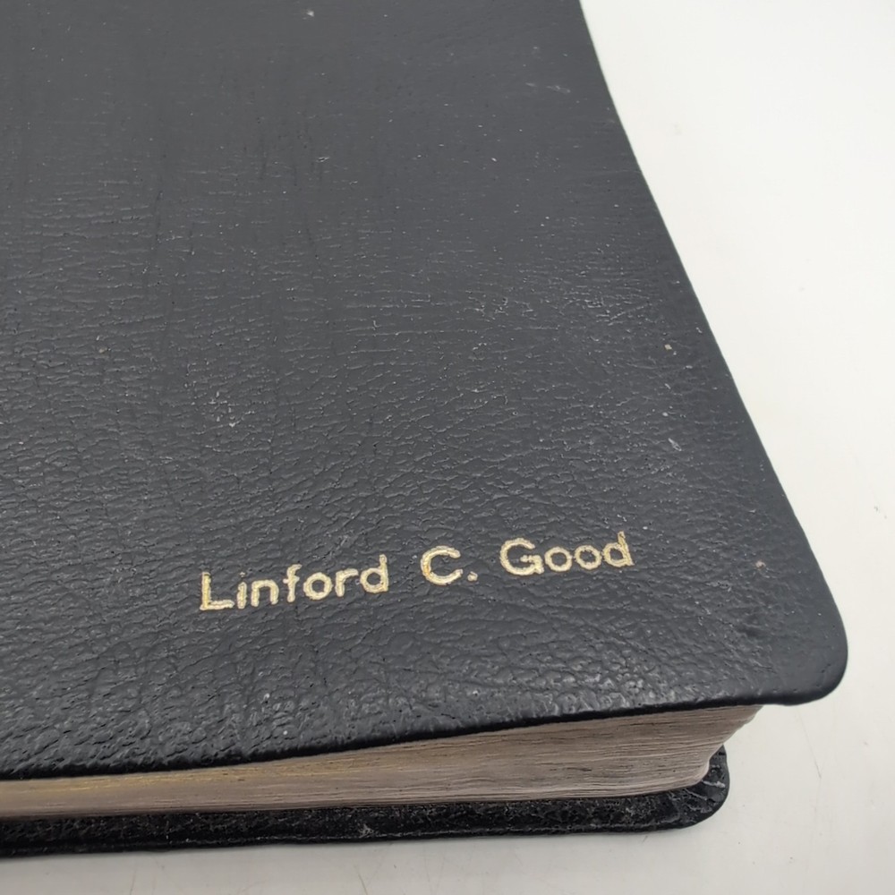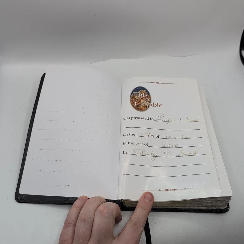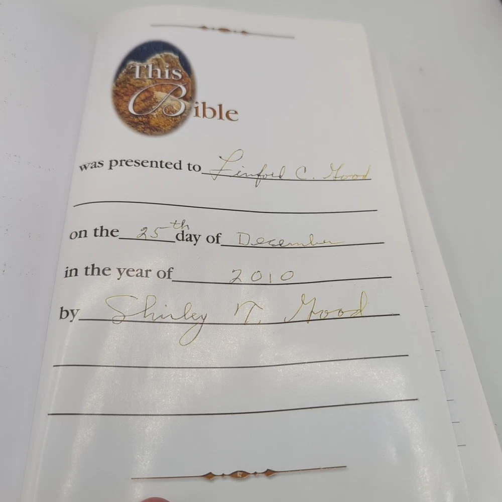 Please see photos. Has been loved. The dedication page is filled out. I see no other handwriting in the Bible. There are A few sporadic spots of highlighting. The cover of the Bible is inscribed to a linford good.