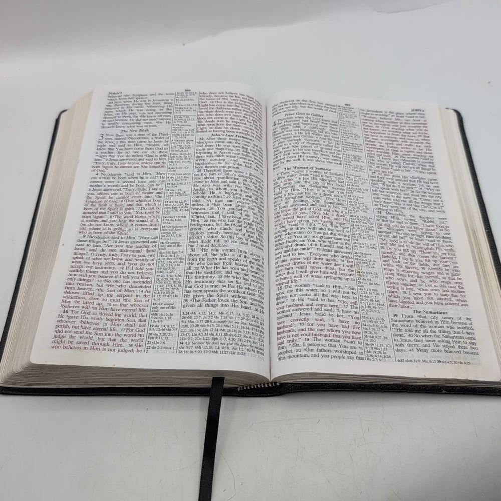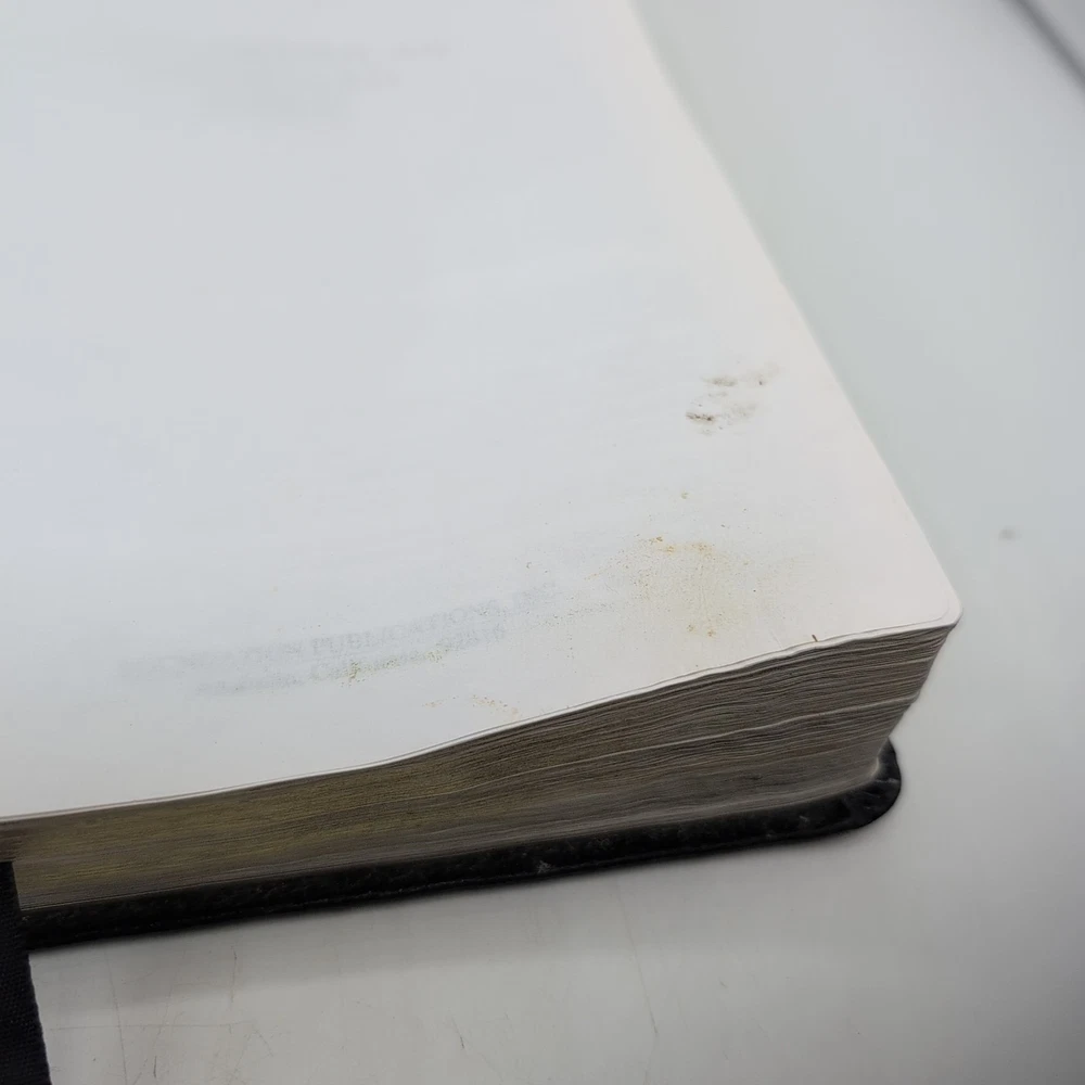 Please see photos. Has been loved. The dedication page is filled out. I see no other handwriting in the Bible. There are A few sporadic spots of highlighting. The cover of the Bible is inscribed to a ...