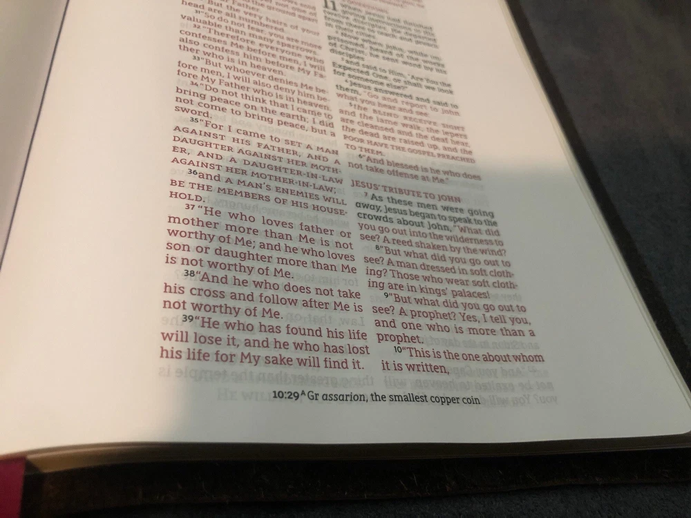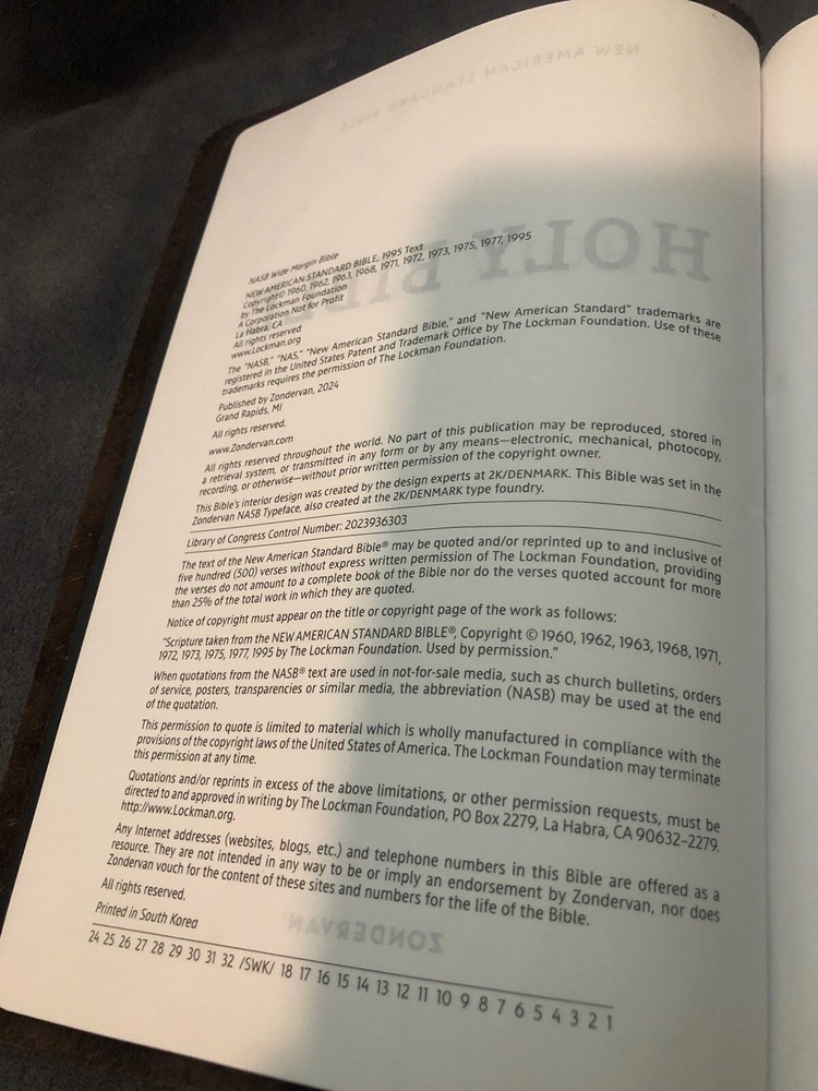Item was as described, no marks or highlights in the txt which is what I wanted. He does great quality work on rebinding the Bible. I was searching for a NASB 95 life application Bible, but they are no longer in print and not many out there that doesn’t have mark free txt. Seller is up front regarding shipping. Bible was neatly packed. For what I was looking for this was a great value. Keep doing the Lords work!