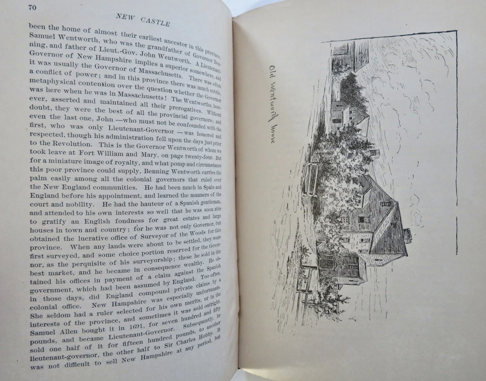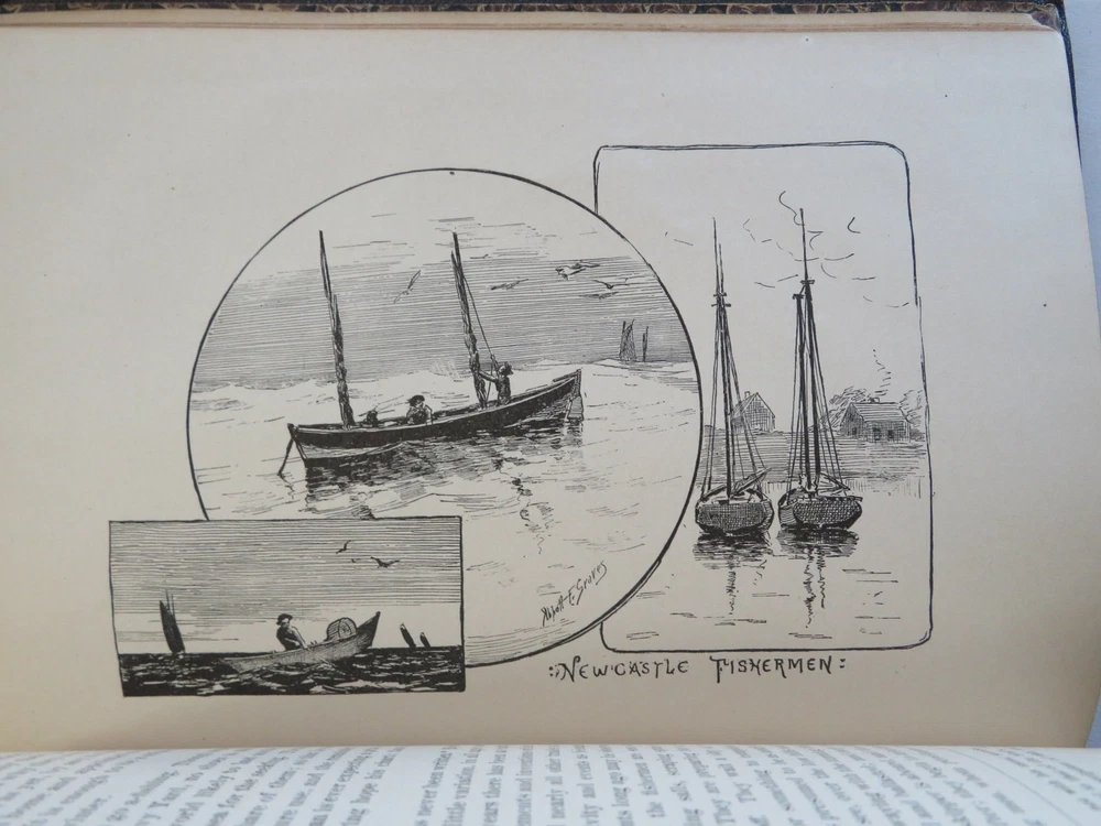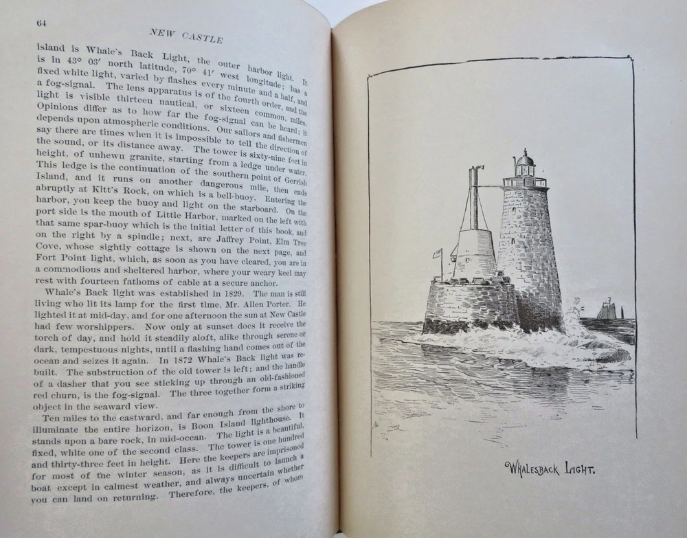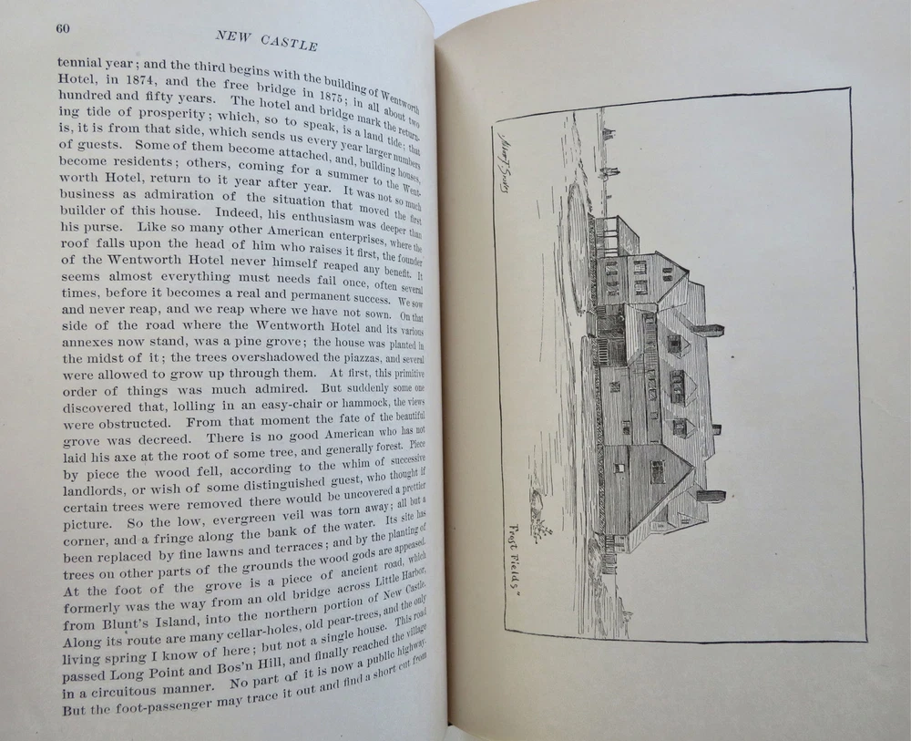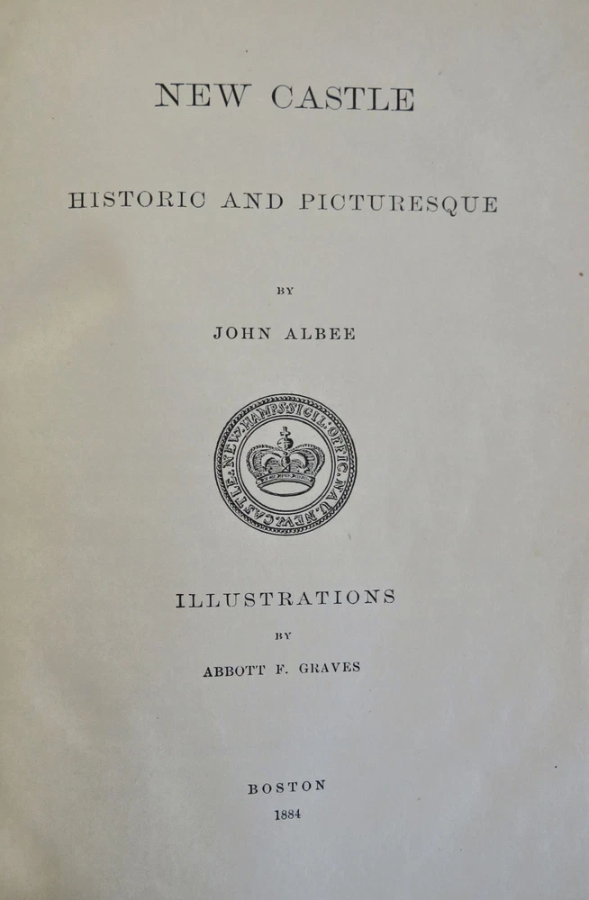 New Castle New Hampshire 1884 Town History & Guide pictorial leather book New Castle New Hampshire 1884 Town History & Guide pictorial leather book (Old Books, 19th Century Books, Leather Books, Americana, New England, New Hampshire, New Castle, Illustrated Books, Travel, Tourism, Town History). New Castle: Historic and Picturesque, by John Albee. Published 1884, Boston by the Rand Avery Supply Co. for George Thompson. 155 pages. Text in English. Illustrated throughout with line drawings, some full page. Very uncommon/ rare book to find in period publisher's leather binding. Publisher's soft leather binding, raised bands, gilt title lettering, embossed in blind ruled covers,marbled end papers. Book is physically old and shows some signs of handling and time. Book is not new or in "new" condition. Binding gently age worn, mostly light or inoffensive signs of handling and time but nothing severe or unsightly, book remains overall attractive as an object. Paper is gently toned, still clean, tight, sound internally. Still attractive on the shelf. The book displays a pleasing and unique age patina and is in overall nice antiquarian condition, any age flaws which may be present seem easy to overlook or forgive. Please review photos for more detail showing how this book survives. The asking price reflects the condition based on our examination and 35+ years full time exposure to antiquarian books, maps and printed ephemera of all types and genres. Flaws seen and/ or described have been taken into account. Book Measures c. 7 3/4" H x 5 3/4" W. [B12074].