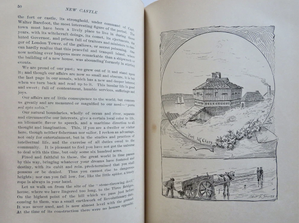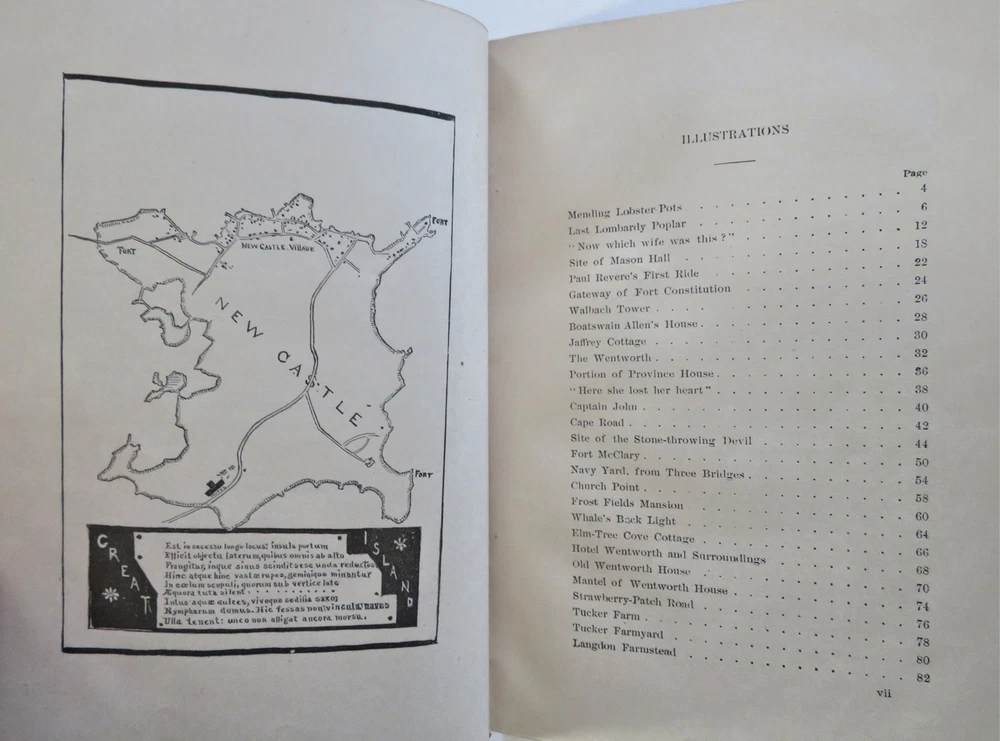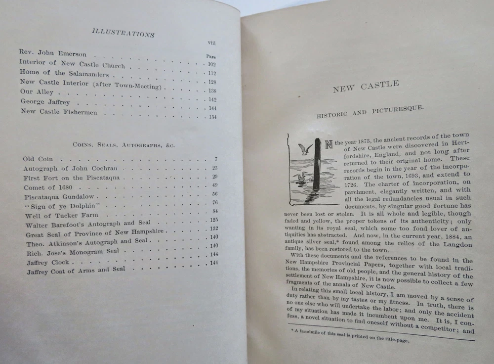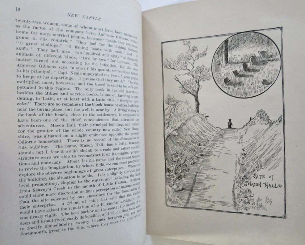 New Castle New Hampshire 1884 Town History & Guide pictorial leather book New Castle New Hampshire 1884 Town History & Guide pictorial leather book (Old Books, 19th Century Books, Leather Books, Americana, New England, New Hampshire, New Castle, Illustrated Books, Travel, Tourism, Town History). New Castle: Historic and Picturesque, by John Albee. Published 1884, Boston by the Rand Avery Supply Co. for George Thompson. 155 pages. Text in English. Illustrated throughout with line drawings, some full page. Very uncommon/ rare book to find in period publisher's leather binding. Publisher's soft leather binding, raised bands, gilt title lettering, embossed in blind ruled covers,marbled end papers. Book is physically old and shows some signs of handling and time. Book is not new or in "new" condition. Binding gently age worn, mostly light or inoffensive signs of handling and time but nothing severe or unsightly, book remains overall attractive as an object. Paper is gently toned, still clean, tight, sound internally. Still attractive on the shelf. The book displays a pleasing and unique age patina and is in overall nice antiquarian condition, any age flaws which may be present seem easy to overlook or forgive. Please review photos for more detail showing how this book survives. The asking price reflects the condition based on our examination and 35+ years full time exposure to antiquarian books, maps and printed ephemera of all types and genres. Flaws seen and/ or described have been taken into account. Book Measures c. 7 3/4" H x 5 3/4" W. [B12074].