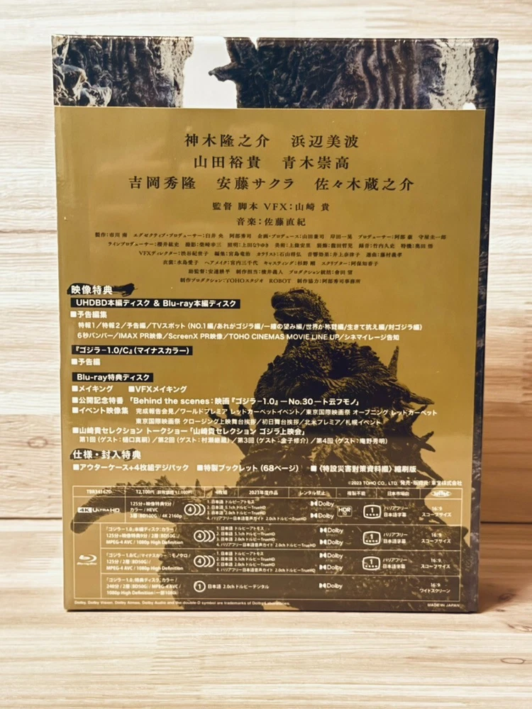 Description Condition:New release date : May 1, 2024 artist : Ryunosuke Kamiki, Minami Hamabe, Yuki Yamada director : Takashi Yamazaki Related works : Godzilla Selling agency : Toho Co., Ltd. Seller : Toho Co., Ltd. number of disks : 4 discs (1 Ultra HD Blu-ray, 3 Blu-ray Disc Videos) Duration : 134 minutes/134 minutes/-/240 minutes Product number : TBR-34167D JAN : 4988104139672 Screen size : Cinemasco size=16:9 language : Japanese (original language) / Japanese (original language) / Japanese (original language) / Barrier-free Japanese audio guide (audio commentary language) Audio method : Dolby Atmos (original audio format) / Dolby TrueHD 5.1ch surround (original audio format) / Dolby TrueHD Stereo (original audio format) / Dolby TrueHD Stereo (audio commentary audio format) subtitle language : Barrier-free Japanese subtitles Country of production : Japan Award history : 47th Japan Academy Award for Excellence / 47th Japan Academy Award for Excellence Western title : GODZILLA-1.0 GOUKA BAN Content introduction Japan after the war. From nothing (zero) to negative (minus). ●Recreate theater quality at home with high-definition image quality and 3D sound! The main story included on the deluxe 4K Ultra HD Blu-ray disc is recorded in 4K/HDR (High Dynamic Range) footage that cannot be recorded on conventional Blu-ray discs! The resolution, intensity of light, and amount of color are significantly different, allowing you to reproduce a more realistic and powerful video quality at home. This film became the first Japanese film to win the Visual Effects Award at the 96th Academy Awards! Enjoy the world-acclaimed powerful VFX in the highest image quality! ●A deluxe edition full of valuable footage, including behind-the-scenes footage and VFX footage that makes full use of advanced visuals! The bonus disc included this time contains a number of treasured footage. The making of the movie, which can only be seen here, includes interviews with the director and cast, as well as filming scenes. The story of the battle in overwhelmingly unfavorable conditions from the appearance of Godzilla to the immediate post-war period is told in the words of each person involved. , we also go behind the scenes of the production, such as the special shooting method unique to this work. The VFX making includes the director's particular design and characteristics of Godzilla, the video production process of the battleships and fighter planes that will be a major force in the fight against Godzilla, A must-see to see the latest VFX video production process including motion capture and CG testing! It includes footage from numerous events attended by a gorgeous cast representing the Japanese film industry, a collection of footage from a talk show in which director Yamazaki had a conversation with past Godzilla directors, and a special program commemorating the release. moreover! The deluxe edition also includes the main story of ``Godzilla 1.0/C,'' a black and white version released in theaters on January 12, 2024. A special booklet with over 60 pages and used in the scene explaining ``Operation Wadatsumi,'' an important strategy in the fight against Godzilla in the movie. Only the deluxe edition comes with a reduced edition of the ``Special Disaster Preparedness Materials'', making it irresistible for fans. A Blu-ray/DVD containing only the main story of "Godzilla 1.0/C" will also be released at the same time. ●A huge hit with box office revenue exceeding 7.45 billion yen! The long-awaited latest work of "Godzilla" that won the 96th Academy Awards® for Best Visual Effects! This work commemorates the 70th anniversary of Godzilla, the monumental special effects monster movie produced in Japan, and is the 30th live-action Godzilla movie produced in Japan. Takashi Yamazaki, a hit maker who has produced many popular works such as the ``ALWAYS Sunset on Third Street'' series, ``Eien no 0,'' and ``Parasyte,'' handled the director, screenplay, and VFX. The "-1.0" in the title is read as "minus one." The setting is postwar Japan. As if to add insult to injury, Godzilla suddenly appears in this country, which has been reduced to scorched earth by the war and has literally become ``zero'' after losing everything. Godzilla uses his overwhelming power to knock Japan down to the negative level. Nameless people who survived the war search for a way to survive and resist Godzilla. Ryunosuke Kamiki plays the lead role, and Minami Hamabe plays the role of the heroine, and the two, who attracted attention by playing the roles of a married couple in the NHK TV drama series ``Ranman,'' which aired from April to September 2023, co-star. Kamiki plays the main character, Koichi Shikishima, who survives the war but loses his parents, and Hamabe plays Noriko Oishi, who meets Shikishima while living strong alone in the burnt-out post-war Japan. In addition, the talented cast includes Yuki Yamada, Takataka Aoki, Hidetaka Yoshioka, Sakura Ando, and Kuranosuke Sasaki. It achieved the highest box office revenue as a live-action film released in Japan in 2023. Furthermore, it will be released in the United States in December 2023, It was a big hit, ranking first in box office revenue as a foreign language film released in North America in 2023, and highest in box office revenue among all Japanese live-action films released in the United States. His momentum did not stop in the award race, and at the 47th Japan Academy Awards, he won the Excellence Award in 12 categories, the most. Furthermore, it became the first Japanese film to win the Visual Effects Award at the 96th Academy Awards. *Recorded contents are subject to change. story Live and resist. Godzilla suddenly appears in Japan, which has become a scorched earth. Is there a way for the nameless people left behind to survive and fight back? In this work "Godzilla 1.0" which is a work commemorating Godzilla's 70th anniversary, Takashi Yamazaki is in charge of director, screenplay, and VFX.
