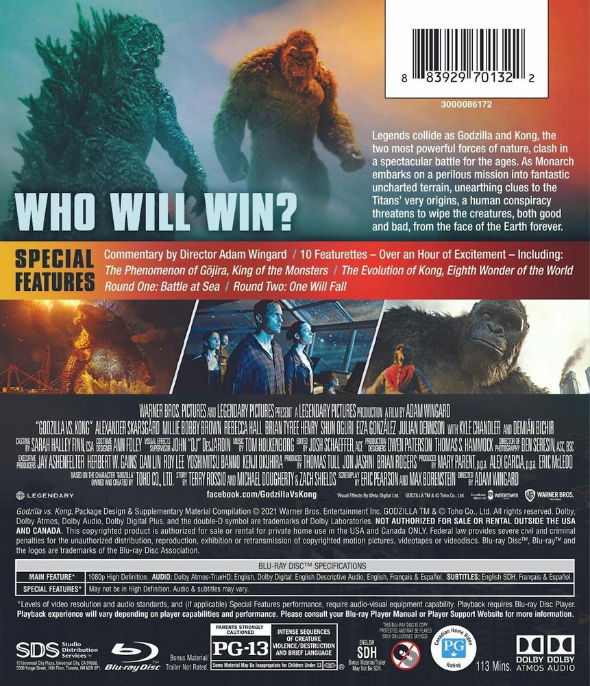 The product is a new sealed Blu-ray + DVD combo of the movie "Godzilla vs. Kong" directed by Adam Wingard and produced by Warner Home Video. The film falls under the genre of Action & Adventure with a PG-13 rating. It features a star-studded cast including Alexander Skarsgård, Lance Reddick, and Millie Bobby Brown. The Blu-ray disc is in NTSC video format with English, French, and Spanish subtitles available. The aspect ratio is 2.39:1 and the movie runs for 113 minutes, offering an exciting and thrilling viewing experience for fans of science fiction and superhero films.