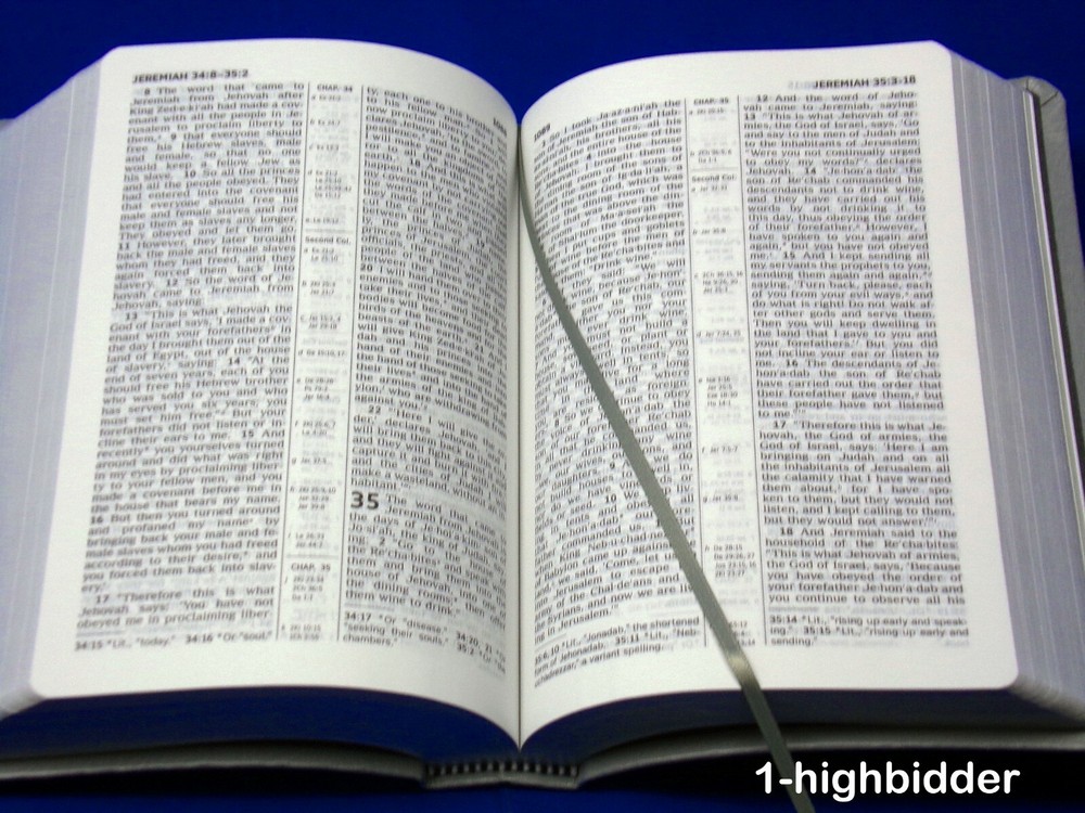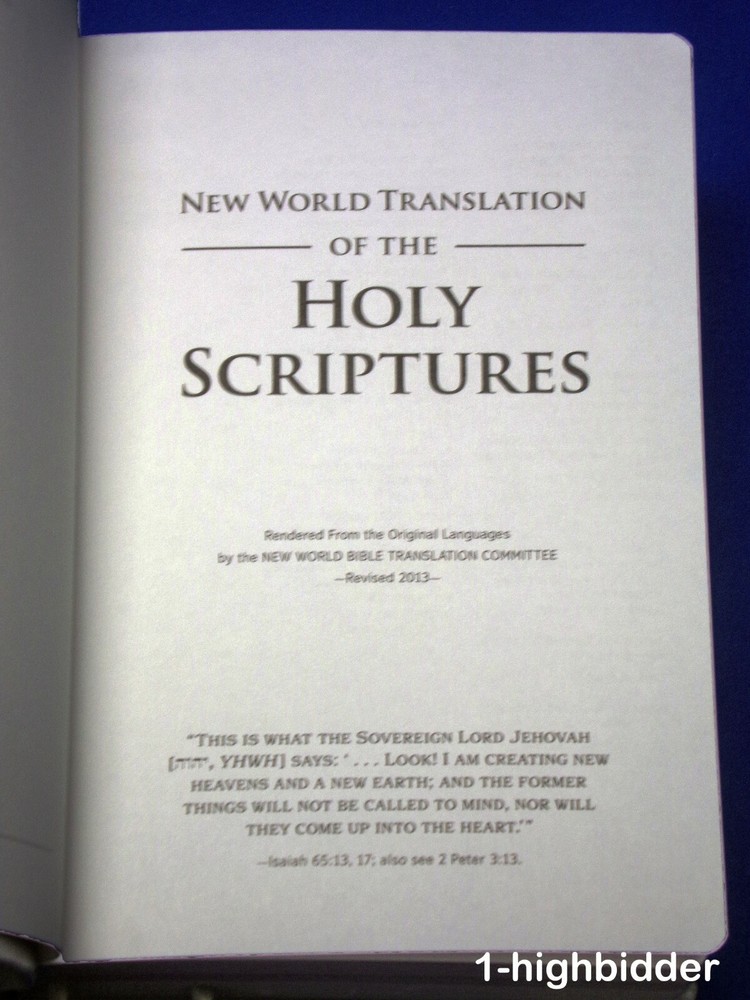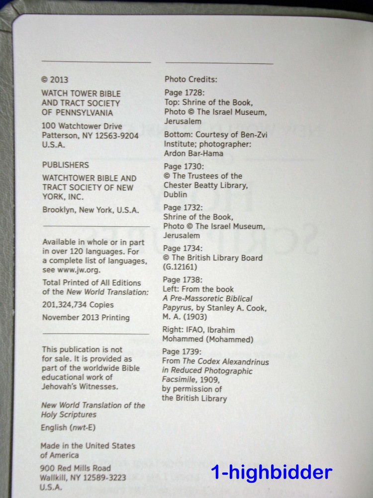 New World Translation Of Holy Scriptures Watch Tower Bible Gray Faux Leather Bound _____________________________________ This listing is for one 2013 Pocket-Sized New World Translation of the Holy Scriptures Bible published by the Watchtower Bible & Tract Society - Very nice! The book measures approximately 4-3/4" wide x 6-3/4" tall. Condition: EXCELLENT condition 2013 revised edition faux leather cover Bible! The binding is tight and all pages within are bright white with no writing, underlining, high-lighting, rips, tears, bends, or folds. Beautiful silver gilded page edges. The covers look near perfect, as can be seen in my photos. You will be happy with this one! Always handled carefully and packaged securely! Buy with confidence from a seller who takes the time to show you the details and not use just stock photos. Please check out all my pictures and email with any questions! Thanks for looking! Copyright © 2018-2022 TDM Inc. The photos and text in this listing are copyrighted. I spend lots of time writing up my descriptions and despise it when un-original losers cut and paste my descriptions in as their own. It is against ebay policy and if you are caught, you will be reported to ebay and could be sued for copyright infringement and damages.