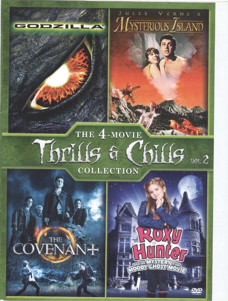 The 4-Movie Thrills & Chills Collection Vol 2 -- Godzilla (1998) Matthew Broderick Maria Pitillo Mysterious Island (1961) Michael Craig Michael Callan The Covenant (2006) Steven Strait Taylor Kitsch Roxy Hunter and the Mystery Moody Ghost Movie (2007) Aria Wallace Robin Brule REPLACEMENT COVER ART FOR DVD CASE ONLY -- NO DISC OR CASE BUYER PAYS RETURN SHIPPING. Condition is VERY GOOD. See pictures for visual condition of items and for more information. Shipped via First Class Mail using stamps with no tracking. I ship only within the United States. NO INTERNATIONAL SHIPPING! I try very hard to list my items honestly but sometimes I miss something. If for any reason you are unhappy with your item after you receive your item, please let me know. It is very important to me that you be happy with your purchase.