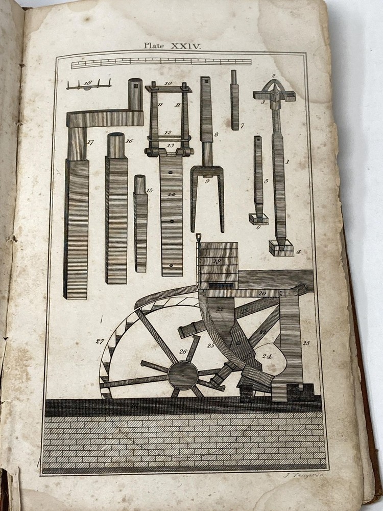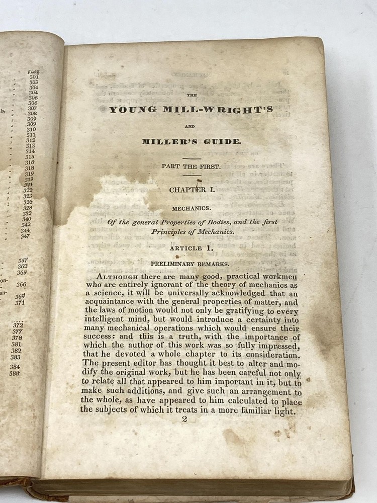 THE YOUNG MILL-WRIGHT AND MILLER'S GUIDE; ILLUSTRATED BY TWENTY-EIGHT DESCRIPTIVE PLATES; (and "A Description of an Improved Merchant Flour-Mill") Author: Evans, Oliver (and Thomas Jones -- Additions and Corrections) Title: THE YOUNG MILL-WRIGHT AND MILLER'S GUIDE; ILLUSTRATED BY TWENTY-EIGHT DESCRIPTIVE PLATES; (and "A Description of an Improved Merchant Flour-Mill") Publication: Philadelphia, PA: Carey; Lea & Blanchard, 1834 Edition: Eighth Edition Description: C. & O. Evans. Leather-bound. Quarto. (8 3/4 in. x 5 1/2 in.). Contemporary calf, scuffed, extremities worn, but still very solidly bound. Some minor peeling to leather at joints but no separation. Contrasting black spine label, lettered in gilt, and faux compartments divided by double gilt rule. Tiny evidence of a worm knocking and entering, uninvited, just above first set of double rules (from bottom of spine). Interesting signature/notes to front free endpaper from previous owner. Moses Parkins, who writes: "Writen by Seven Parkins / late of the State of Ohio..Now of the State of old Virginia", dated April 12th, 1841": 27 out of 28 plates present (Plate XXV missing). NOTE: Numbering for Plates XXVII and XXVIII incorrectly labeled -- as Roman numerals XVII and XVIII, respectively, missing one of the "X's. Appendices. Publisher's advertising section (4pp.) at rear. Good. NOTES: "There is to this day, at least one mill owner known to the writer, who has a copy of Oliver Evans' Mill-Wright in his office to which he says quite frankly he refers often, considering it is still in many repects the most practical work for millers ever published..." In 1791, George Washington upgraded his milling operation using the improvements of Oliver Evans. Oliver Evans, a native of Delaware, had been actively working on developing and refining his milling system since the early 1780s. George Washington learned of Evans's improvements in 1790, when he reviewed and signed the patent application submitted to the newly-established United States Patent Office. In addition to the patent review, Washington was aware of two mills already operating on the Evans system during the years of his first term as president. One was located near Mount Vernon in the village of Occoquan, and the other was located along the Brandywine Valley near Wilmington, Delaware, owned by Joseph Tatnall, a wealthy miller and businessman. In 1777, Tatnall, a Quaker, ground flour for Washington's troops as they suffered through the winter at Valley Forge. Reportedly Tatnall told Washington, "I cannot fight for thee, but I can feed thy men." Years later on a presidential trip, Washington visited Tatnall to again express his thanks for services rendered during the Revolution. Tatnall had recently equipped one of his two mills with the Evans components. The practical experience of viewing this mill in operation solidified Washington's decision to install the patented system at Mount Vernon. Seller ID: 88499 Subject: Technology, Engineering Aardvark Rare Books Eugene, OR We work hard to make your Bookbuying Experience safe, easy and fun. Aardvark Books is a proud member of the ABAA (Antiquarian Booksellers Association of America) and IOBA, Independent Online Booksellers Association. Ezra is also an accredited and Qualified Appraiser of Books and Manuscripts, with a designation from the ASA (American Society of Appraisers), with considerable Archive experience as well. Shipping All books shipped to US destinations are sent via the US Postal Service. Faster shipping is available, please ask before paying. We will combine shipping on items purchased at the same time in order to help reduce costs. International shipping is also available. Please inquire for a shipping quote before ordering. This listing was created by Bibliopolis.