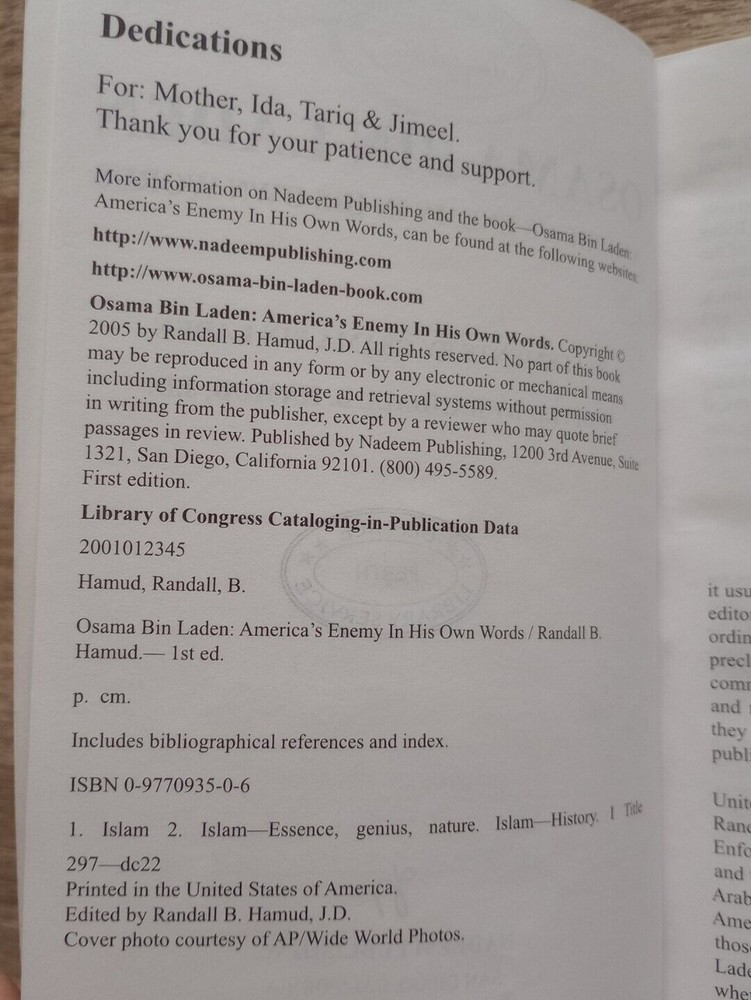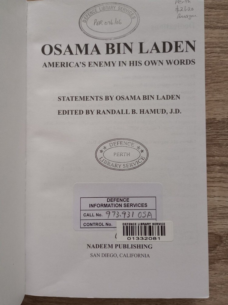 Osama Bin Laden By Randall B Hamud SC America's Enemy. Softcover 348 pages X Library book stickers and stamps shown in photos No Inscriptions in book, see photos See photos for contents and details Bubble wrapped for protection We do combined postage, maximum postage cost of $14, no matter how many books you buy (Australian addresses only) Listing and template services provided by inkFrog