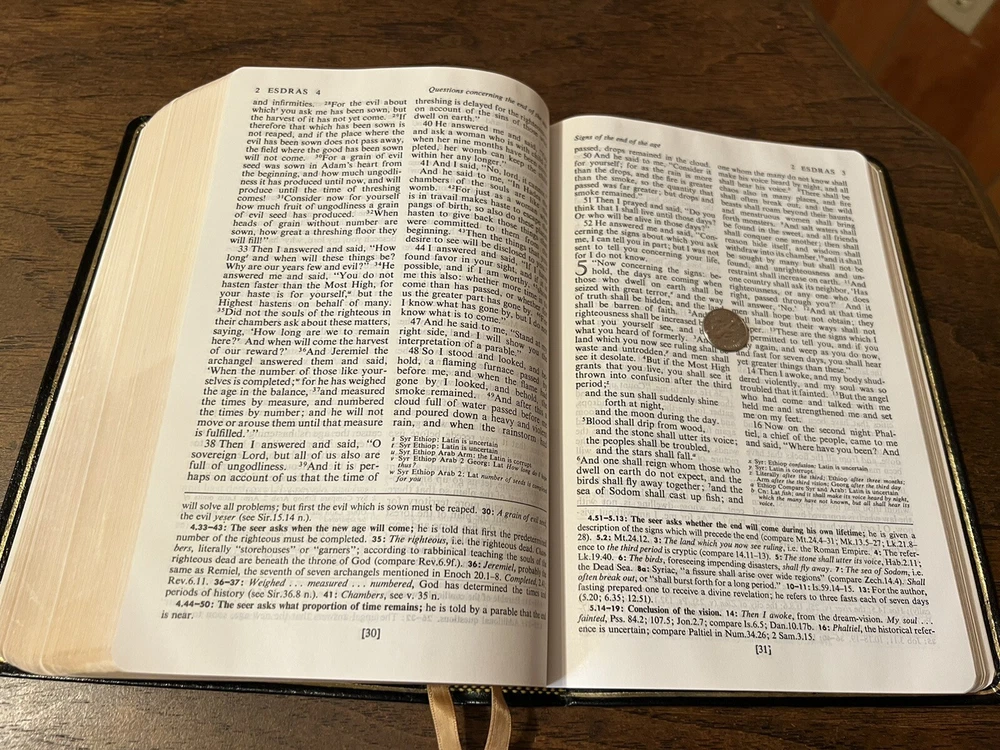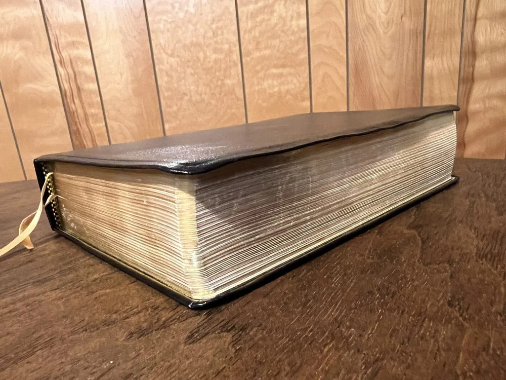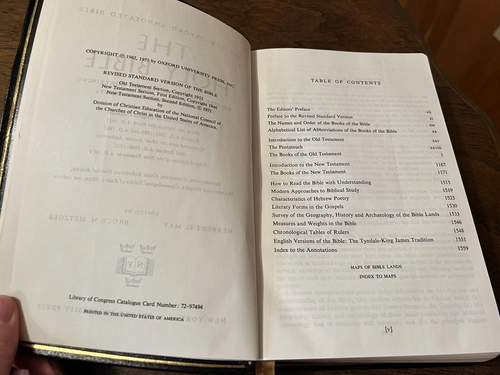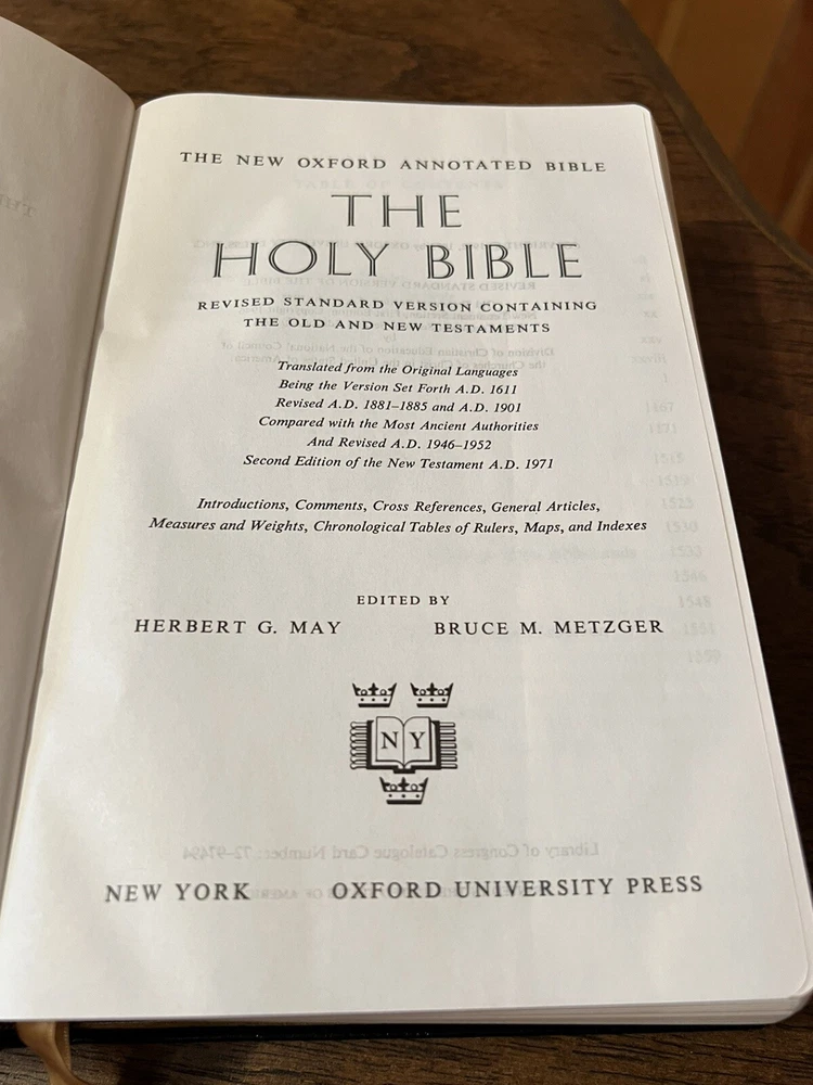 Oxford Annotated Bible RSV NOAB Revised Standard Version Genuine Leather Expanded Edition The paper quality is astounding as Oxford published amazing editions back in those days. I found some minor abrasions to a few edges, but the genuine leather has held up well and is still very flexible. This includes the apocrypha in the back. The page edges have some consistent, though minor scratches. The binding is a very flexible, likely Berkshire leather, that has a rather elaborate river grain look to it. It feels great in the hand and is exceedingly rare these days. This is a slightly newer edition from 1985, I believe. I found no writing, no stamps, stains, tears, etc. I did find where one of the publisher pages was detached at the bottom, but not the top. Not sure how that happened. The spine has a slight, inward curve due to it having been stored upright. I will store this in such a way that by the time it sells, hopefully it will be greatly reduced in appearance. Black letter Colored maps Paragraph setting Double column format 9.25 x 6.25 x 1.75 inches Dime used for comparison Note: I do not accept returns unless the item was not as I described because of a mistake I made. If the item is smaller than you thought it would be (because you didn’t read the description with dimensions), that’s on you. I do not cancel orders for any reason, even if you accidentally ordered it. It takes about 3 steps to purchase an item, so if you paid for it, it’s yours. I make these annoying rules because so many customers have recently treated the purchase of items flippantly and I have to draw a line somewhere. Well, here it is. I always list any writing, stains, tears, or imperfection of any kind. And I always list the condition conservatively, so you should expect the item to be in better condition than listed. Unlike the vast majority of sellers out there, I refuse to hide imperfections through cleverly taken pictures or obscure descriptions. I try to include as many pictures as necessary to highlight the imperfections rather than the beauty of the items, which is part of why I have an elevated Seller Status and perfect feedback in which many consistently report back “just as described” or “better than described.” If I miss something by accident, please contact me so I can make it right. My flawless feedback should speak for itself, but you won’t be disappointed! Thank you for your business and God bless!
