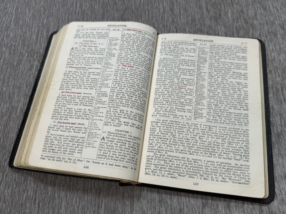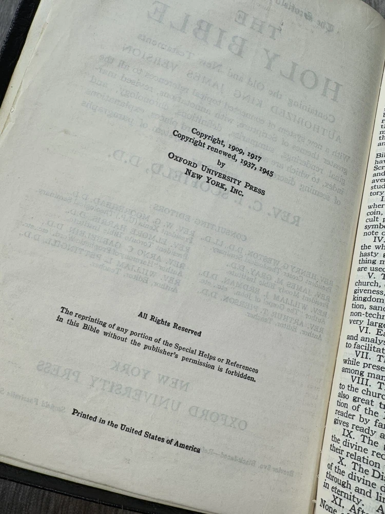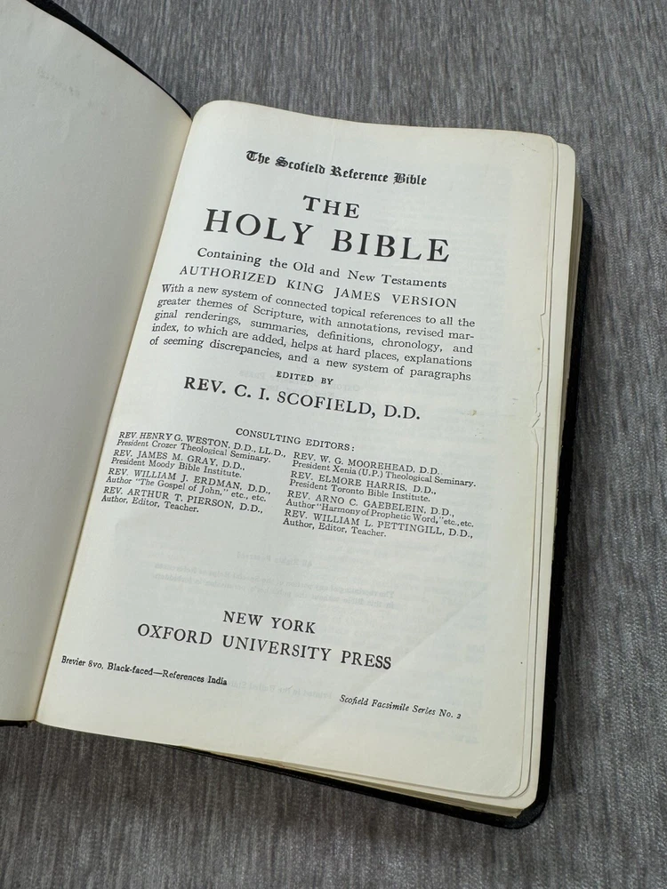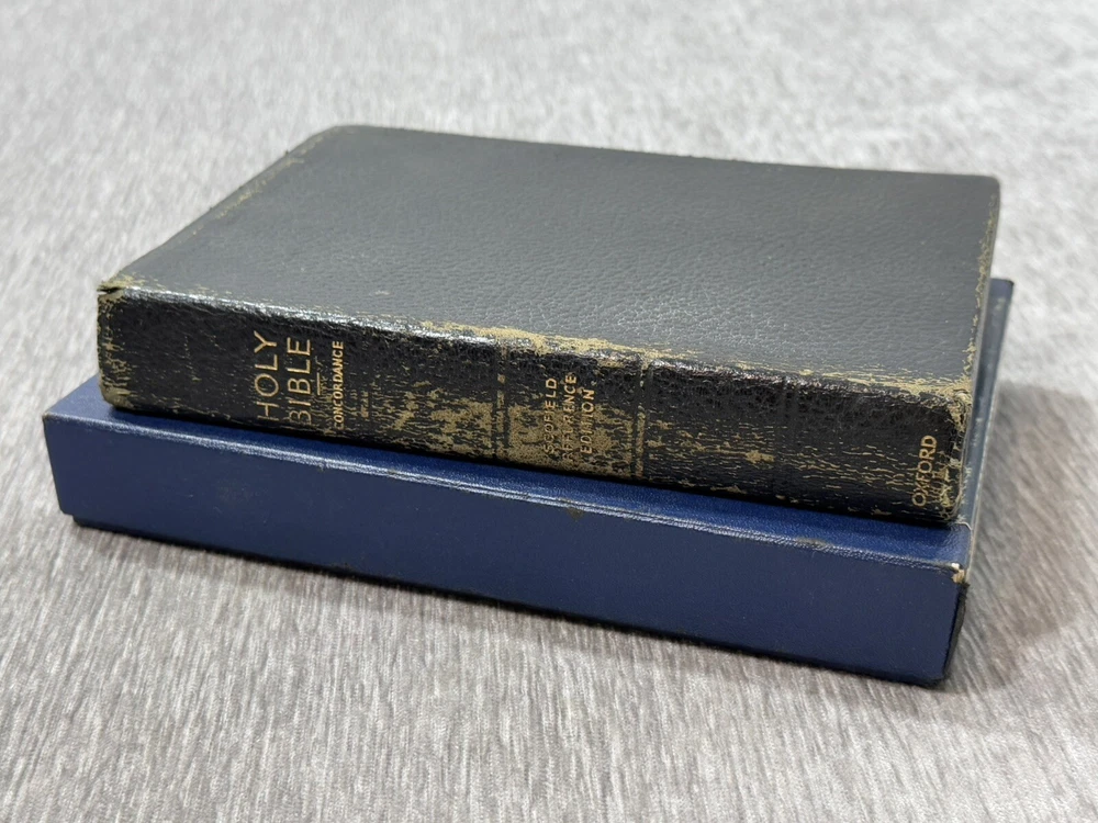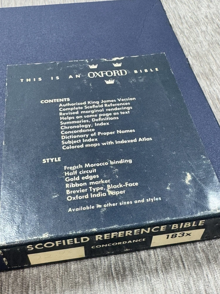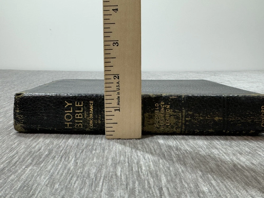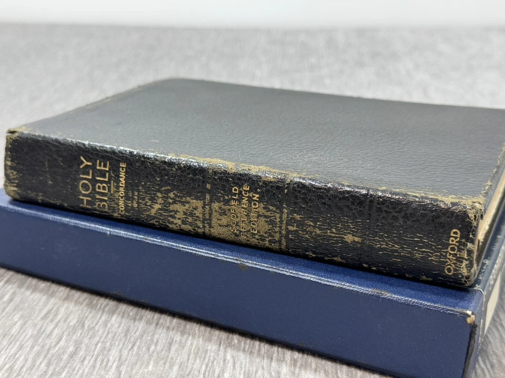 For sale is a vintage Oxford Holy Bible Concordance Scofield Reference Edition Leather 1945 with original Box. Model: 183x Well used Bible, shows fairly heavy wear, cover wear, worn areas, etc. There are notes/highlighting in pages. Binding is intact and pages are attached. Please see al photos.