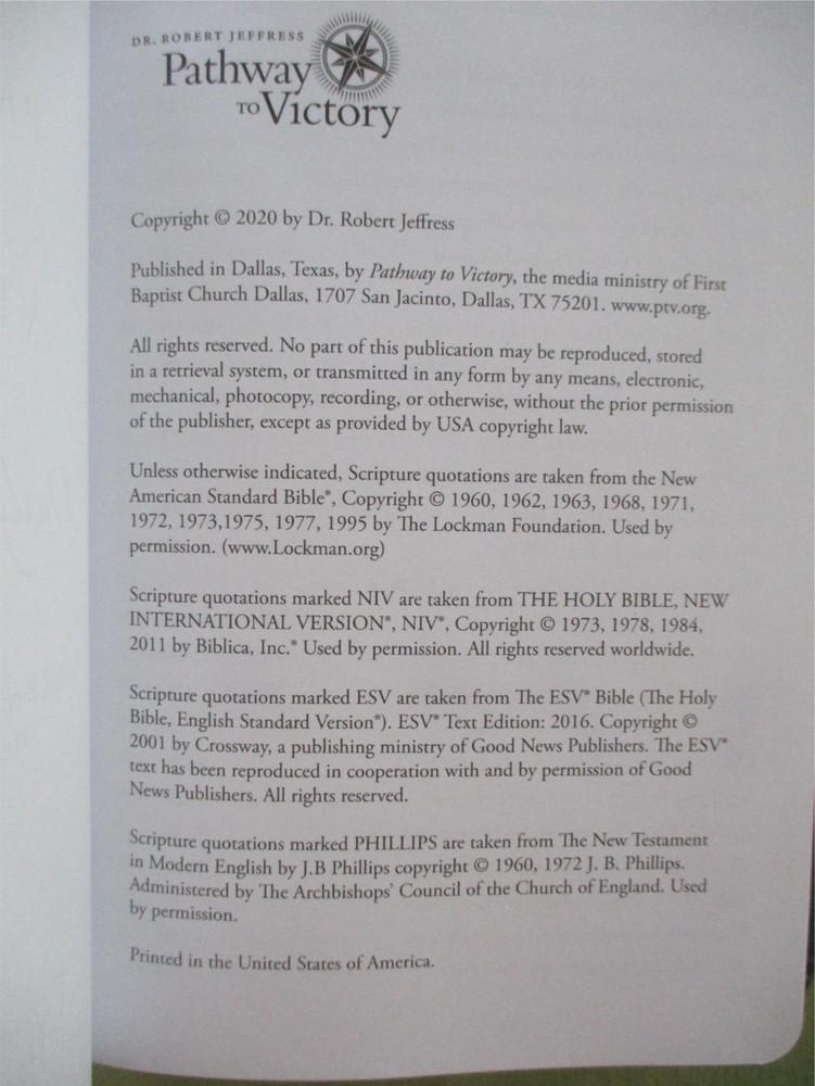 PATHWAY TO VICTORY DAILY DEVOTIONAL Book by Dr Robert Jeffress 2020 Leather NICE PATHWAY TO VICTORY DAILY DEVOTIONAL Book by Dr Robert Jeffress 2020 Leather NICE TITLE: PATHWAY TO VICTORY Daily Devotional AUTHOR: Dr. Robert Jeffress FORMAT: Leather book with decorative embossed binding. Copyright 2020 by Dr. Robert Jeffress. CONDITION: This book is in clean and LIKE NEW condition overall. It has a tight spine and clean covers. Inside pages are crisp and clean, with no writing or marks. Please see photos. PAYMENT & SHIPPING TERMS: Please pay within 3 days of item purchase. We ship promptly upon receipt of payment. Under policy, eBay is collecting state sales tax where appropriate. Our "Free Shipping" offer includes USPS Media Mail shipping in the USA. This rate typically delivers in 5-9 days but can take as long as 30 days to some areas. If you need your purchase right away, we strongly suggest you choose the Priority Mail option at checkout. International Buyers Please Note: * Import duties, taxes and charges are not included in the item price or shipping charges. These charges are the buyer's responsibility. * Please check with your country's customs office to determine what these additional costs will be prior to bidding/buying. * We do not mark merchandise values below value or mark items as "gifts" - US and International government regulations prohibit such behavior. Listing and template services provided by inkFrog