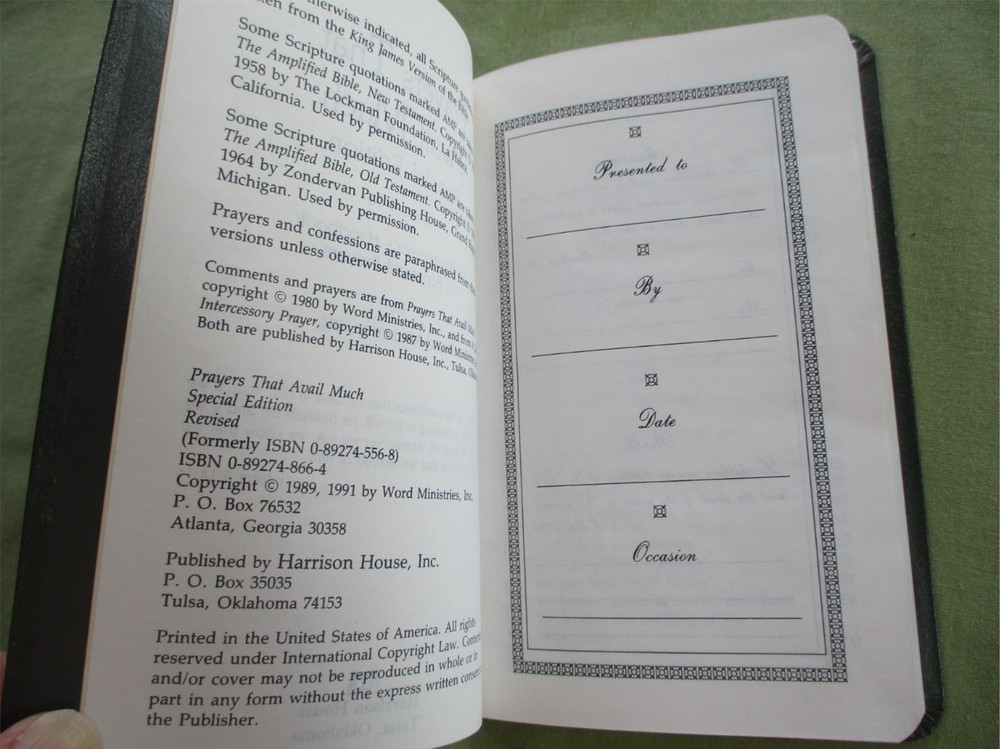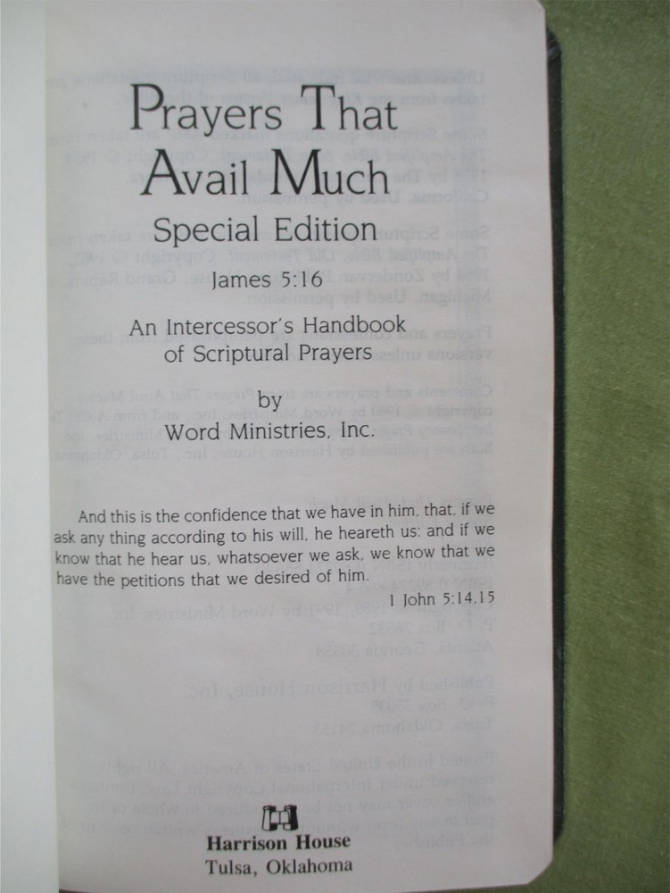 PRAYERS THAT AVAIL MUCH Special Edition 1991 Word Ministries Scripture Leather PRAYERS THAT AVAIL MUCH Special Edition 1991 Word Ministries Scripture Leather TITLE: PRAYERS THAT AVAIL MUCH: Special Edition An Intercessor's handbook of Scriptural Prayers AUTHOR: Word Ministries FORMAT: Small Handbook; Revised edition 1991 by Harrison House. Genuine Bonded Leather. CONDITION: This small book is in clean and VERY GOOD condition overall. This book appears unread and has a strong spine and clean covers. Inside, pages are clean with no writing or marks. Please see photos. PAYMENT & SHIPPING TERMS: Please pay within 3 days of item purchase. We ship promptly upon receipt of payment. Under policy, eBay is collecting state sales tax where appropriate. Our "Free Shipping" offer includes USPS Media Mail shipping in the USA. This rate typically delivers in 5-9 days but can take as long as 30 days to some areas. If you need your purchase right away, we strongly suggest you choose the Priority Mail option at checkout. International Buyers Please Note: * Import duties, taxes and charges are not included in the item price or shipping charges. These charges are the buyer's responsibility. * Please check with your country's customs office to determine what these additional costs will be prior to bidding/buying. * We do not mark merchandise values below value or mark items as "gifts" - US and International government regulations prohibit such behavior. Listing and template services provided by inkFrog