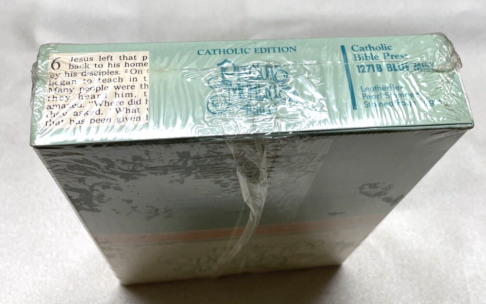 PRECIOUS MOMENTS KEEPSAKE EDITION CATHOLIC BIBLE LEATHERFLEX PEARL STAMPED BLUE MIST STAINED PAGE EDGES 1271B - STILL IN PLASTIC WRAP. SHIPS USPS MEDIA MAIL