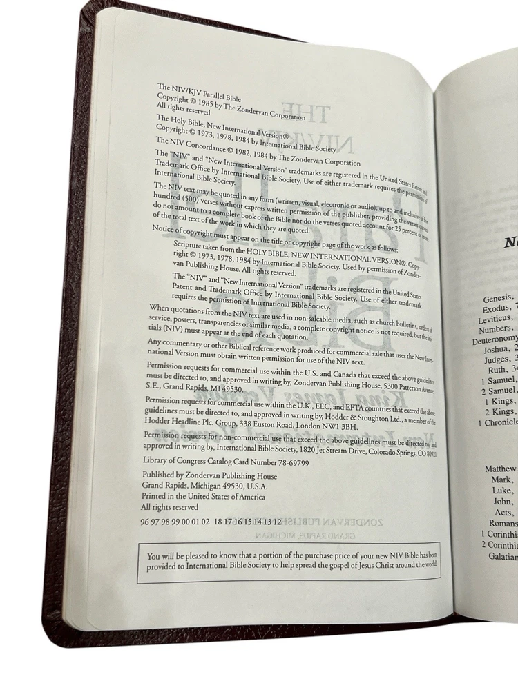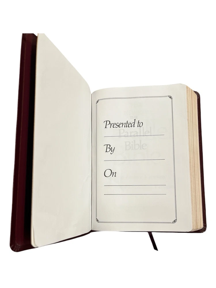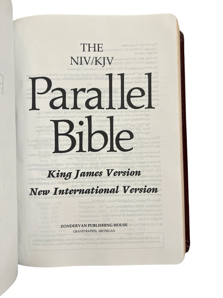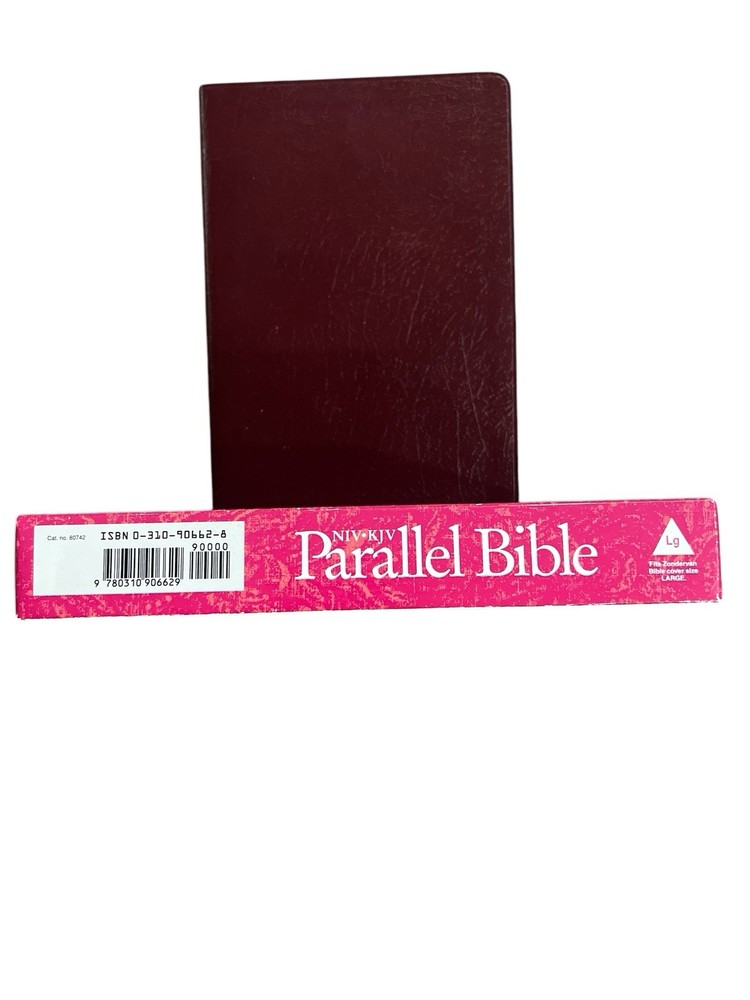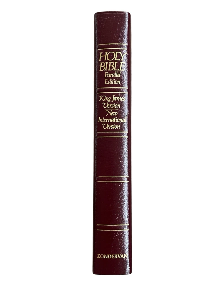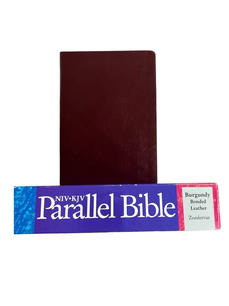 1985 Parallel Bible King James and New International Version. Copyright 1985. Published by Zondervan. Soft Burgundy Leather Cover Gold Etched Pages. Condition: Excellent. Unused. No Markings In Bible. Smoke/Pet Free Environment. Side by side transaltaions of King James and New International Version appear in same page for easy comparison.