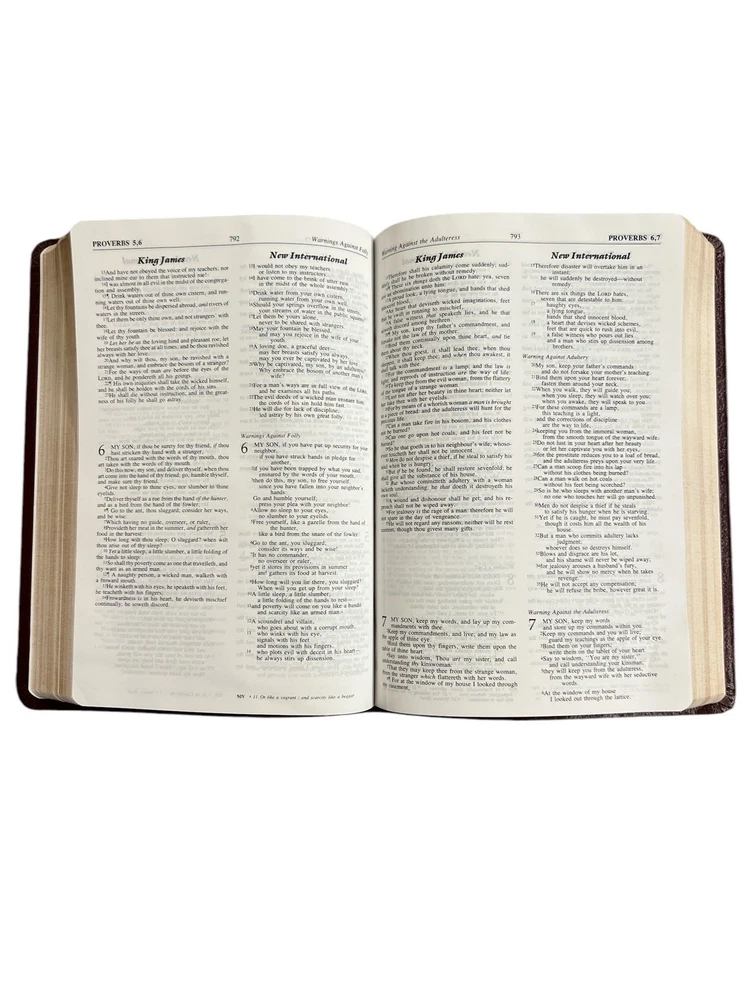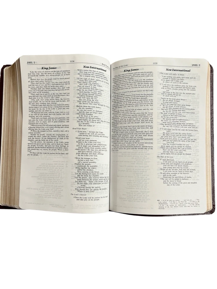 This Bible is absolutely stunning—the soft burgundy leather feels luxurious, and the gold-etched pages add a beautiful touch. Having both the KJV and NIV side by side makes studying and comparing translations effortless. It’s in pristine condition, like new, with no markings at all. Perfect for deep study or personal reflection, and the quality is top-notch. Highly recommend for anyone who loves God’s Word!