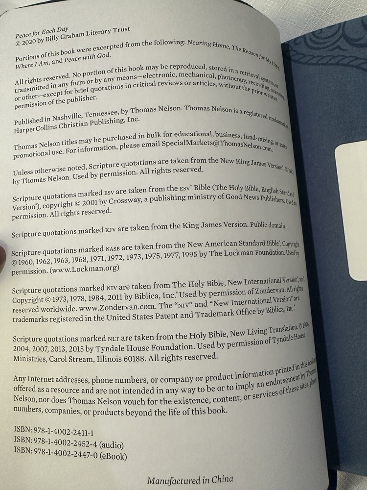 The product is a large text leatherbound book titled "Peace for Each Day" by Billy Graham. It is part of the "For Each Day" series and provides daily devotionals on Christian education. Published in 2020, the book is designed for young adults and adults, with 400 pages of nonfiction content focusing on finding peace each day. NEW - No Box