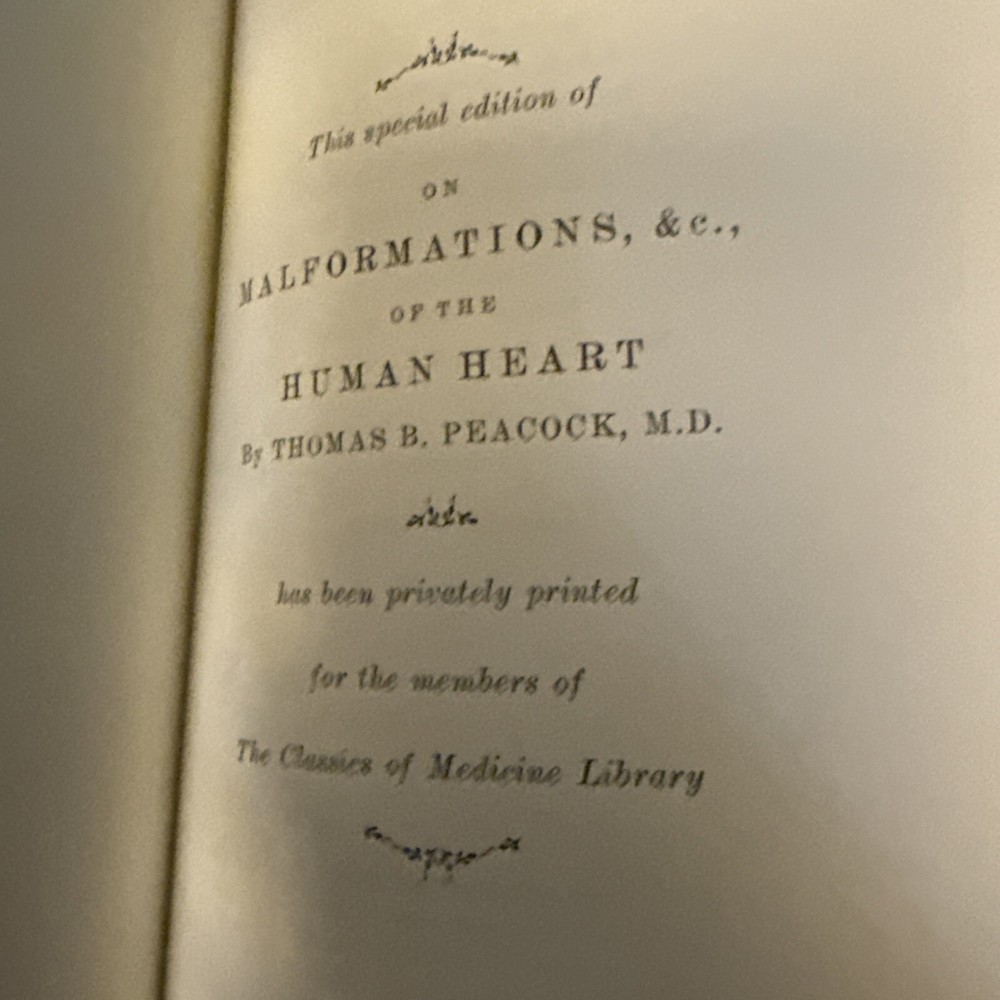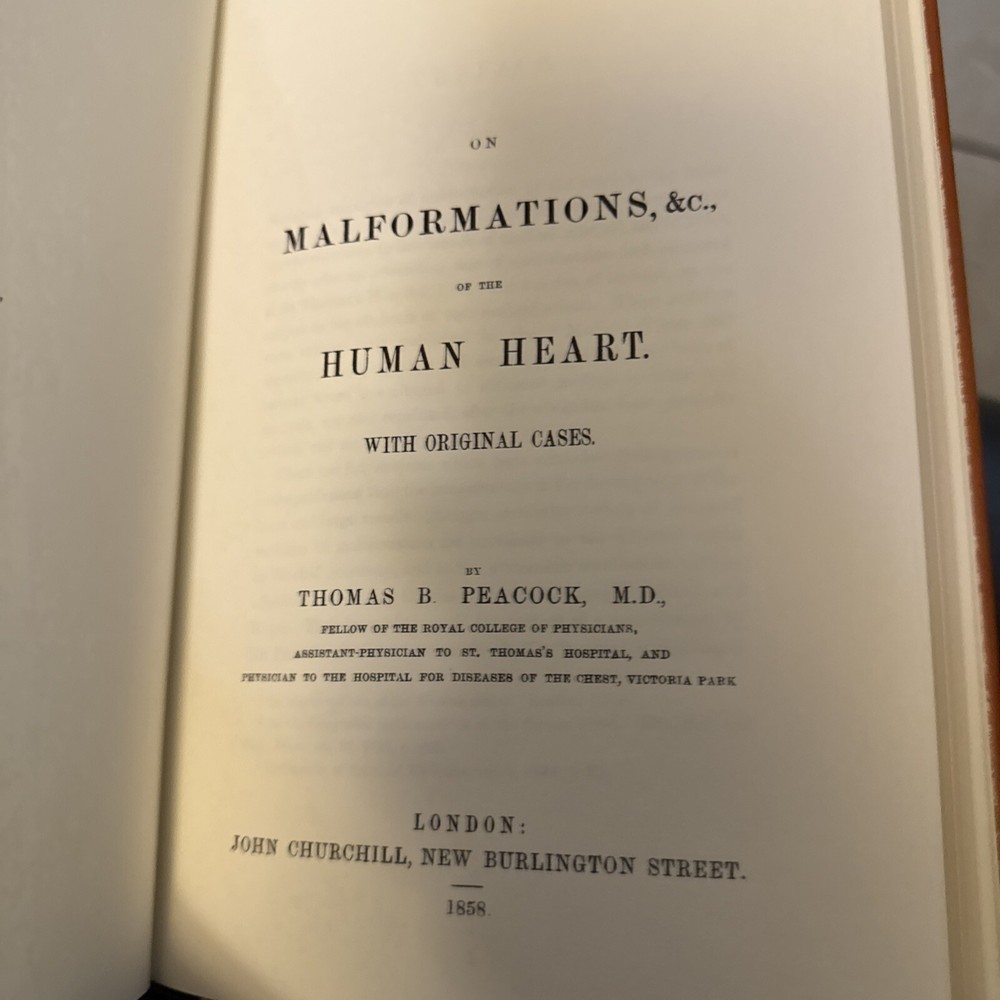This is a leather-bound reprint of "Malformations, & C. of the Human Heart" by Thomas B. Peacock, published by The Classics in Medicine Library in 1981. It is a cardiology textbook focusing on human heart malformations. This advanced level book is in English and is intended for adult education. It was published in the United States.