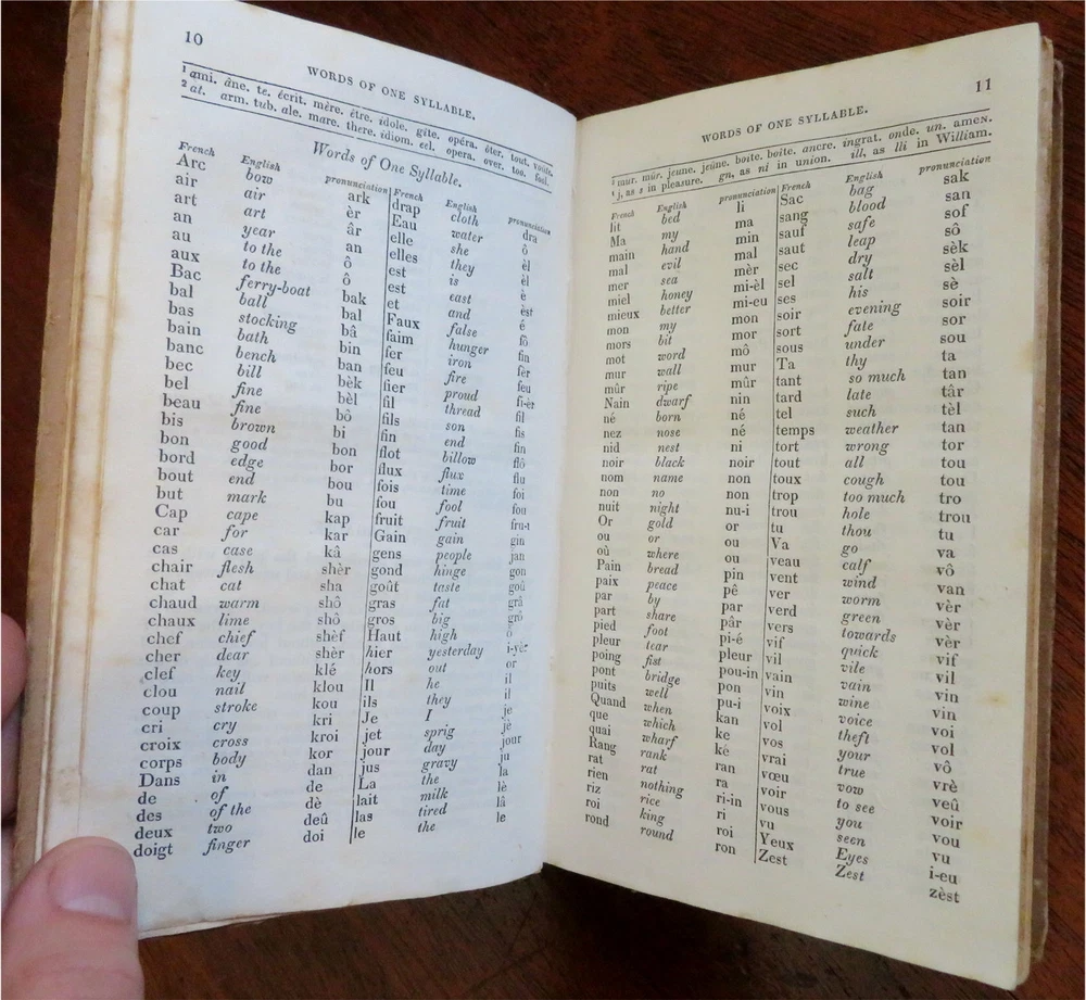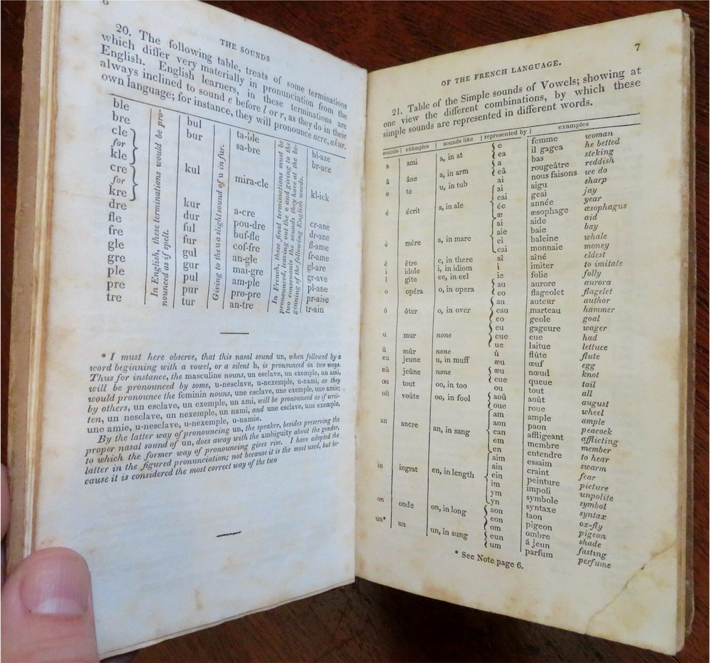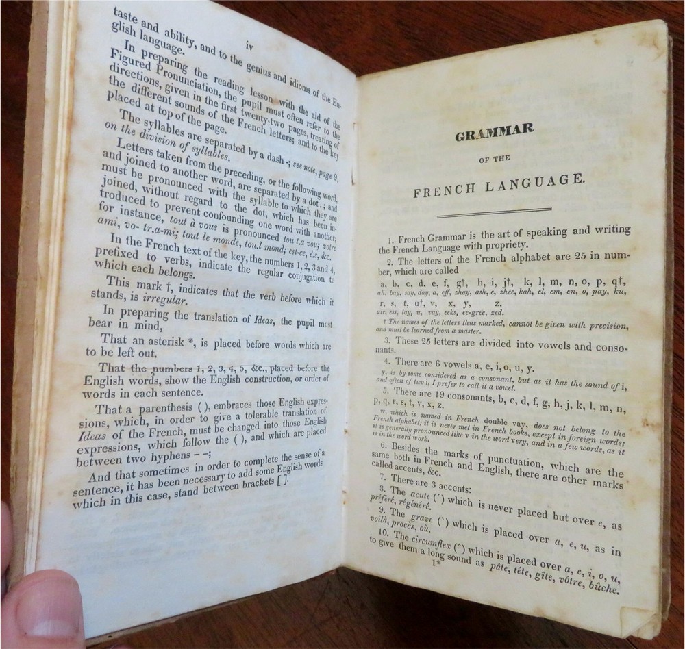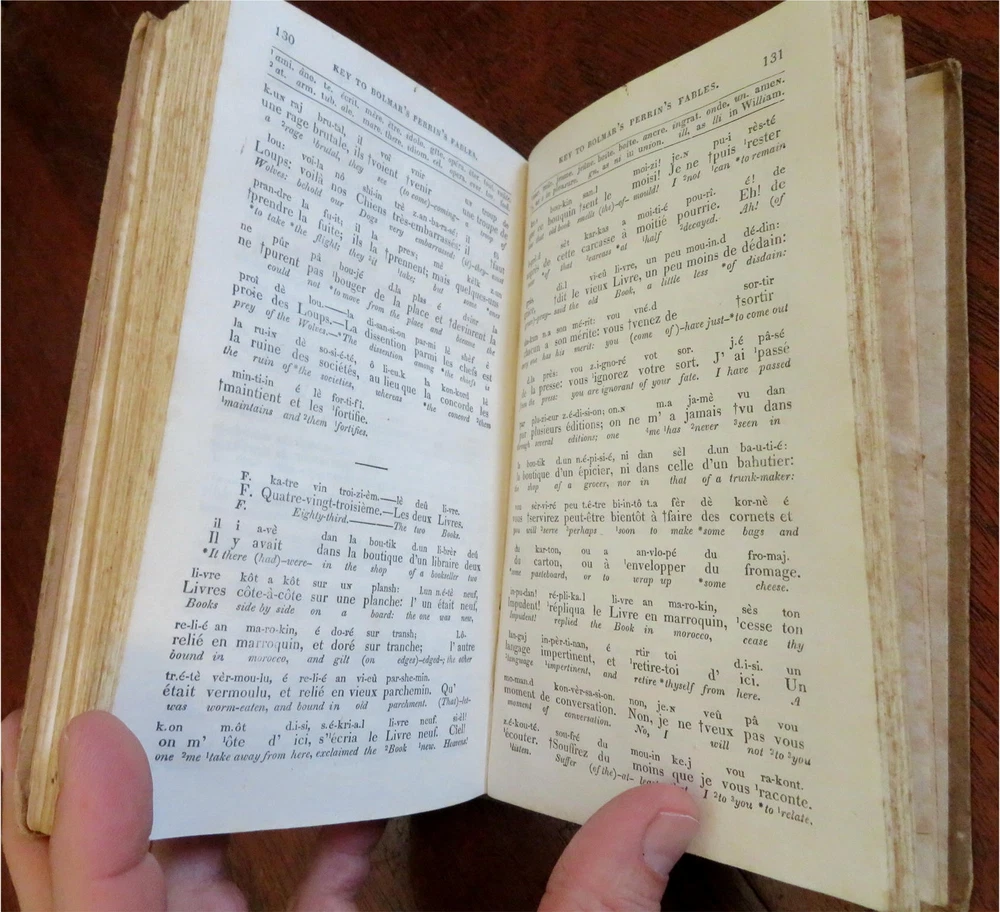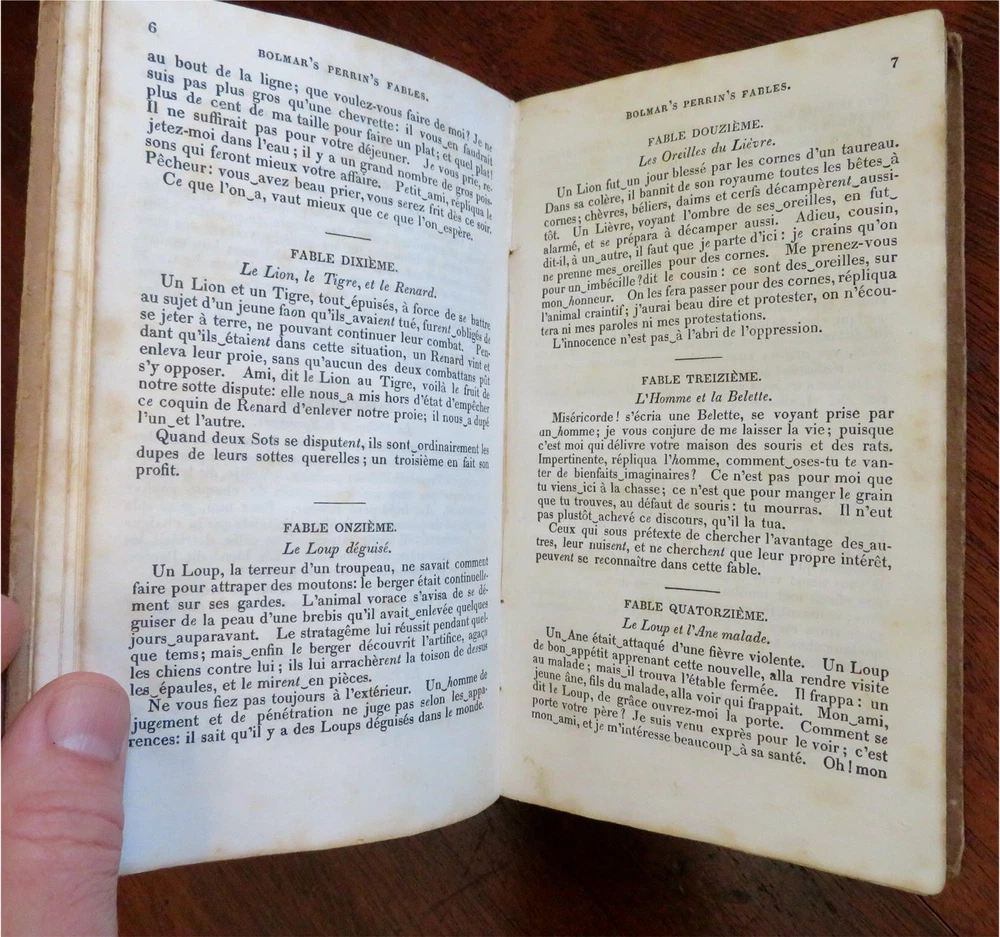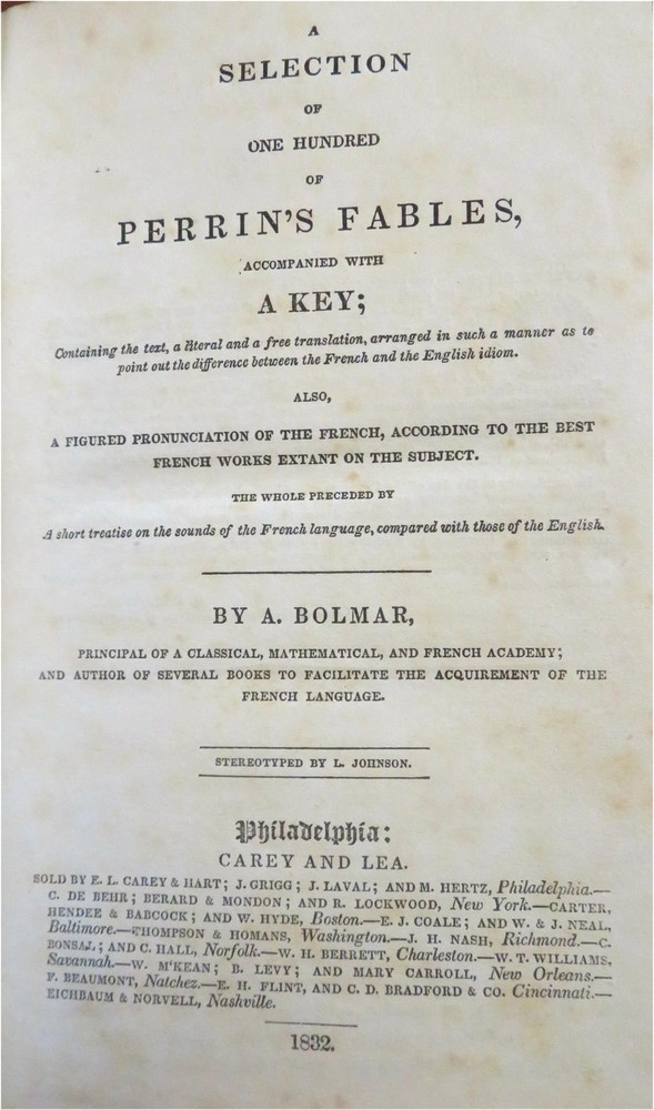 Perrin's Fables 100 French Stories 1832 leather school book reading primer Perrin's Fables 100 French Stories 1832 leather school book reading primer (Old Books, 19th Century Books, Leather Books, Fables, Reading Primer, French Fables). A Selection of One Hundred of Perrin's Fables Accompanied with a Key, by A. Bolmar. Published 1832, Philadelphia by Carey and Lea. 181 pages. Text in English & French. Attractive antiquarian 1/4 leather binding, smooth spine, gilt bands, paper covered boards. Book is physically old and shows some signs of handling and time. Binding gently age worn but still appealing, leather and joints slightly rubbed but still supple, remains overall very attractive as an object. Text block paper is gently age toned as typical, scattered light foxing, one page with blank margin corner torn away, internally book remains mostly clean and sound. A book which has been taken care of but may/ does not look like new. Still attractive on the shelf. Book displays a pleasing and unique age patina and is in rather nice antiquarian condition, any age flaws seem easy to overlook or forgive. Please review photos for more detailed attempt to present this book as it survives. We often over-describe any flaws that many sellers would not even bother to mention since most people would overlook them as minor and unworthy of comment. Many people tell us the books they receive from us are nicer in person than it appears on the screen. We want you to be clear about what you are buying, so we take clear photos and try to describe it clearly. Book Measures c. 7 1/2" H x 4 1/2" W. [B5279].