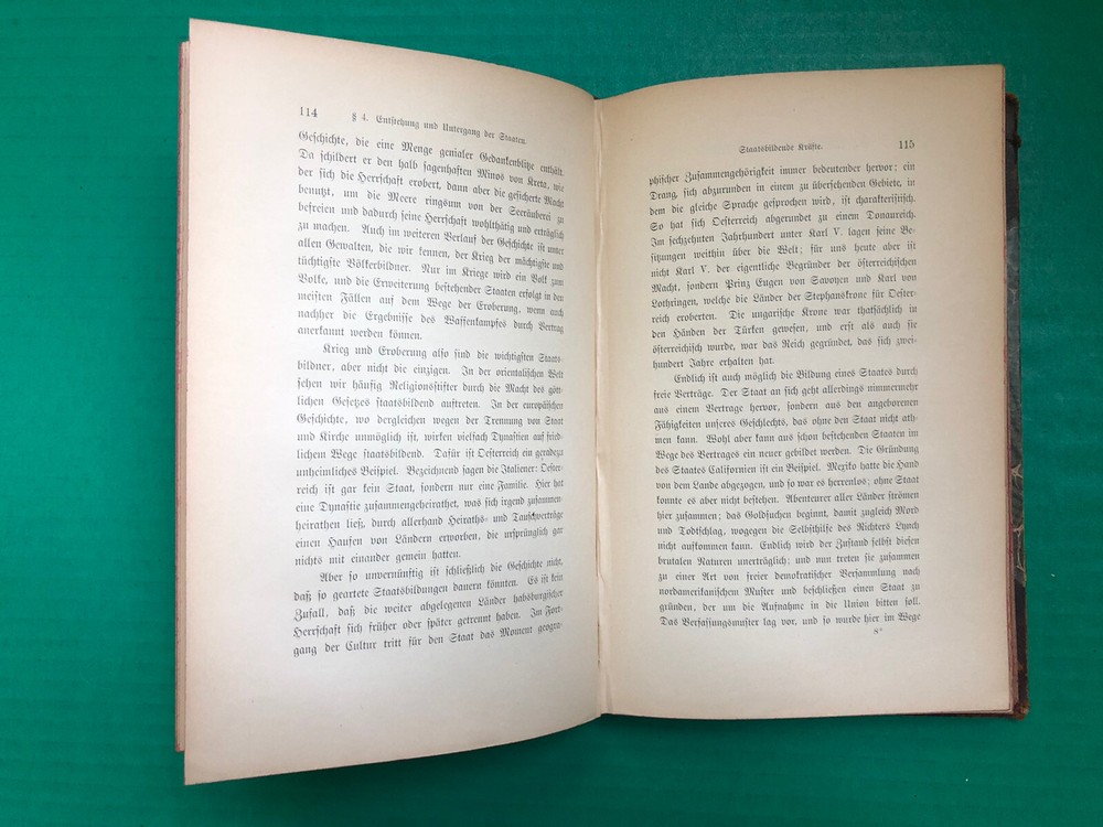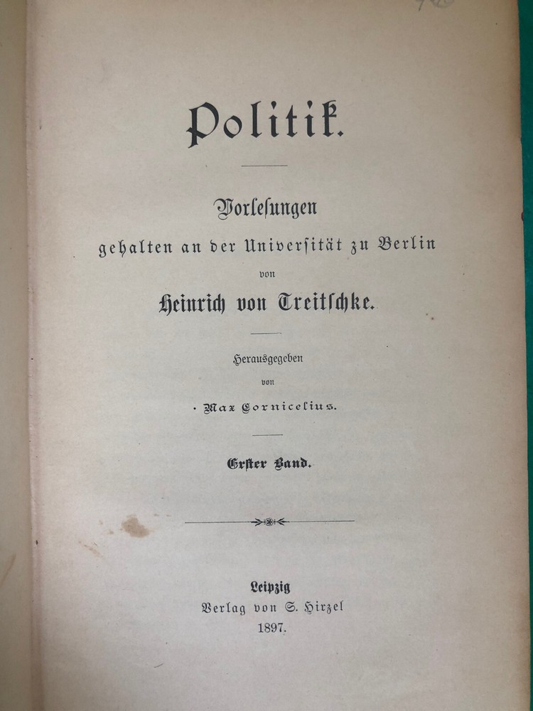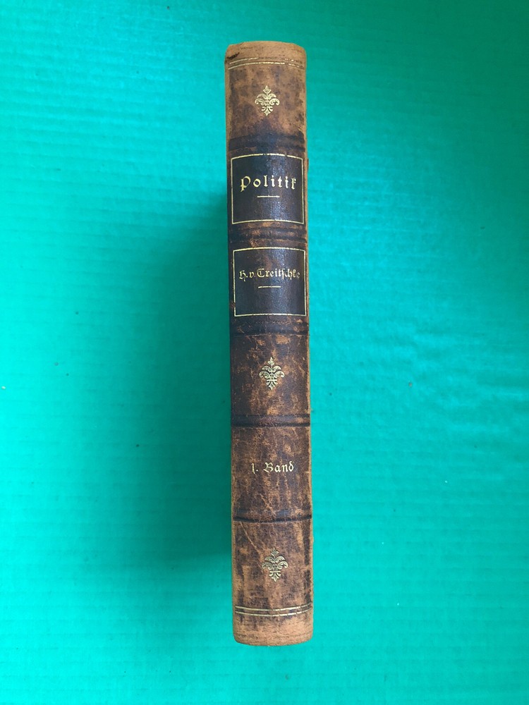 Politik (1897) by Heinrich von Treitschke Volume 1 only, This book is in great condition despite being over a century old., it has no markings, and its major sign of wear is some cracked leather on the front hinge, but this does not affect its ability to open, its binding remains solid and flips nice as well, the red-dyed page ends remain bright. The Leather is worn all over but not to the point of showing the board underneath (except in the very corners) , the endpapers are in great shape and are attached properly.
