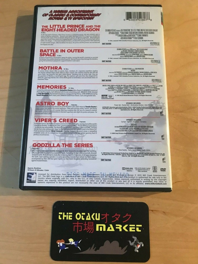 ***Slipcovers are NOT guaranteed, even if shown in the picture(s). This is because we do not consistently receive them ourselves. If you need the slipcover please inquire to confirm before purchasing.*** This item is Brand New and sealed. -------------------------------------------------------------------------------------------------------------------------- Run Time........... 10 hours, 41 minutes Audio................. English Subtitles............. Region Code...... 1 Screen Ratio...... 4:3, full screen -------------------------------------------------------------------------------------------------------------------------- Synopsis: This pop-culture sampler platter offers a unique assortment of classic and contemporary Japanese moves and TV shows, packaged together in one must-have collection! Films: The Little Prince and the Eight-Headed Dragon, Battle in Outer Space, Mothra, Memories. TV Shows: Godzilla (4 episodes), Astro Boy (4 episodes), Viper's Creed (4 episodes) -------------------------------------------------------------------------------------------------------------------------- Shipping: United States Media Mail............. $5.00 / $1.00 as an additional item 1st Class................ $8.00 / $3.00 as an additional item (1st Class maxes out at 16oz) Priority Mail............ $11.00 / $2.00 as an additional item Combined Shipping: United States ***This will not work on a smartphone using eBay's app. If that's your option just add all items using the cart to make 1 invoice and any combined shipping rates will be refund at the time of shipment*** Place items into shopping cart. When done shopping, hover over your shopping cart icon at the top right of the page. Click "view cart" from the dropdown box. Click the "request total" hyperlink located at the top right of the group of items you're buying from me. Click "commit to buy & submit request" You'll receive the final invoice shortly thereafter, typically within 12 hours. ***do note that once you do #5 the quantity chosen is automatically removed from inventory, so there's no fear of someone else getting it before you've paid for it. Combined Shipping: International Combined shipping is available, please ask for a quote as eBay's system will no do it automatically.... Any questions please feel free to ask :^)