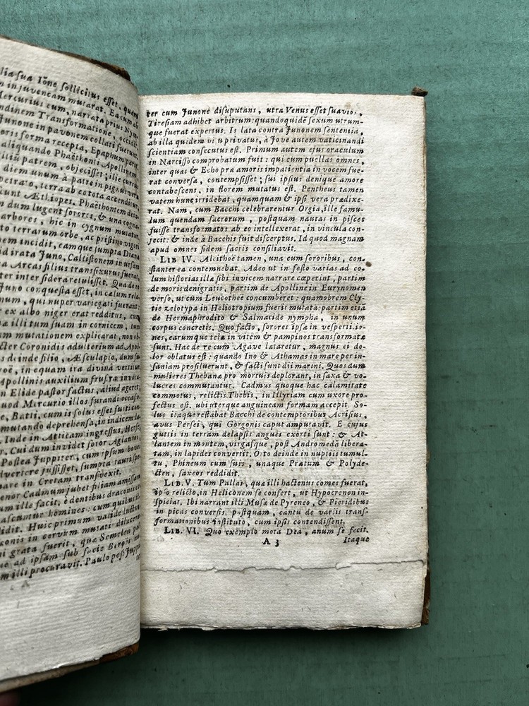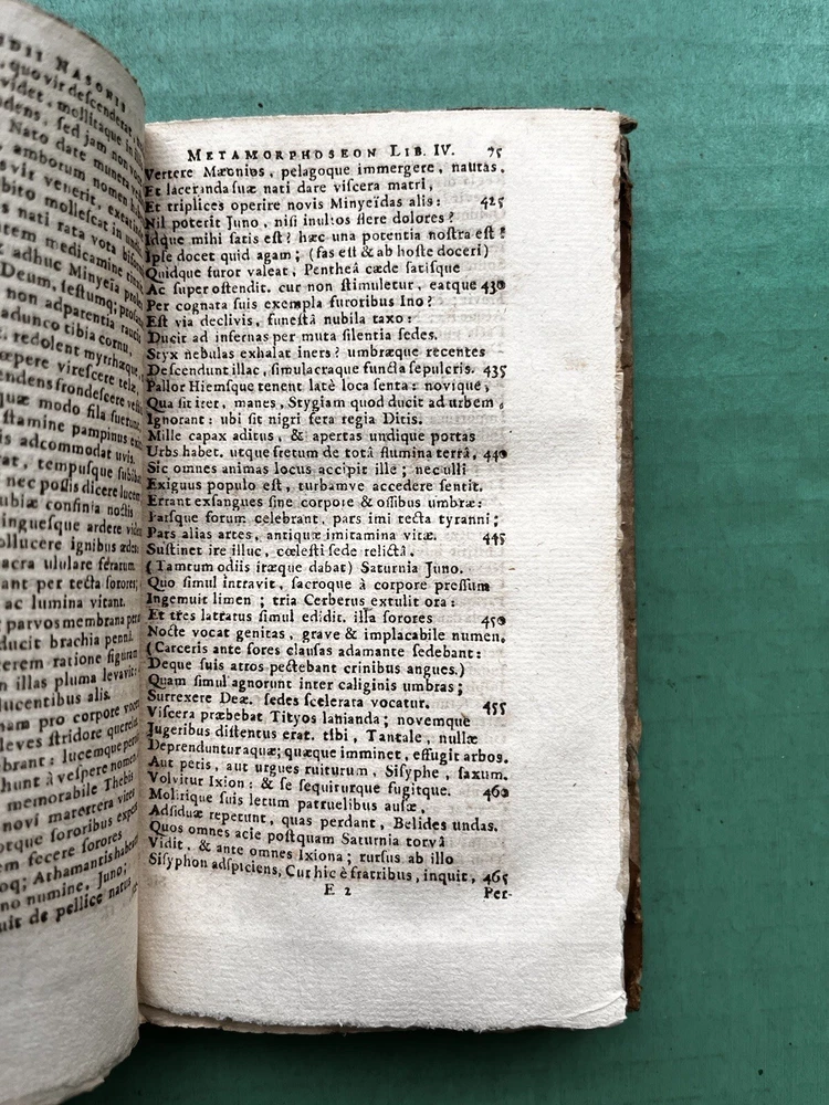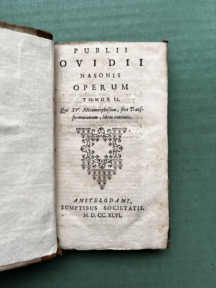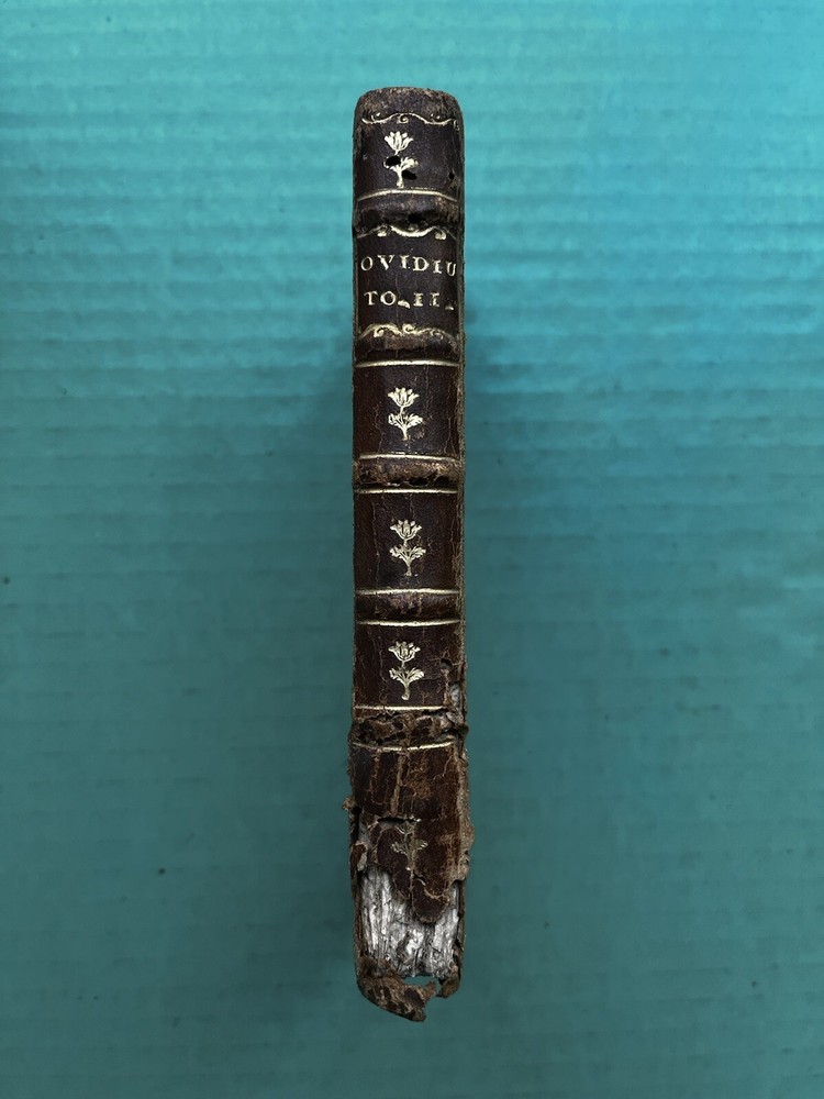 Publii Ovidii Nasonis Operum (1746) by Ovid - Second volume to the Metamorphoses. Original Latin Text, Leather missing on bottom of spine to the book. Boards are in good condition, still attached to text and spine, damage to the fore-edges. Flora still have their color on the boards, a very beautiful touch to this old book. Binding is exposed but minimally damaged from spine damage. Book still flips well and can lay flat in some areas. Termite Tunnels through the spine not found in the text. Printing is very small. Look to the images as the best descriptor, but please inquire for any further details! Shipped with USPS Media Mail