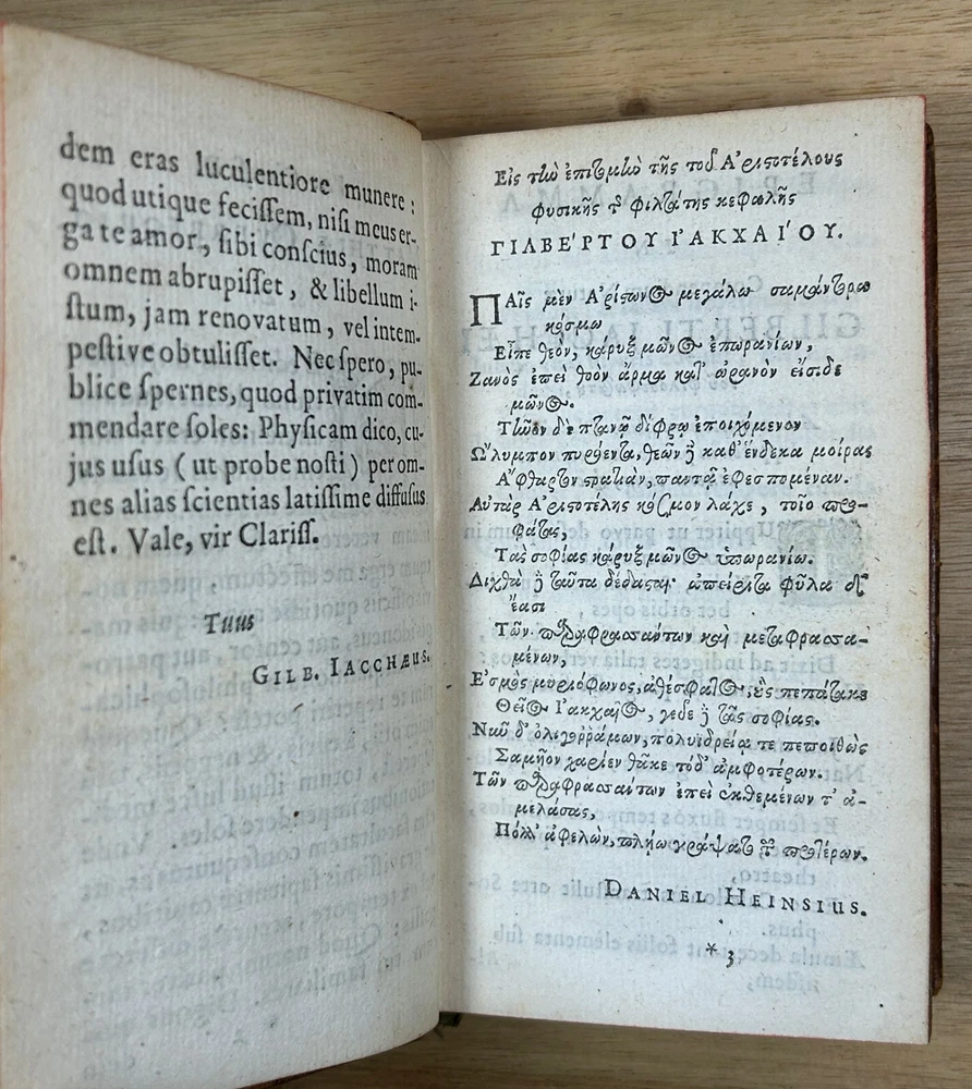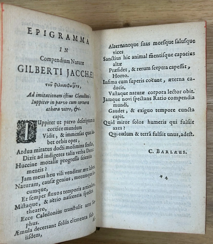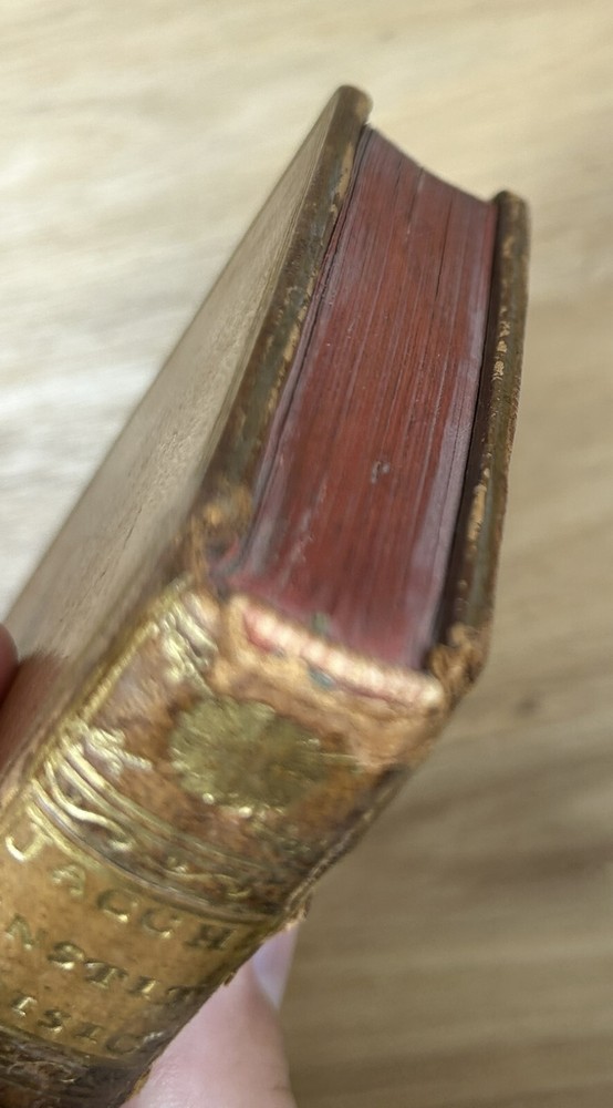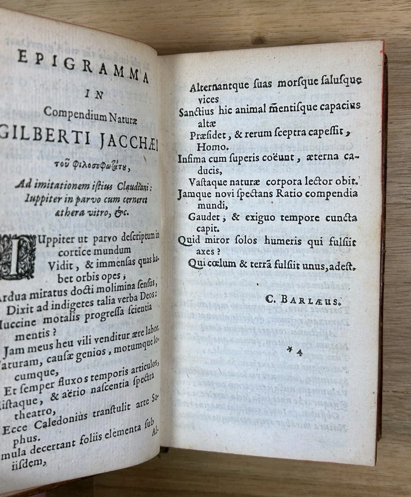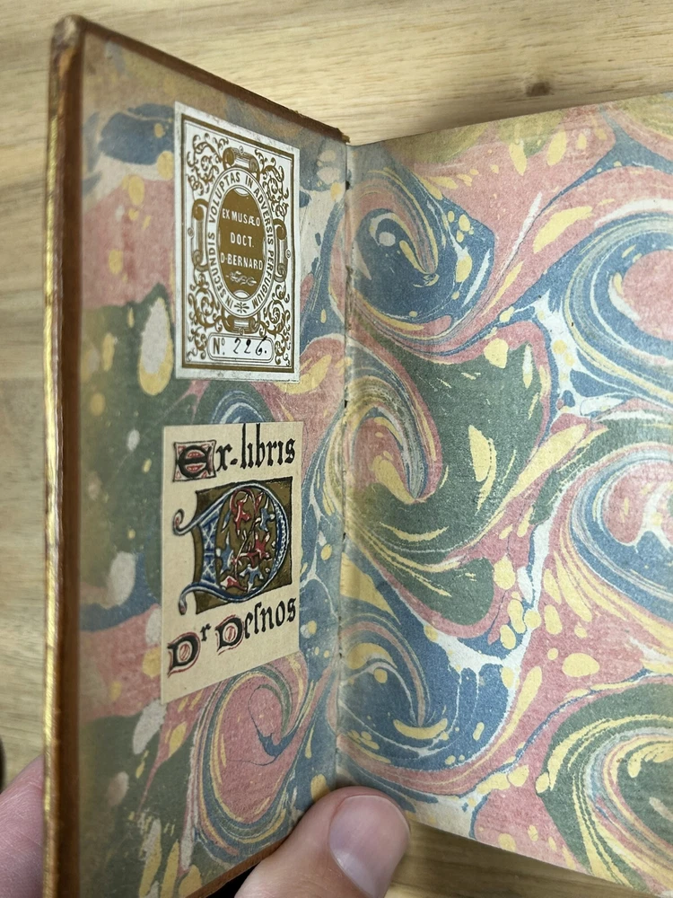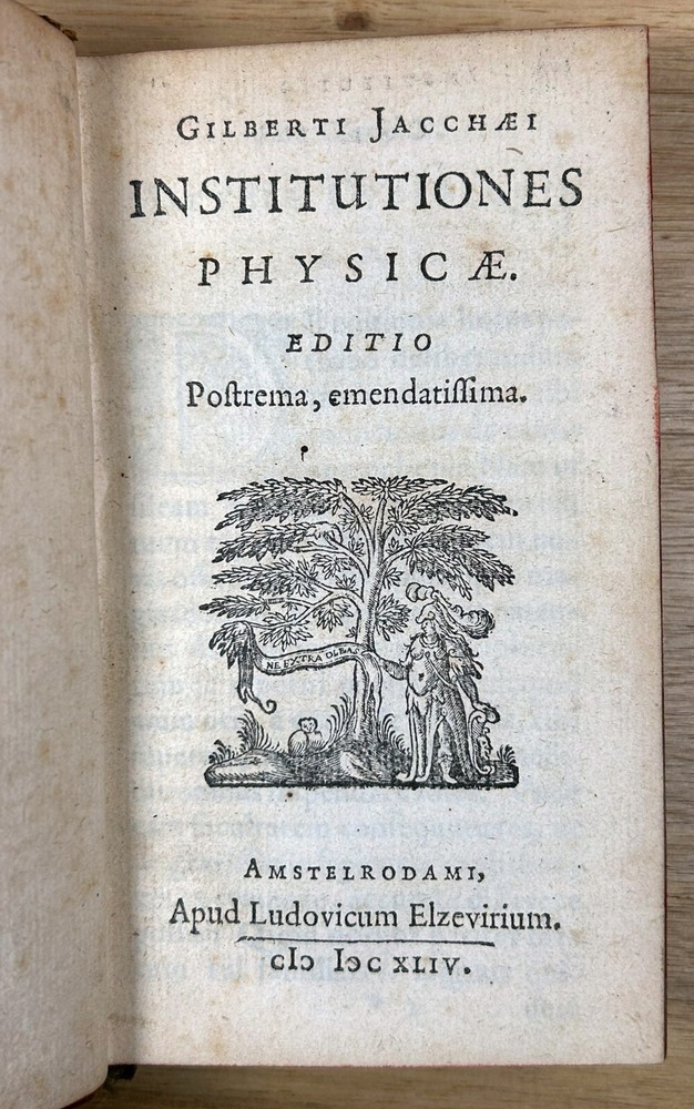Rare 1644 text, "Institutiones Physicae" by Gilbert Jack (aka Gilberti Jacchaei aka Gilbertus Jacchaeus). Mainly Aristotelian in scope, it is divided into nine “books” on natural phenomena, minerals, metals, salts, vacuum, fermentation, fire, etc. Editio Postrema, emendatissima (Final edition, most recently revised). Full leather binding with gilt spine and cover decoration and lettering. Jack (1578?-1628) received his M.D. degree at Leyden in 1611 and became professor of philosophy at Leyden (1604-28). Approximately 3x5". The bookplates are include those of medical doctor Dr. Ernest Desnos (1825-1852) and Dr. Tibulle Desbarreaux-Bernard (1798-1880, born Tibulle Pellet Desbarreaux in Toulouse) the son of Hyacinthe Pellet, a mayor of Toulouse. Desbarreaux-Bernard amassed a huge book collection most of which was purchased by the library of Toulouse. His bookplate is featured in some important collections of bookplates. Very good. Minor wear to leather, gilt decoration and lettering on spine and covers in good shape overall. Leather just starting to crack along front hinge, but holding up well. Binding is tight.A couple gouge marks on front, but they may be original to the leather (note that gilt border appears to overly gouge on bottom). Minor wear to corners. Two personal bookplates inside front cover. Interior very good, with generally crisp, bright pages (maybe very slight browning toward edges and light foxing to title page). See photos.