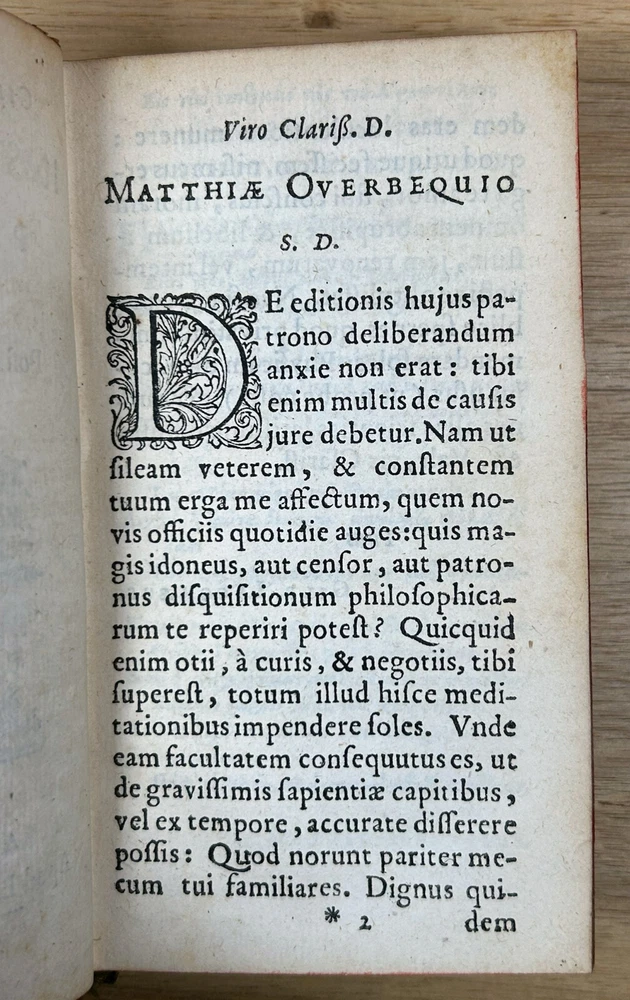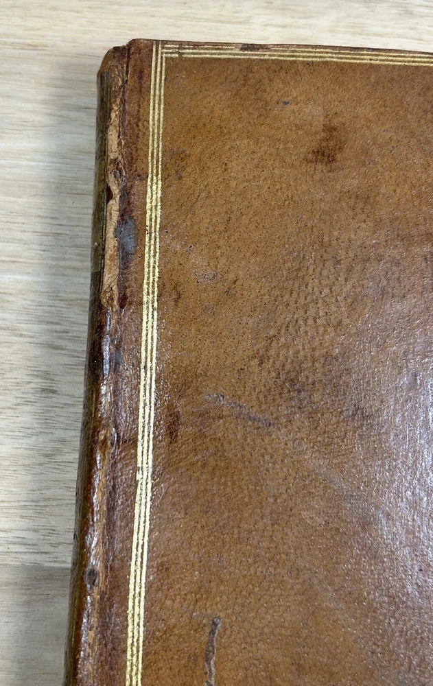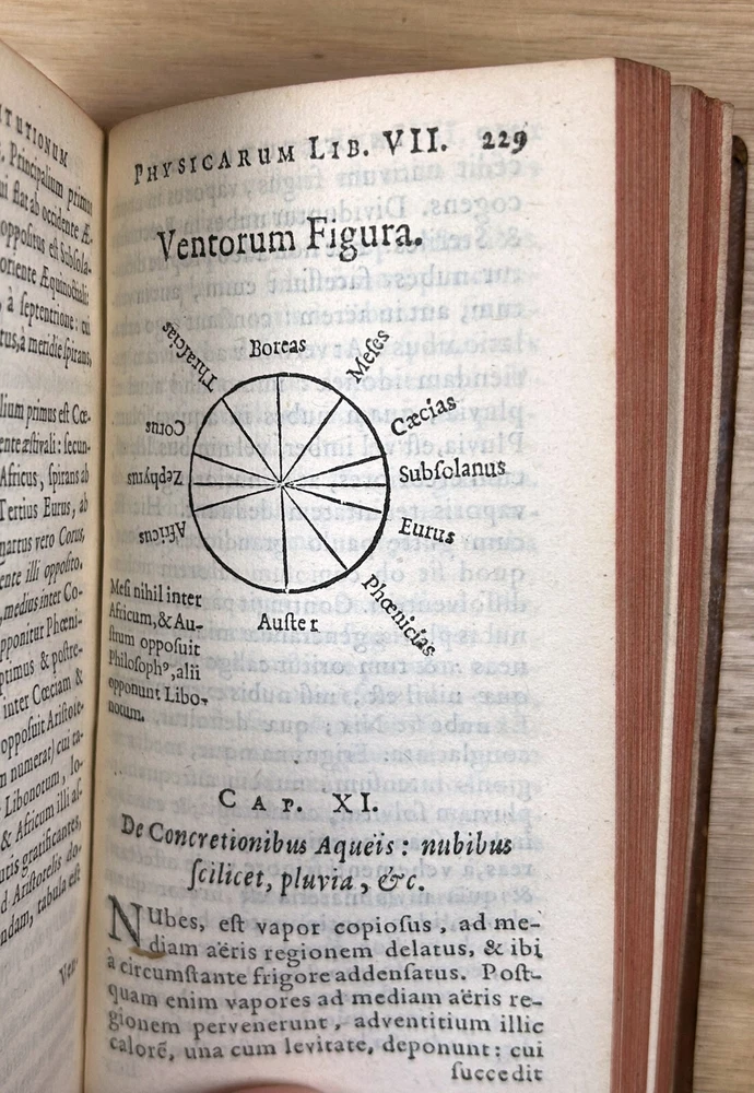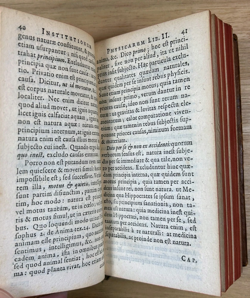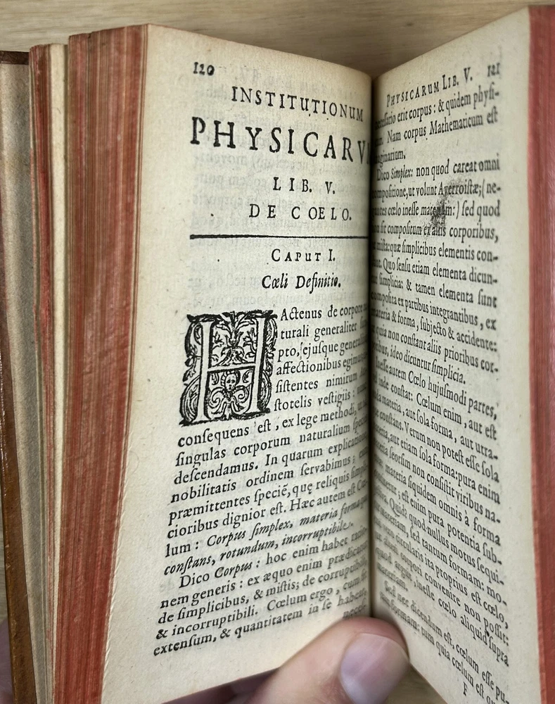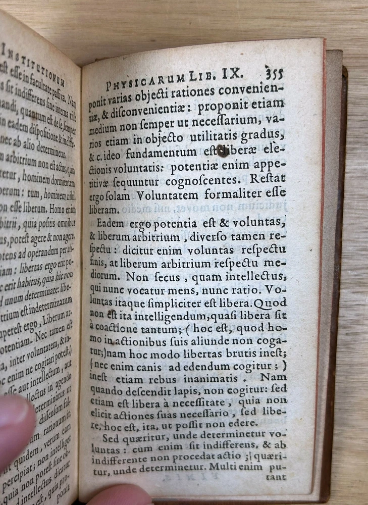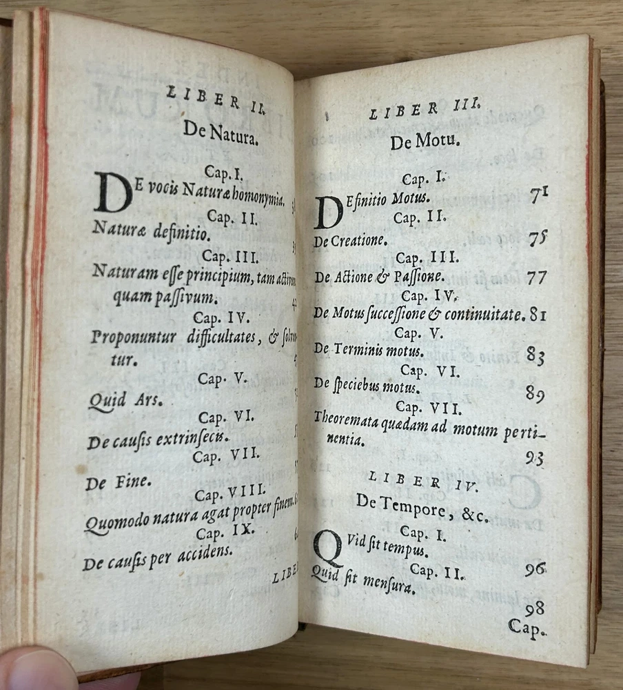 Rare 1644 text, "Institutiones Physicae" by Gilbert Jack (aka Gilberti Jacchaei aka Gilbertus Jacchaeus). Mainly Aristotelian in scope, it is divided into nine “books” on natural phenomena, minerals, metals, salts, vacuum, fermentation, fire, etc. Editio Postrema, emendatissima (Final edition, most recently revised). Full leather binding with gilt spine and cover decoration and lettering. Jack (1578?-1628) received his M.D. degree at Leyden in 1611 and became professor of philosophy at Leyden (1604-28). Approximately 3x5". The bookplates are include those of medical doctor Dr. Ernest Desnos (1825-1852) and Dr. Tibulle Desbarreaux-Bernard (1798-1880, born Tibulle Pellet Desbarreaux in Toulouse) the son of Hyacinthe Pellet, a mayor of Toulouse. Desbarreaux-Bernard amassed a huge book collection most of which was purchased by the library of Toulouse. His bookplate is featured in some important collections of bookplates. Very good. Minor wear to leather, gilt decoration and lettering on spine and covers in good shape overall. Leather just starting to crack along front hinge, but holding up well. Binding is tight.A couple gouge marks on front, but they may be original to the leather (note that gilt border appears to overly gouge on bottom). Minor wear to corners. Two personal bookplates inside front cover. Interior very good, with generally crisp, bright pages (maybe very slight browning toward edges and light foxing to title page). See photos.