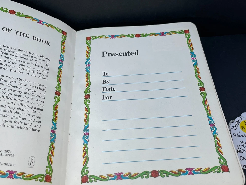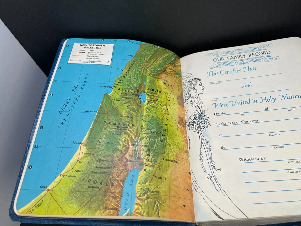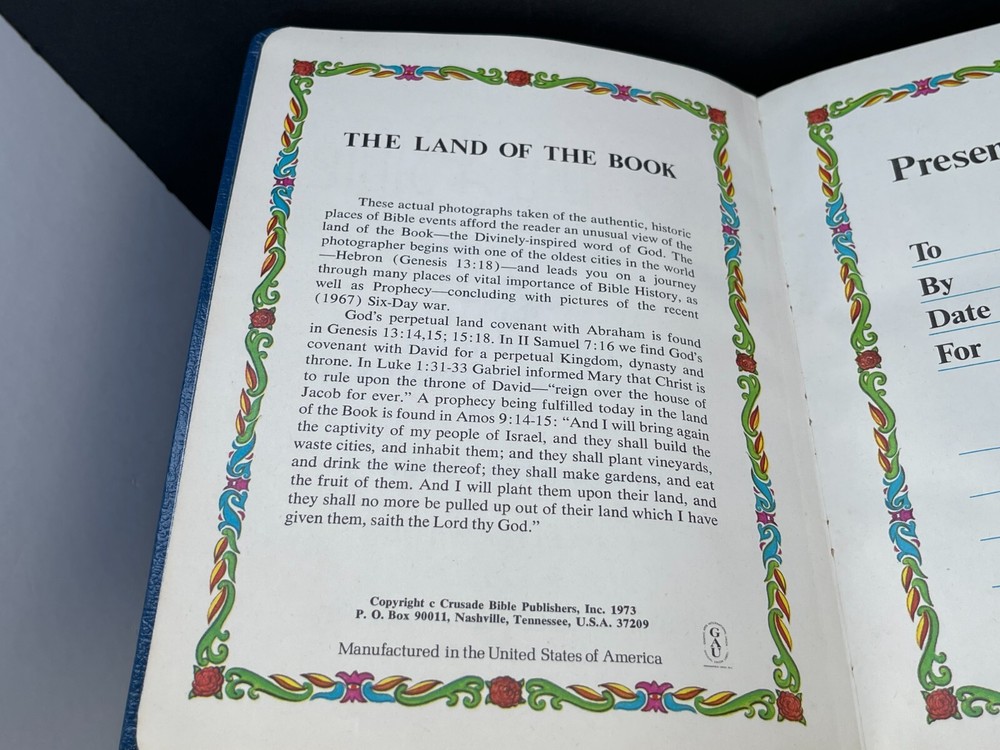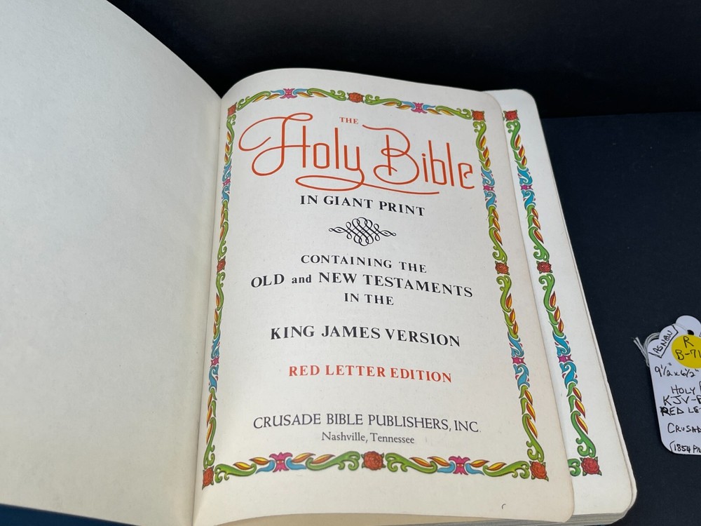 ONE(1) USED VINTAGE 1973 HOLY BIBLE WITH NEW AND OLD TESTAMENTS, IN GIANT PRINT, RED LETTER EDITION, KING JAMES VERSION, IN BLUE LEATHER COVER, INCLUDING MAPS, PUBLISHED BY CRUSADE BIBLE PUBLISHERS NASHVILLE, TN, USA. THIS BIBLE IS IN AS NEW CONDITION, A GREAT FIND FOR A 1973 BIBLE!!!! PLEASE CHECK OUT MY OTHER SALES, AS I AM SELLING OFF A LARGE BIBLE/ RELIGIOUS PRAYER BOOK COLLECTION!!! I WILL BE ADDING MORE BIBLES UNTIL THE ENTIRE COLLECTION IS POSTED!!! Please see the pictures as completion of the description. We will only accept a return if you did not get the pictured item, or our description is incorrect. PLEASE ASK QUESTIONS BEFORE YOU MAKE A PURCHASE, I REPLY QUICKLY!!! Buy with Confidence, you will get the exact item you see in the sale, and if you have any issues, just check my feedback and rest assured you are purchasing from a long time (25+ years), 100% perfect record EBAY'er. The 1973 CRUSADE PUBLISHING KJV HOLY BIBLE will be well packed and shipped within 1 business days of payment! GOOD LUCK BUYERS!!!