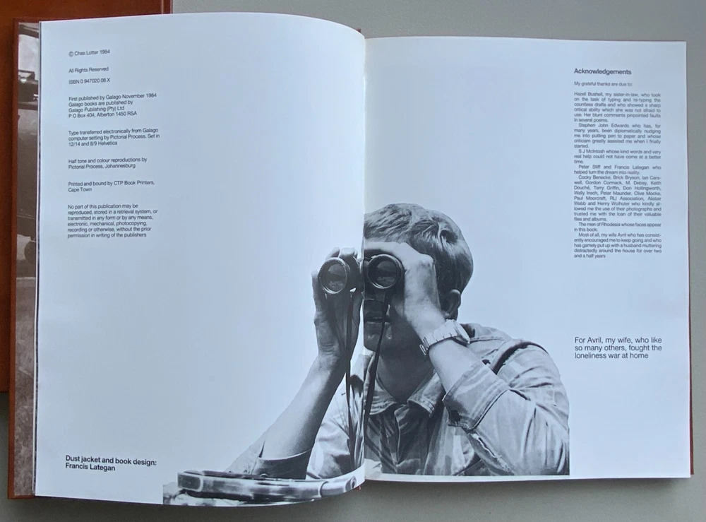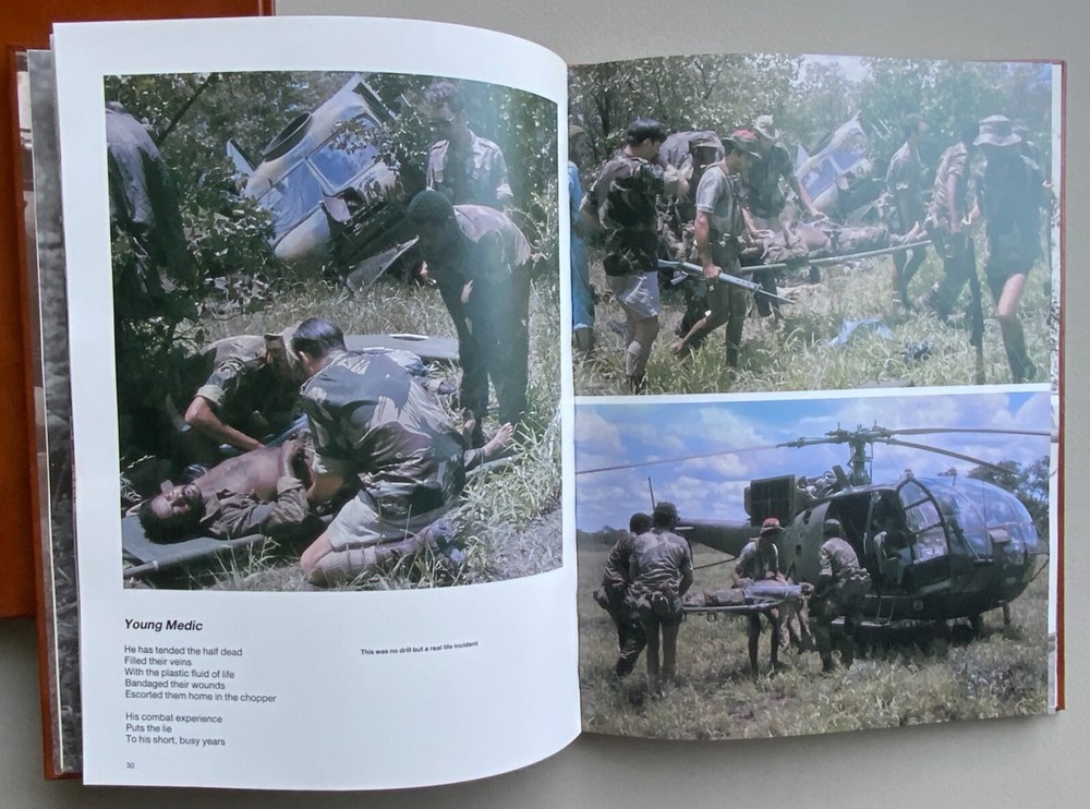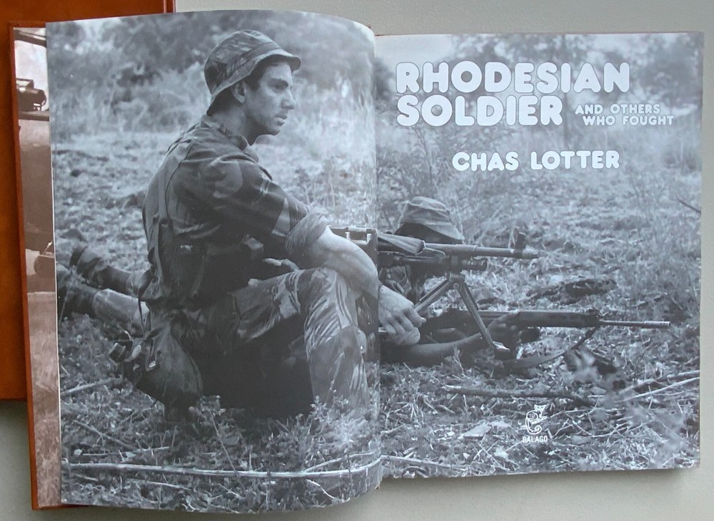 1984 publication, RHODESIAN SOLDIER, leather bound with a cardboard slip cover, and 111 pages. The book is in very clean condition but it does have one scuff mark on the left side of the book cover that can be seen in the photo.