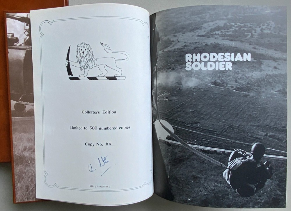 1984 publication, RHODESIAN SOLDIER, leather bound with a cardboard slip cover, and 111 pages. The book is in very clean condition but it does have one scuff mark on the left side of the book cover th...