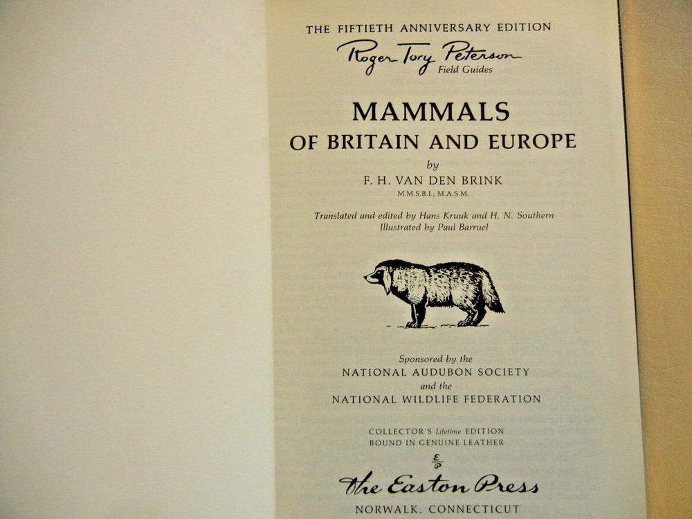 UP FOR AUCTION; ROGER TONY PETERSON - FIELD GUIDES , THE EASTON PRESS BOOK" MAMMALS OF BRITAIN AND EUROPE " 222 pages FIFTIETH ANNIVERSARY EDITION IN LIKE NEW CONDITION , UNREAD COPY FULL-GRAIN PREMIUM LEATHER COVER GOLD GILDED PAGES ENDS SATIN RIBBON PAGE MARKER THREAD SEWN PAGES HIGH QUALITY ACID-NEUTRAL PAPER FOR INTERNATIONAL SHIPPING COST EMAIL US WITH YOUR ADDRESS FOR SHIPPING COST NOTE; due to a 20 miles trip to the post office , shipping is done only once a week WE WILL COMBINE SHIPPING - NO RESERVE - LOW STARTING PRICE SHIPPING COST LIST ABOVE IS FOR THE LOWER 48 STATES IN THE U.S. AND FOR THE PROVINCES OF ONTARIO & QUEBEC IN CANADA ALL OTHER EMAL US FOR SHIPPING COST.. ALL POSITIVE FEEDBACK LEFT AFTER TRANSACTION WILL BE APPRECIATED AND RECIPROCATED..