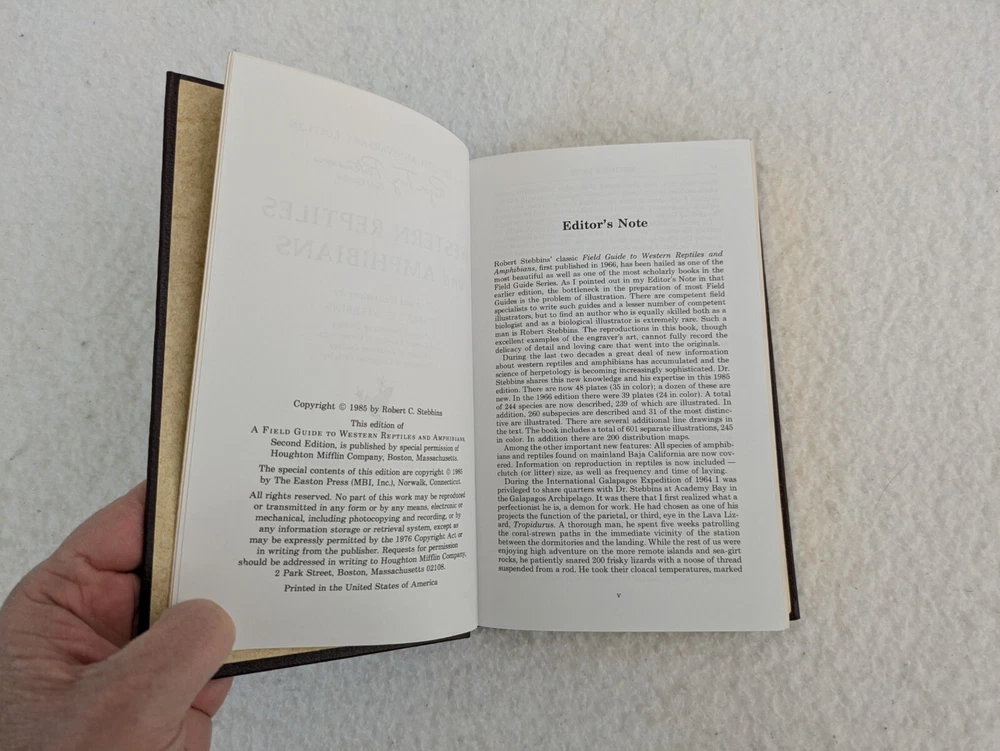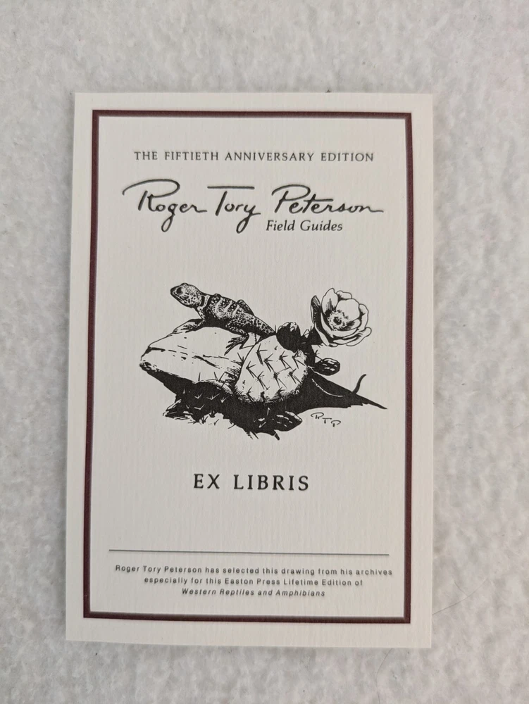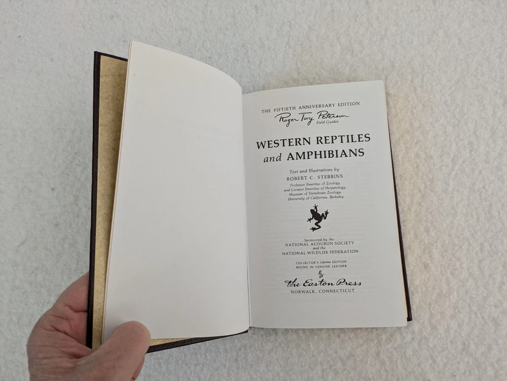 The Fiftieth Anniversary Edition ROGER TORY PETERSON FIELD GUIDES WESTERN REPTILES AND AMPHIBIANS Text and Illustrations by Robert C. Stebbins The Easton Press, 1985 A Leather Guide in Very Good Condition. Light shelfwear. No markings. Unattached and unused bookplate inside. Please examine photos for details. Condition: We strive to describe and photograph the condition of every item as accurately as possible. Photos are of the actual item that is being sold. Please examine the photos carefully for any condition details and possible flaws. Best Offers: Items are available for offers only after being listed for 30 days. We consider all offers in relation to current market values. We try to respond almost immediately to most offers. Most of our counteroffers are firm but we are open to bargaining. Shipping for US Customers: We combine shipping. When ordering multiple items from us please request a total before paying. We charge postage based on weight plus $1 for each eBay listing. All of our orders are packed carefully to prevent damage during shipment. We ship most of our items within 24 hours. Shipping for International Customers: All international orders are shipped via Ebay's Global Shipping Program. IF AN INTERNATIONAL CUSTOMER IS INTERESTED IN ORDERING MORE THAN ONE ITEM please do not Buy It Now or use the Make An Offer option on the listing. Rather message us first with a list of the items desired along with any offers. After we agree on prices we will combine all the orders into a single listing at the agreed upon total price. This will save you significantly on the cost of shipping. Contact Us: We are available 7 days a week and are happy to answer any questions you may have.