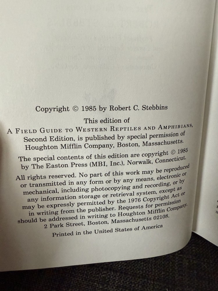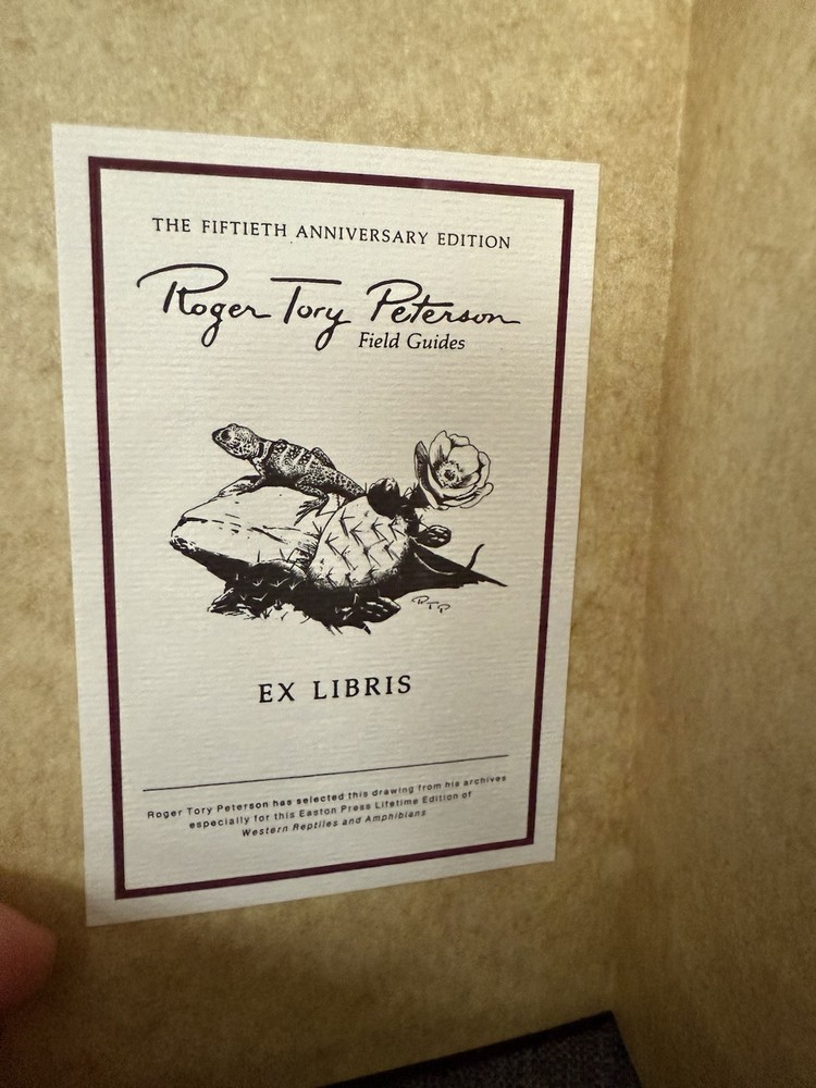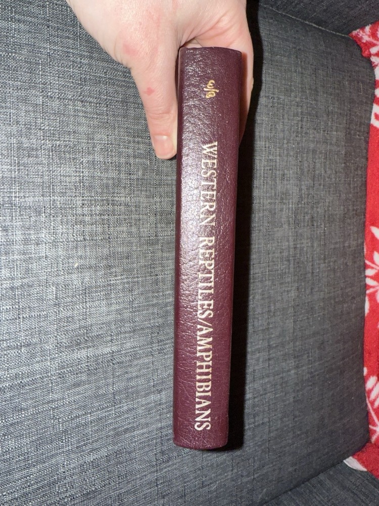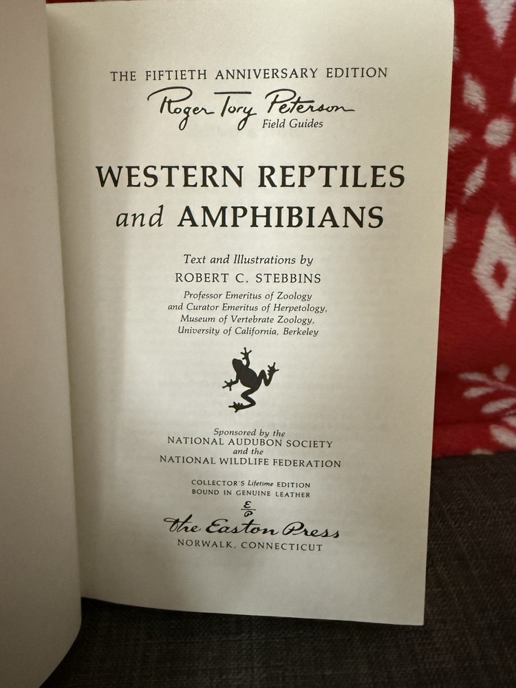The product is a leather-bound Easton Press edition of "ROGER TORY PETERSON FIELD GUIDES WESTERN REPTILES AMPHIBIANS" by Robert C. Stebbins, published in 1985 in Norwalk, Connecticut. This illustrated field guide focuses on North American reptiles and amphibians, specifically those found in the western region. It is written in English and serves as a valuable resource for nature enthusiasts and outdoor adventurers interested in the flora and fauna of the region. The book is part of the Easton Press 50th Anniversary collection, making it a collectible item for those interested in nature, wildlife, and field guides.