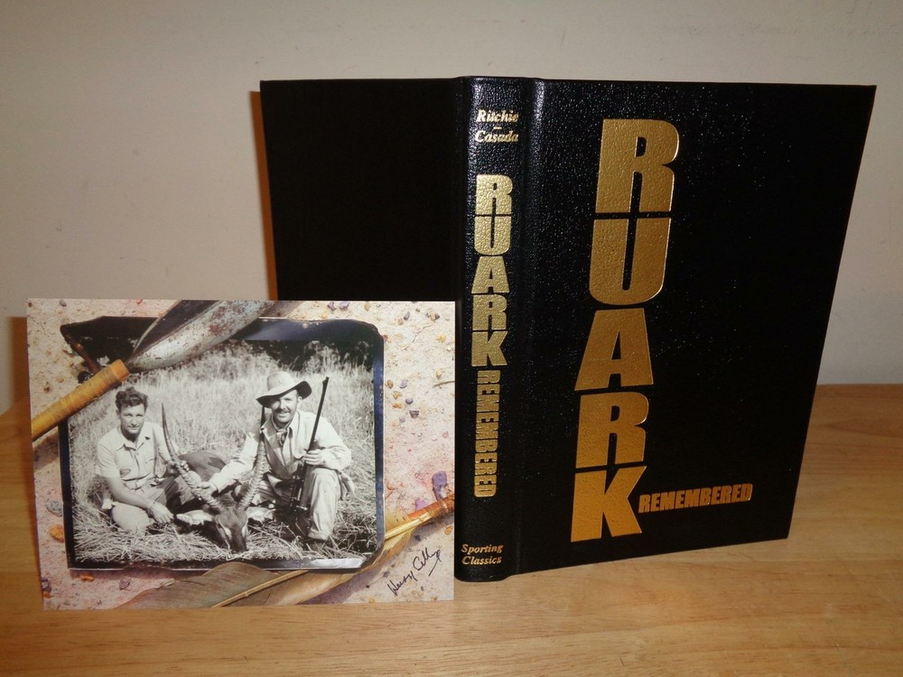 RUARK REMEMBERED Alan Riche SPORTING CLASSICS limited edition LEATHER signed RUARK REMEMBERED Alan Riche SPORTING CLASSICS limited edition LEATHER signed Click images to enlarge Description ROBERT RUARK REMEMBERED by Alan Ritchie and edited by Jim Casada was published by the SPORTING CLASSICS in 2006. ******************************************* This LIMITED EDITION title is bound in genuine LEATHER, with hubbed spines accented with precious 22kt gold, printed archival acid neutral pages that are thread-sewn, not just glued and a satin ribbon marker. ROBERT RUARK REMEMBERED is a biography of Robert Ruark by Alan Ritchie, an Englishman, who assisted as Ruark's personal secretary and adviser for the last fourteen years of his life. Clearly comsumed with grief when Ruark died in 1965, Ritchie penned this manuscript in 1967. The manuscript laid lost over the years until it was rediscovered in 2006 in Palamos, Spain and subsequently published by the "Sporting Classics". ********************************** ** Illustrated throughout with numerous black and white and color photographs from the author's collection (many never before in print). *************************** Beautiful BLACK leather binding ************************** THE BOOK AND SLIPCASE ARE IN VERY FINE CONDITION. ************************* LIMITED EDITION OF #747/750 COPIES. A PHOTO OF ROBERT RUARK AND PROFESSIONAL HUNTER HARRY SELBY IS HAND SIGNED BY HARRY SELBY (LAID IN). ************************** -7 1/4"by 10 1/4" -foreward by professional hunter Harry Selby. -edited by Jim Casada -274 pages. ************************************** Often called the Poor Man's Hemingway, Robert Ruark ranks, in the minds of the most discerning readers, as one of the finest outdoor writer ever to grace the American literary scene. Though it covers all of Ruark's life, the book focuses primarily on his life from 1953 to 1965, at the height of his career. Ritchie understood the troubled, talented writer and in this book he leaves us a deeply moving, insightful record of his employer, enjoy. ************************* Note: any glare is from my camera, not the book. Images sell! Get Supersized Images & Free Image Hosting Create your brand with Auctiva's Customizable Templates. Attention Sellers - Get Templates Image Hosting, Scheduling at Auctiva.com. Track Page Views With Auctiva's FREE Counter